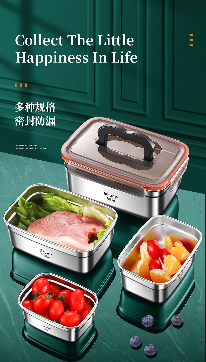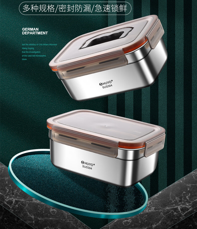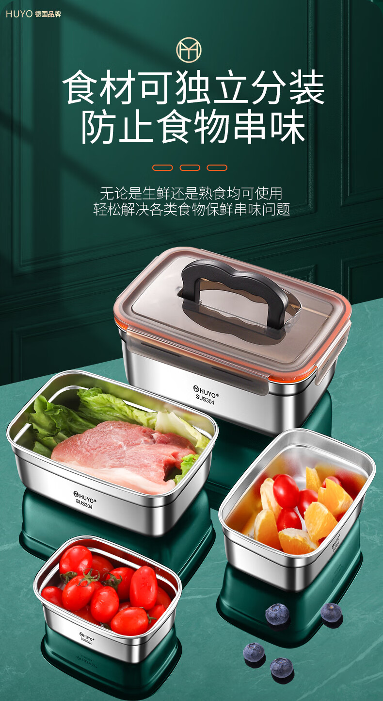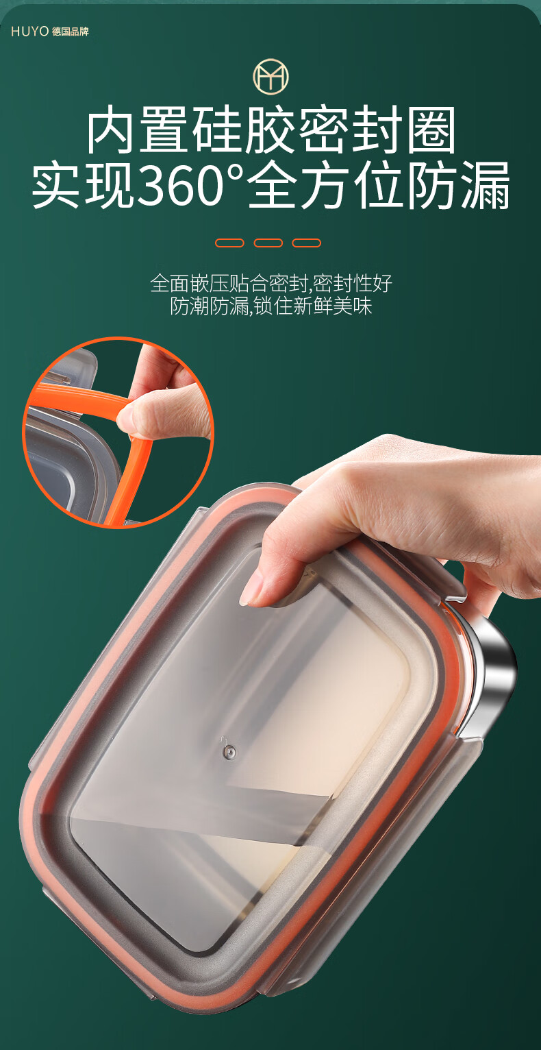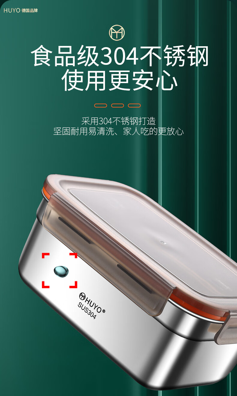 HUYO304 stainless steel lunch box sealed large capacity lunch box with rice food grade refrigerator storage box fruit crisper 2 food grade 304 thick steel 1100ml