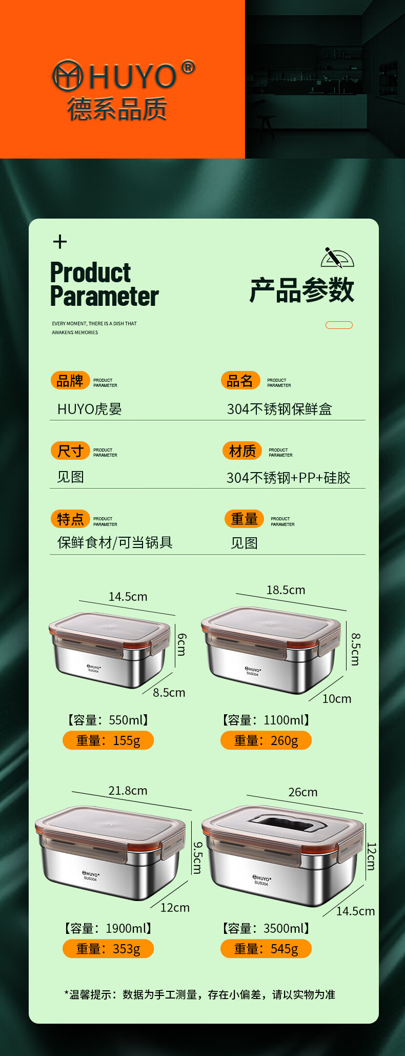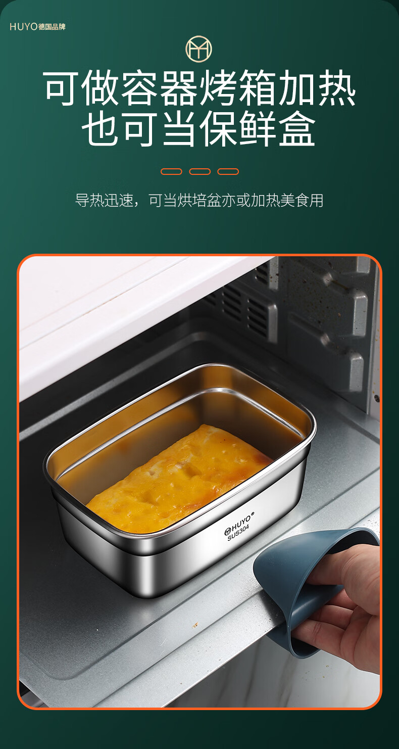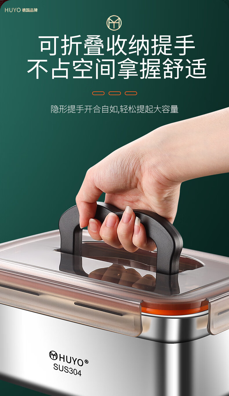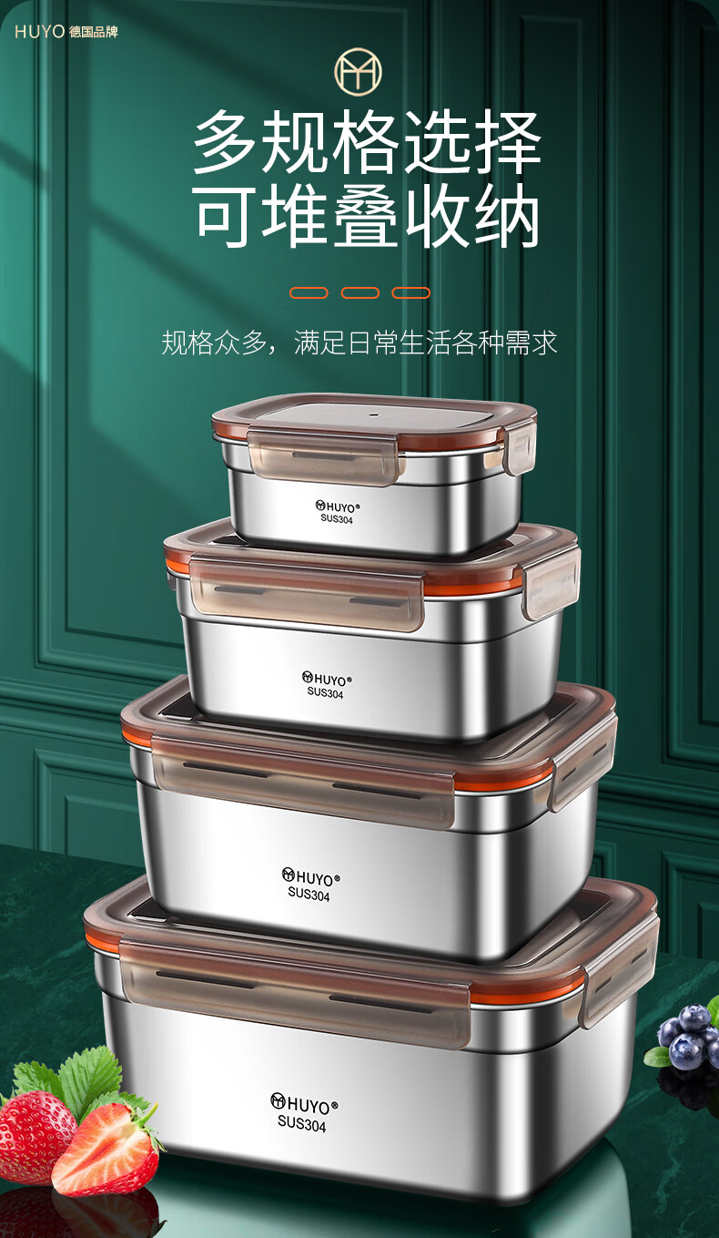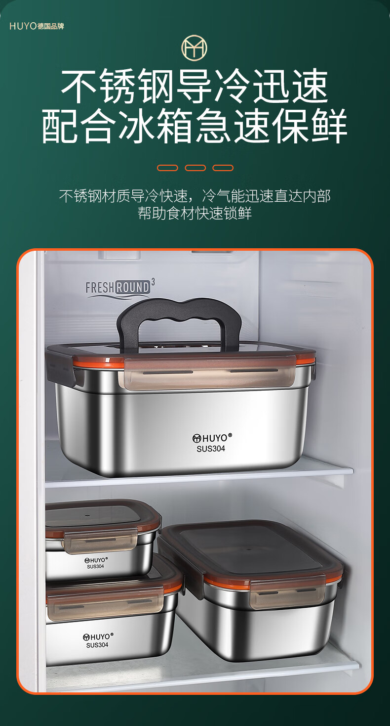 HUYO304 stainless steel lunch box sealed large capacity lunch box with rice food grade refrigerator storage box fruit crisper 2 food grade 304 thick steel 1100ml