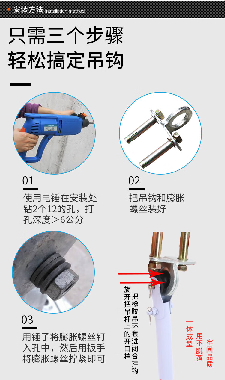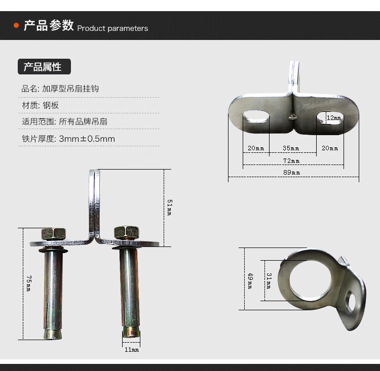 Dixin ceiling fan hook grab hook load-bearing hook reinforced wall iron hook fixed hook floor chandelier fan installation hook hook with expansion screw 10*80 (one hundred sets)