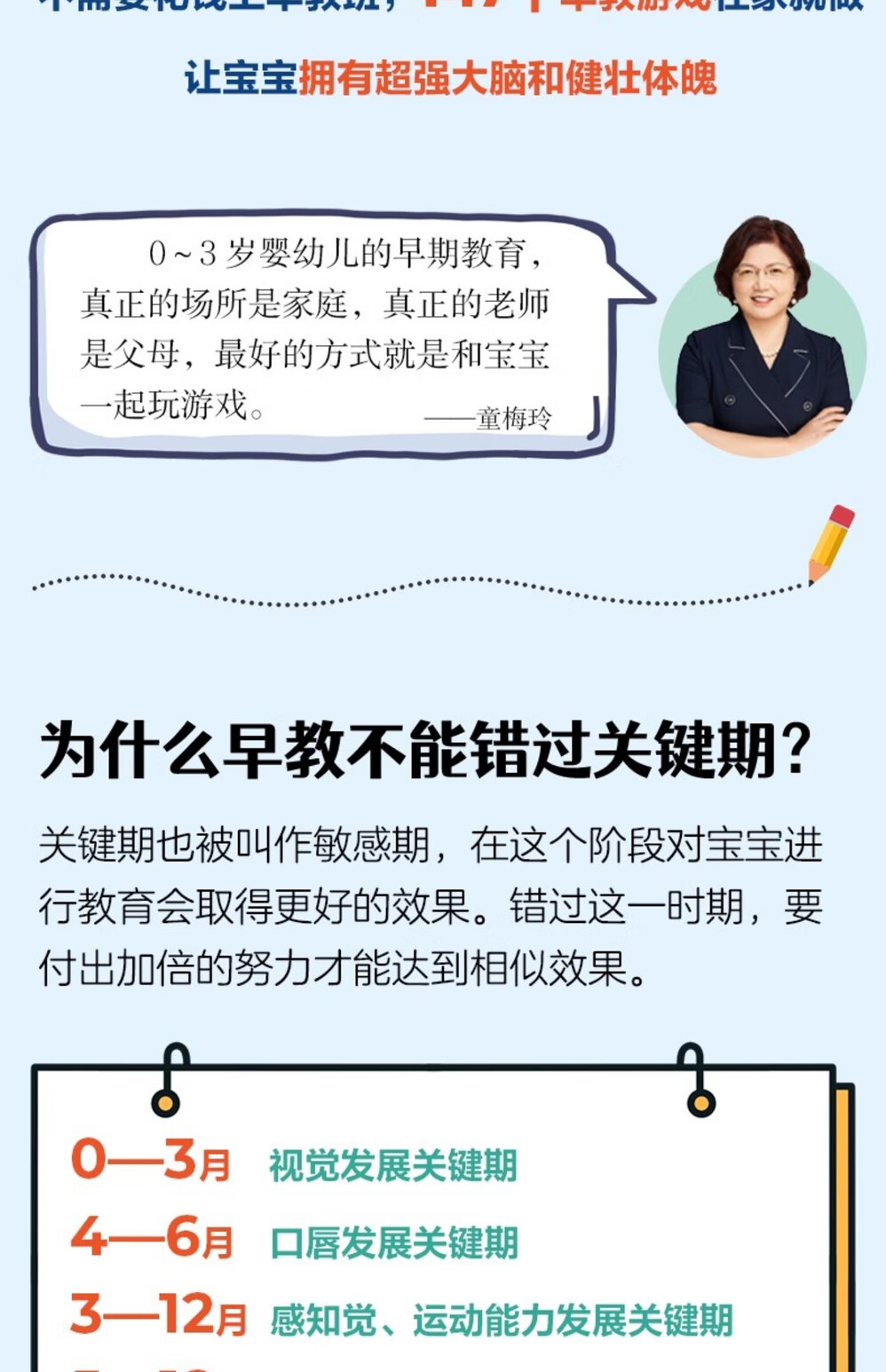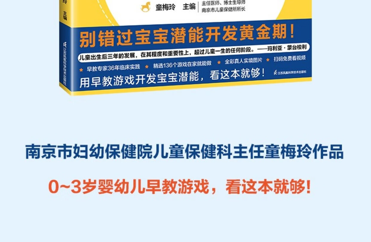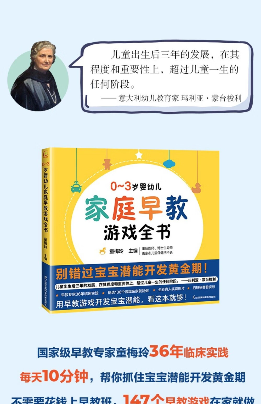 A complete book of family early education games for infants and young children aged 0-3, edited by Tong Meiling. The golden period of baby potential development. Scan the QR code to watch the video. A complete book of family early education games for infants and young children aged 0-3. Jiangsu Phoenix Science and Technology Press. Compiled by Tong Meiling, a complete book of family early education games for infants and young children aged 0-3. Tong Meiling, a home-level early childhood education expert.