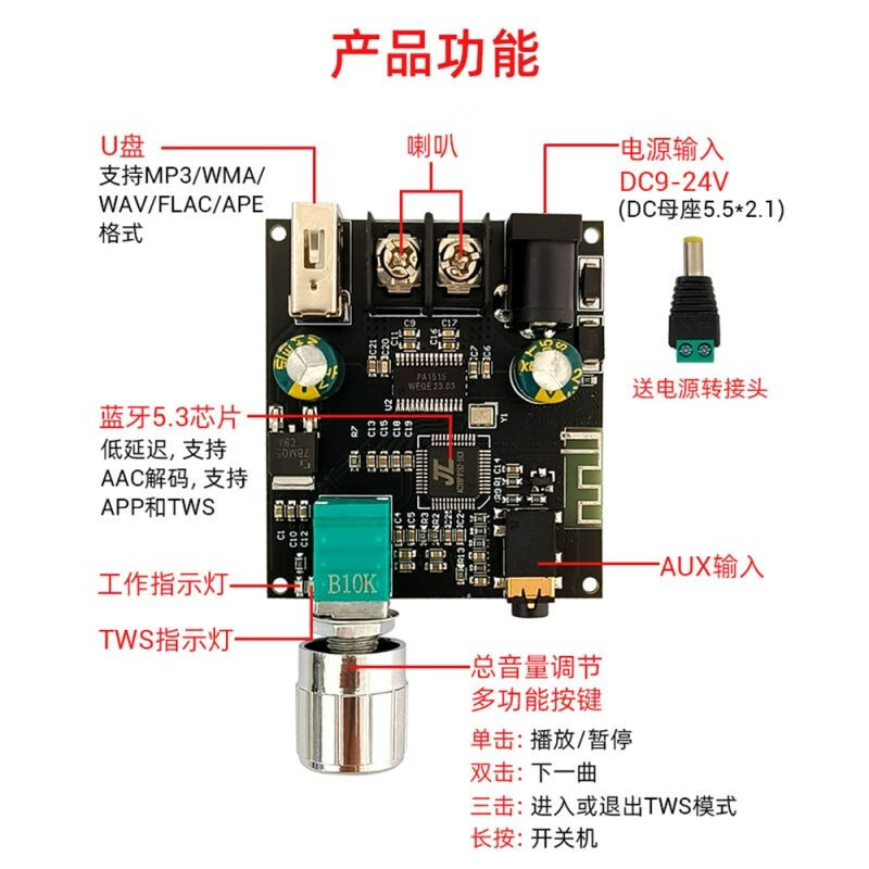 DIYMOREZK-301B mono 30W Bluetooth 5.3 power amplifier board module audio with true wireless TWS left and right channel pairing box