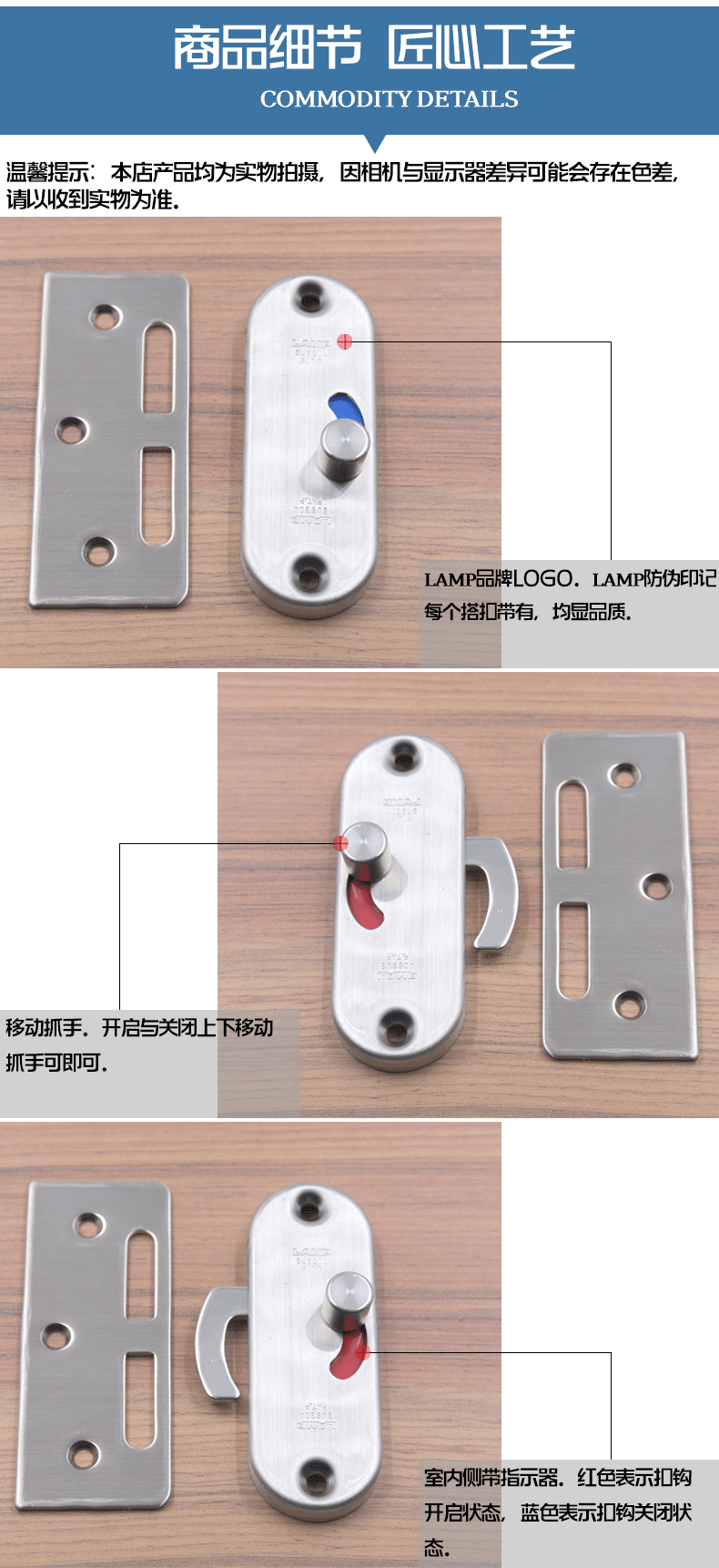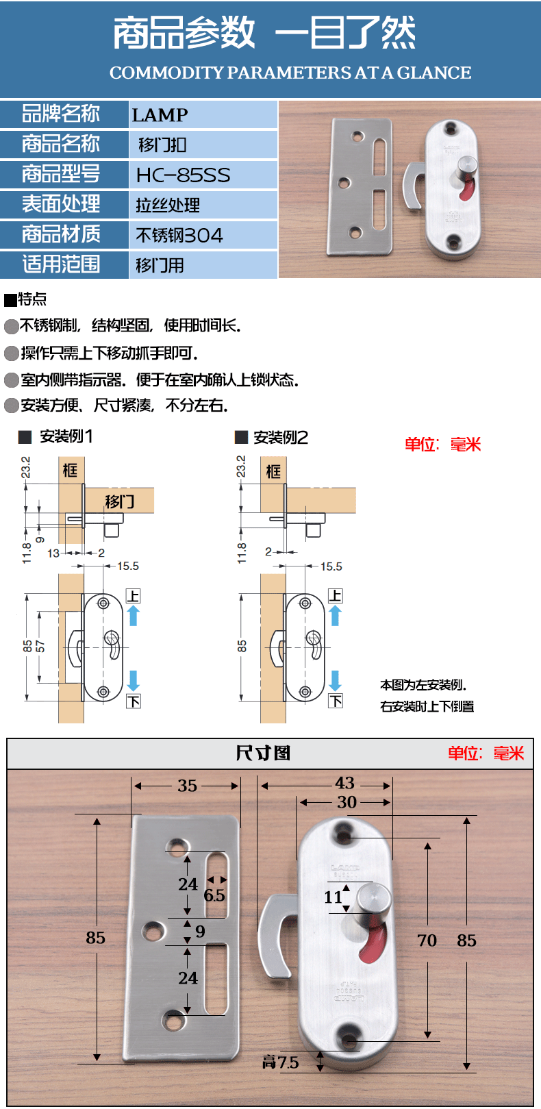 LAMPLAMP single-sided sliding door lock latch sliding door hasp 304 stainless steel sliding door lock HC-85SS