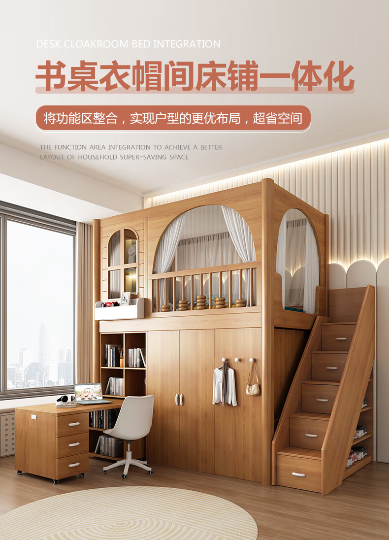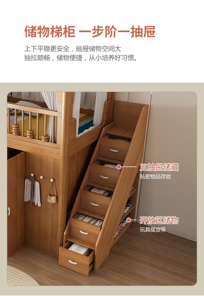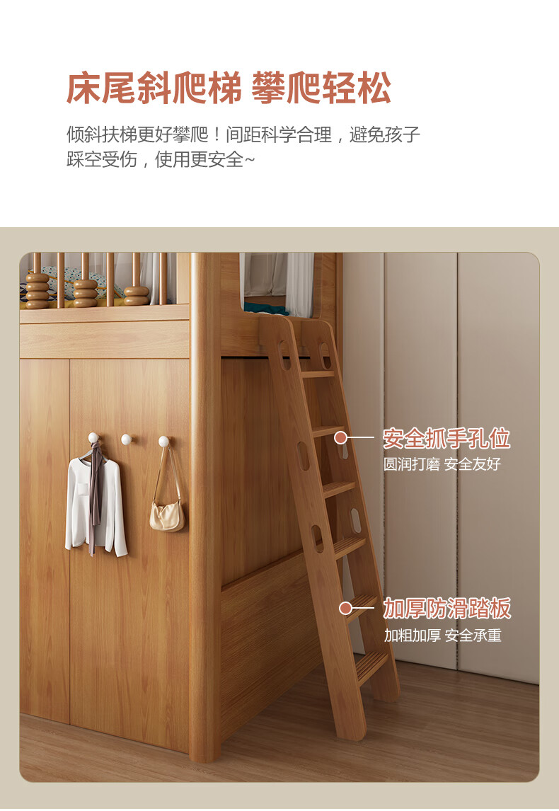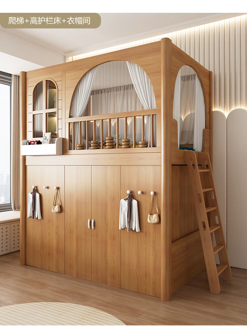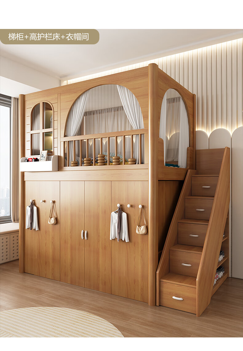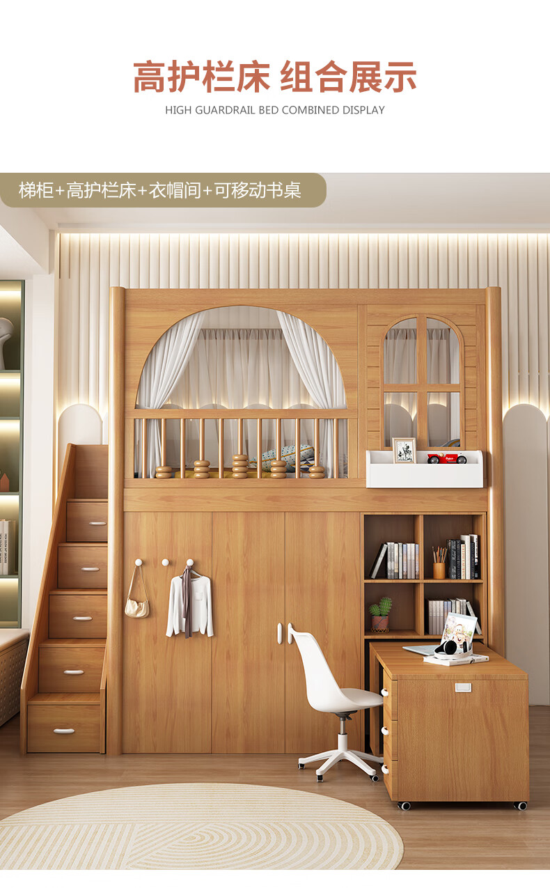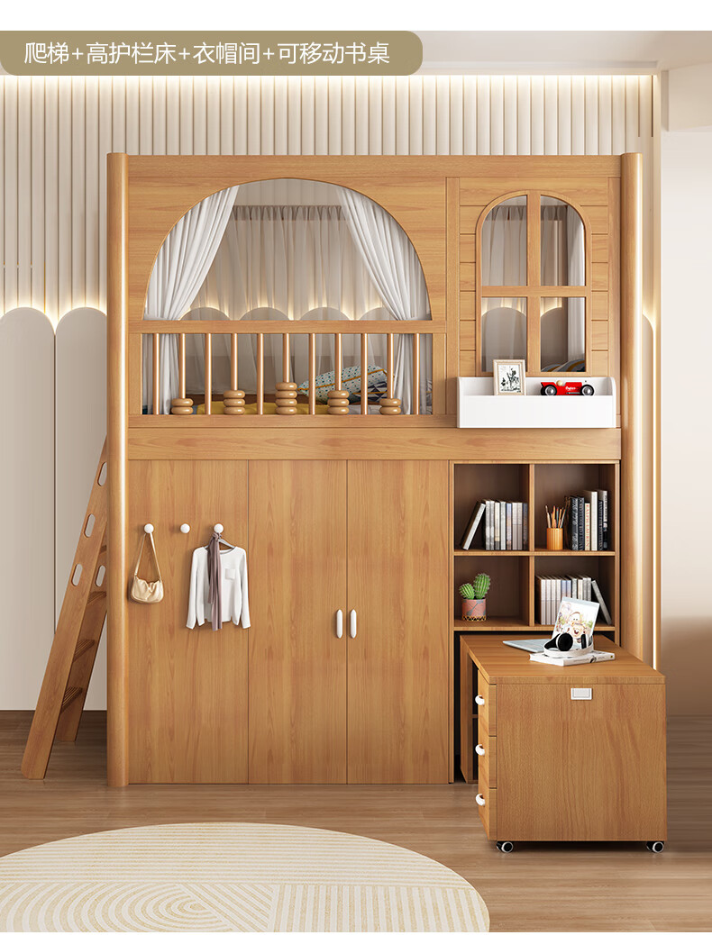 Hanmu high and low bed with desk integrated overhead wardrobe double-layer children's bed multifunctional combination bunk bed and table, ladder cabinet + overhead bed + cloakroom + 1 mattress 1.2*1.9m