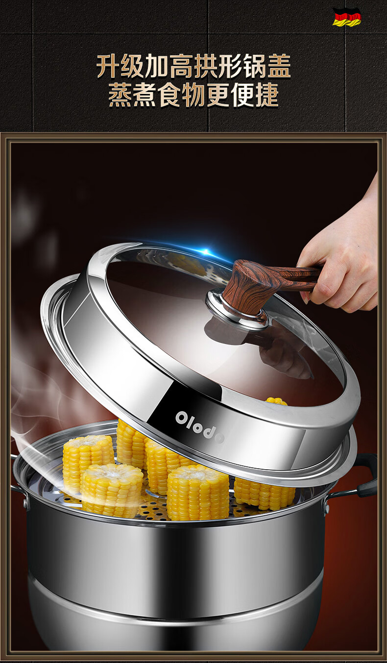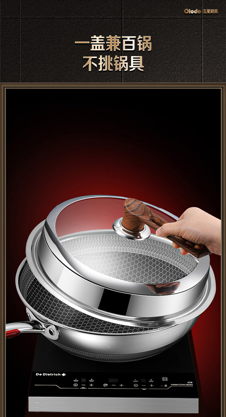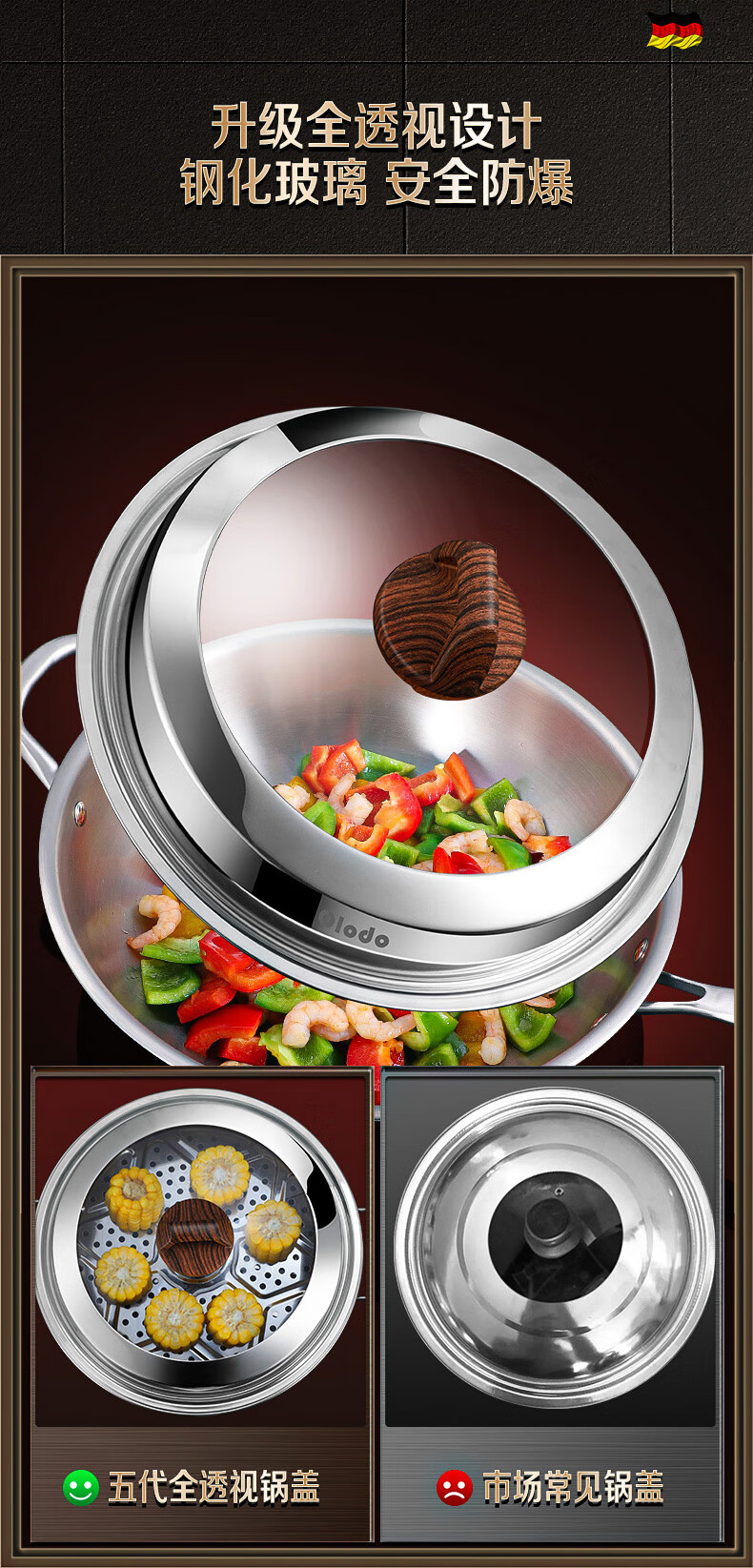 Olodo soup pot, steamer, wok, transparent tempered glass pot lid, thickened and elevated stainless steel countertop, stand-up cover with handle, 34cm full see-through, with 2 handles (can stand up