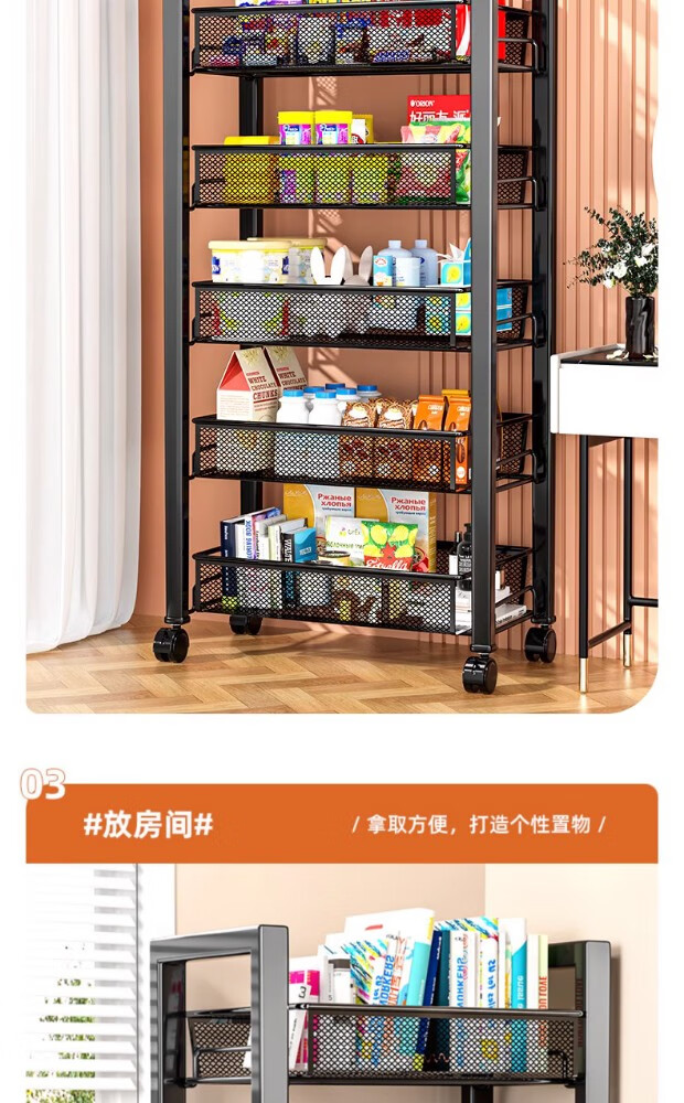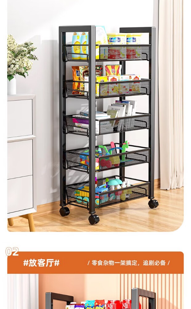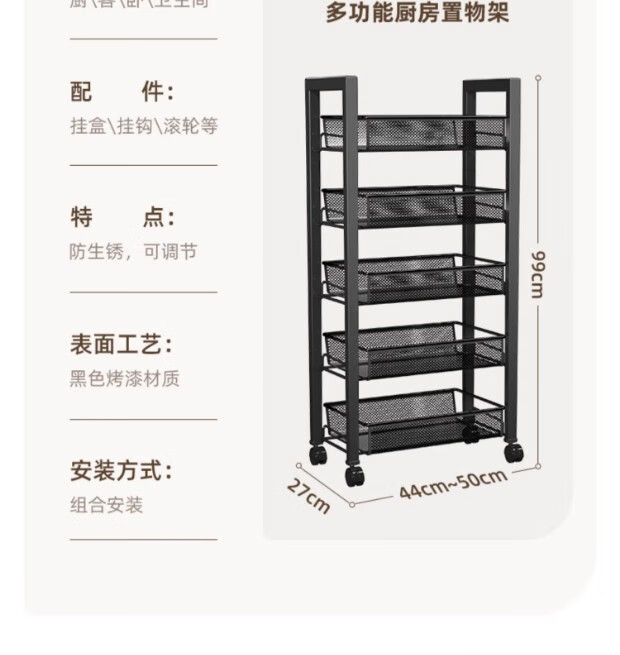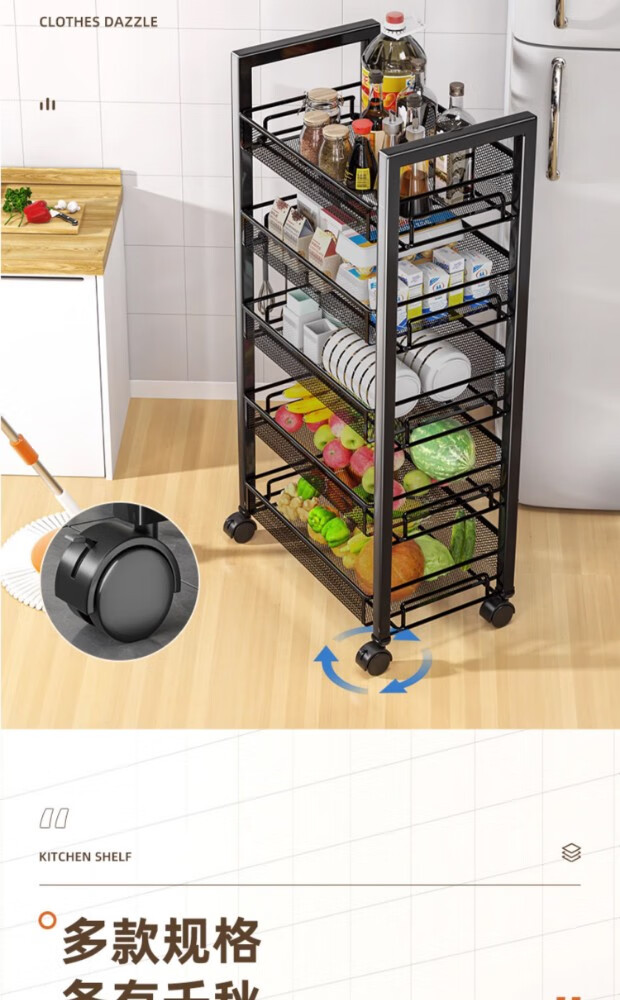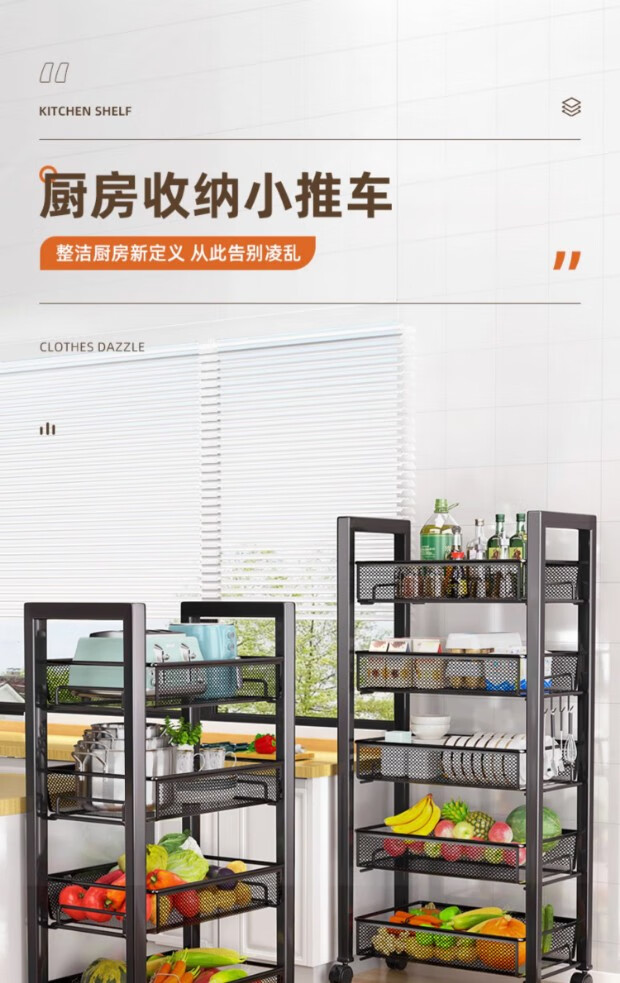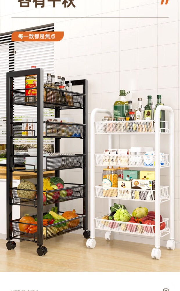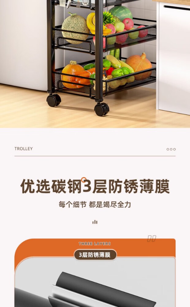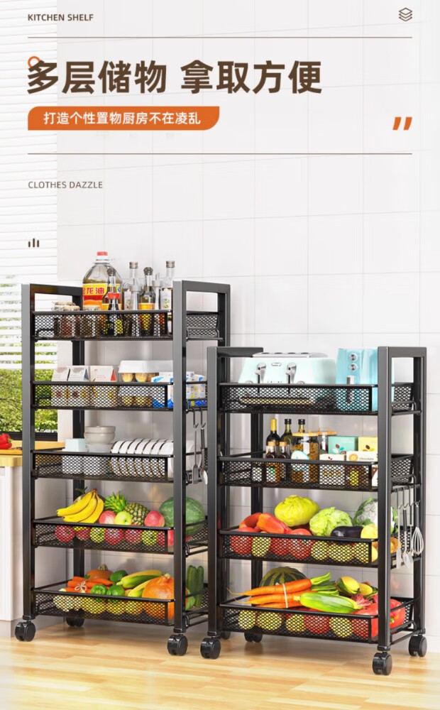 Qinwangge kitchen vegetable basket rack floor-standing multi-layer mobile household fruit and vegetable storage removable oven microwave pot rack three layers - two nets and one board standard model with hanging box
