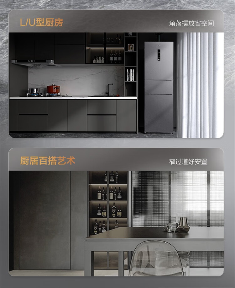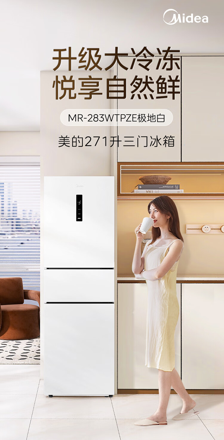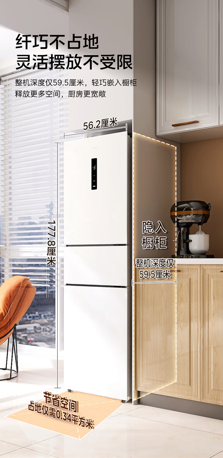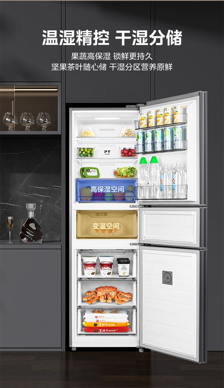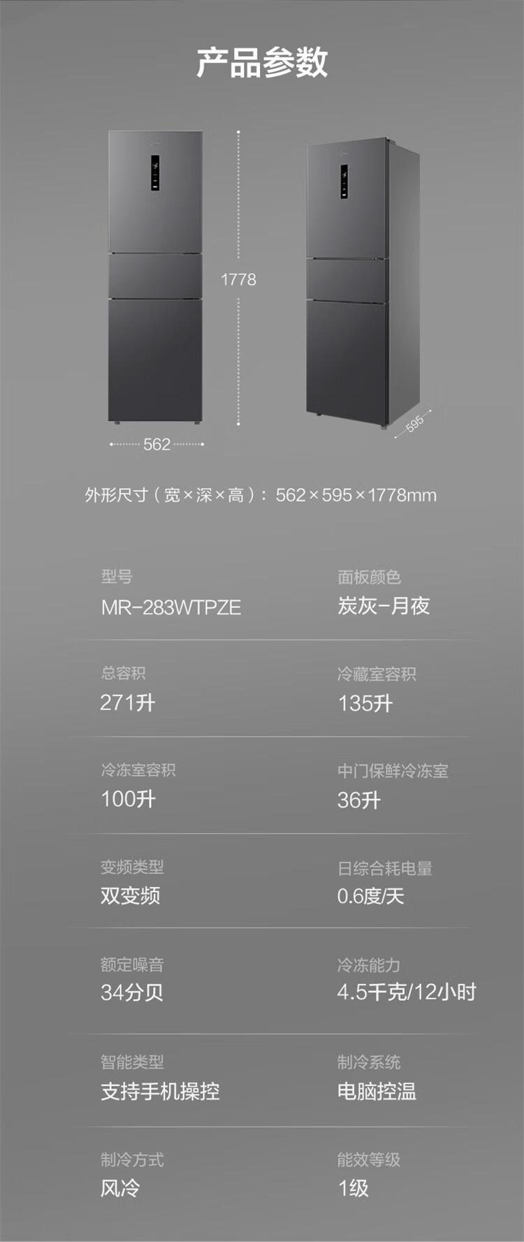 Midea 283 three-door large-capacity household smart refrigerator, first-class air-cooled, frost-free, variable frequency, energy-saving, low-noise, dual-purification, small rental refrigerator MR-283WTPZE Charcoal Gray-Moon Night