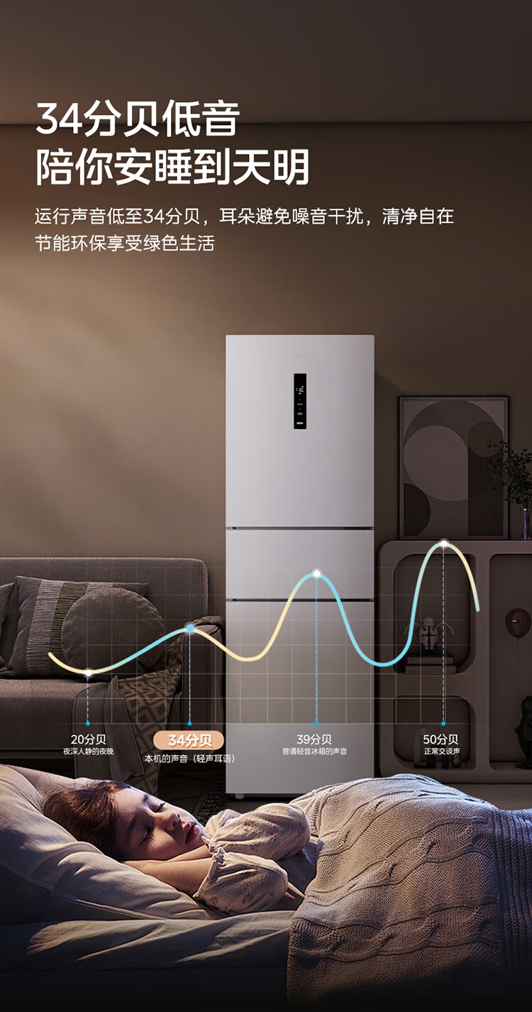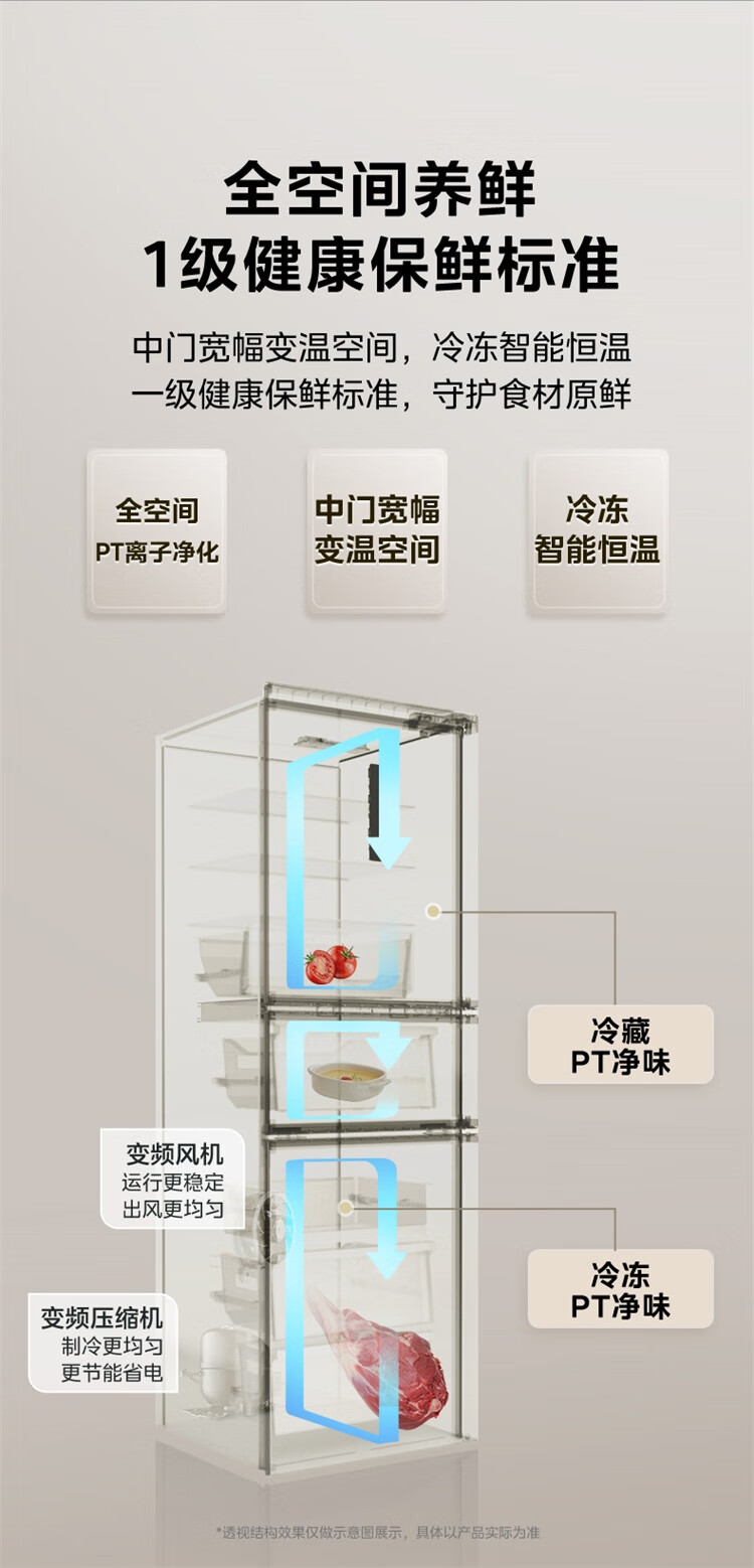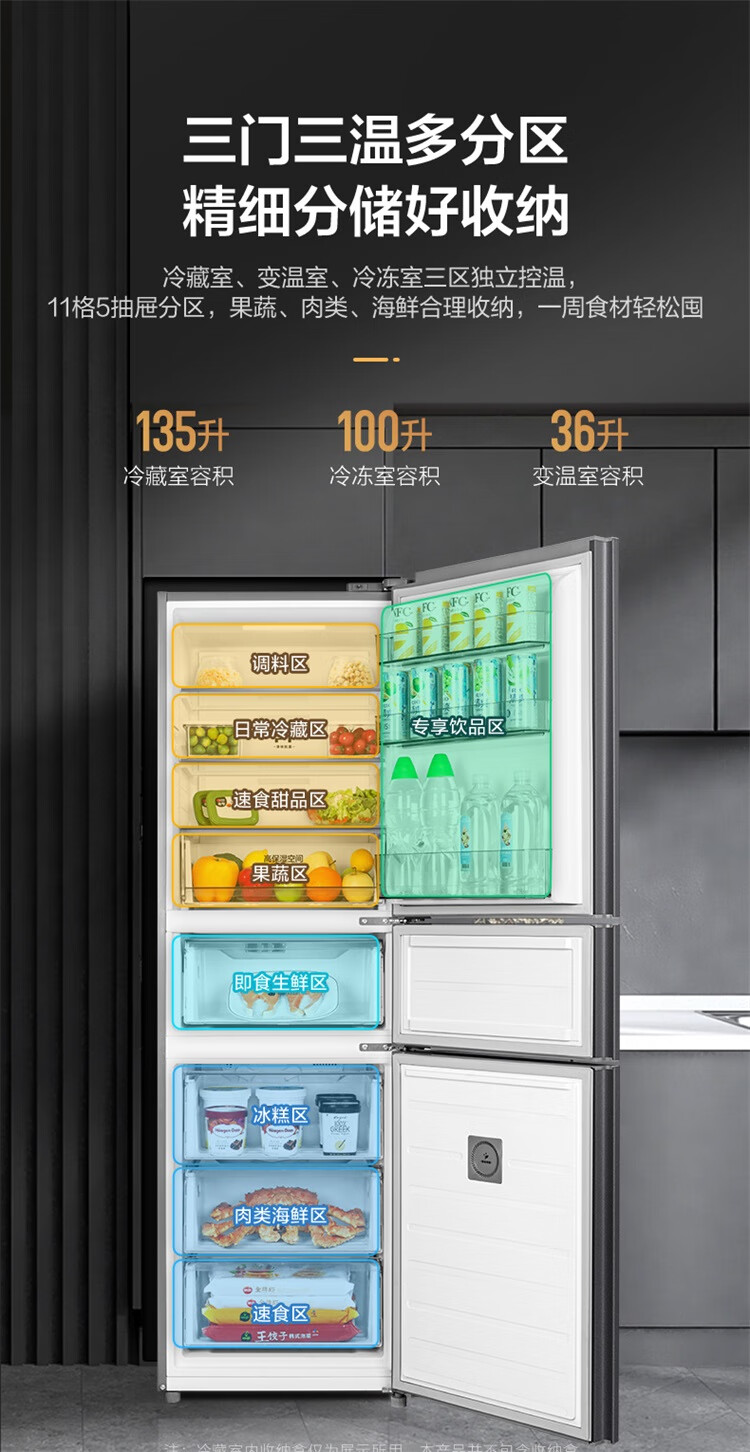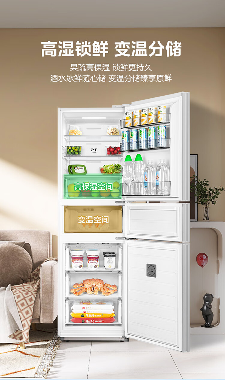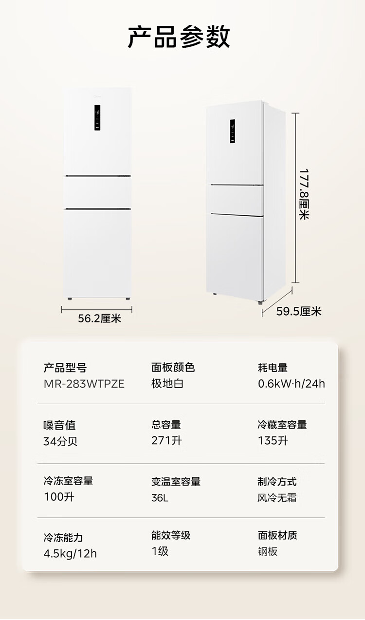 Midea 283 three-door large-capacity household smart refrigerator, first-class air-cooled, frost-free, variable frequency, energy-saving, low-noise, dual-purification, small rental refrigerator MR-283WTPZE Charcoal Gray-Moon Night