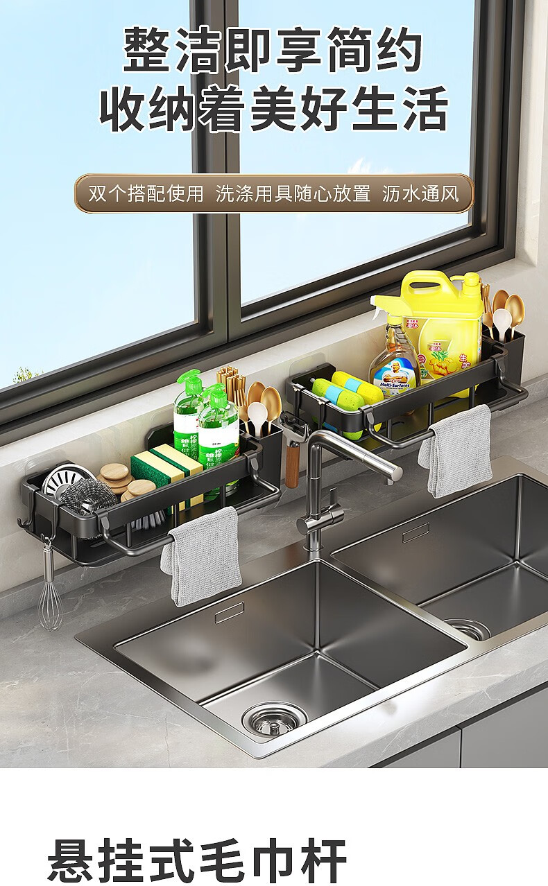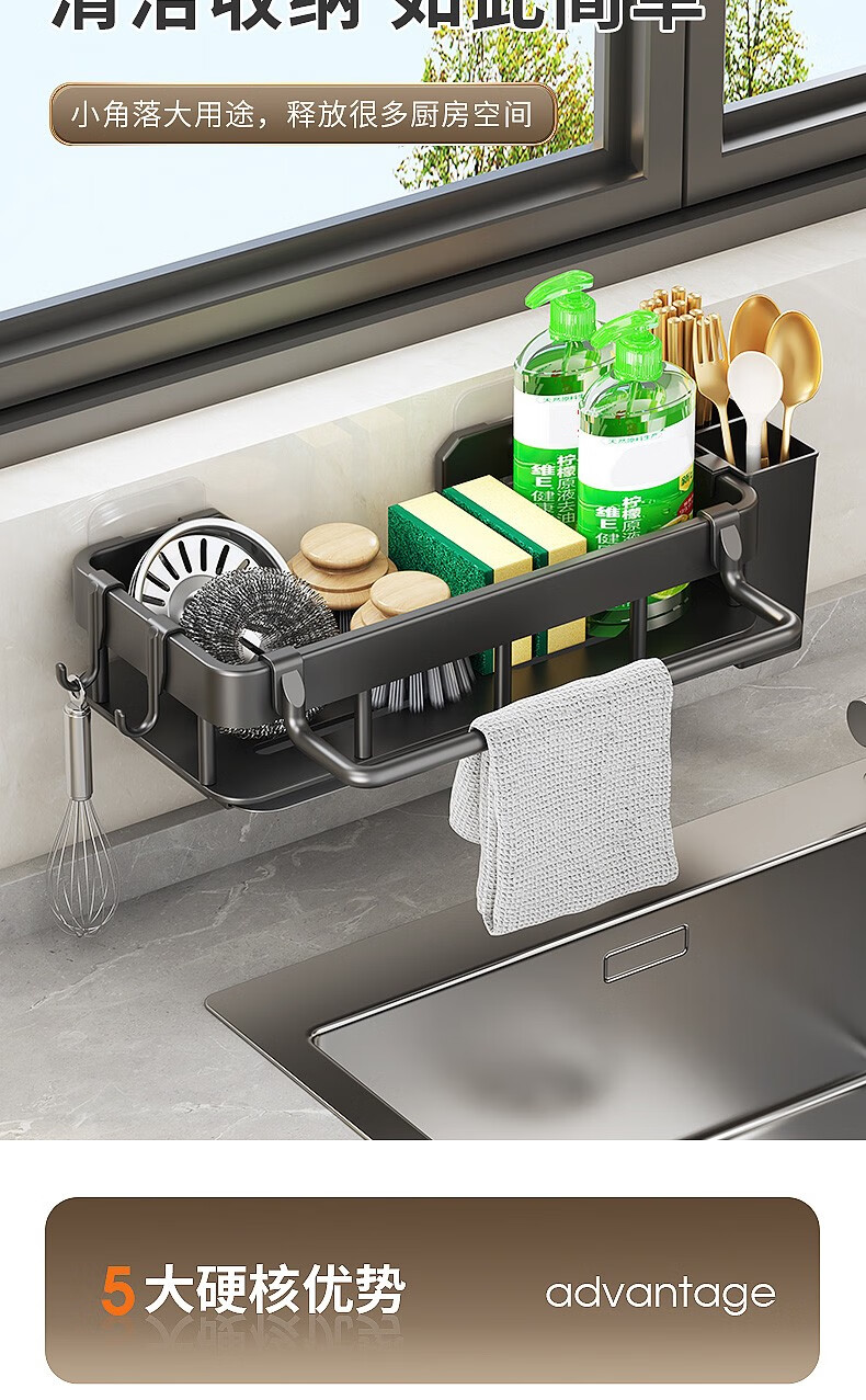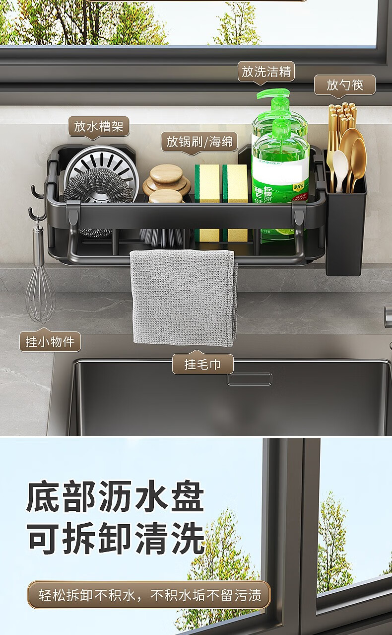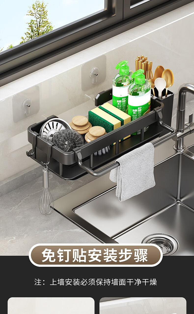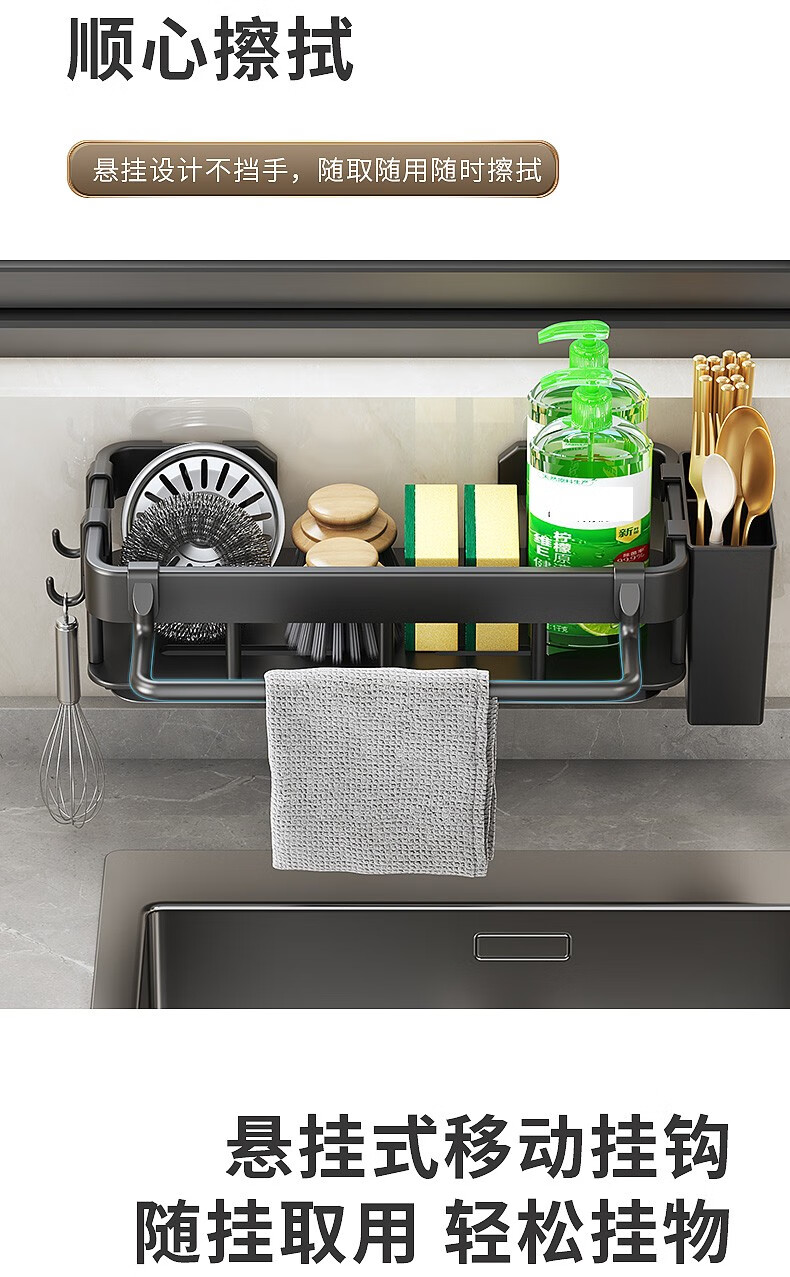 MiHangshu kitchen rack wall-mounted sink drain rack countertop rag rack bathroom storage hanging basket spice rack dishcloth rack main rack + towel bar + water tray + hook * 2