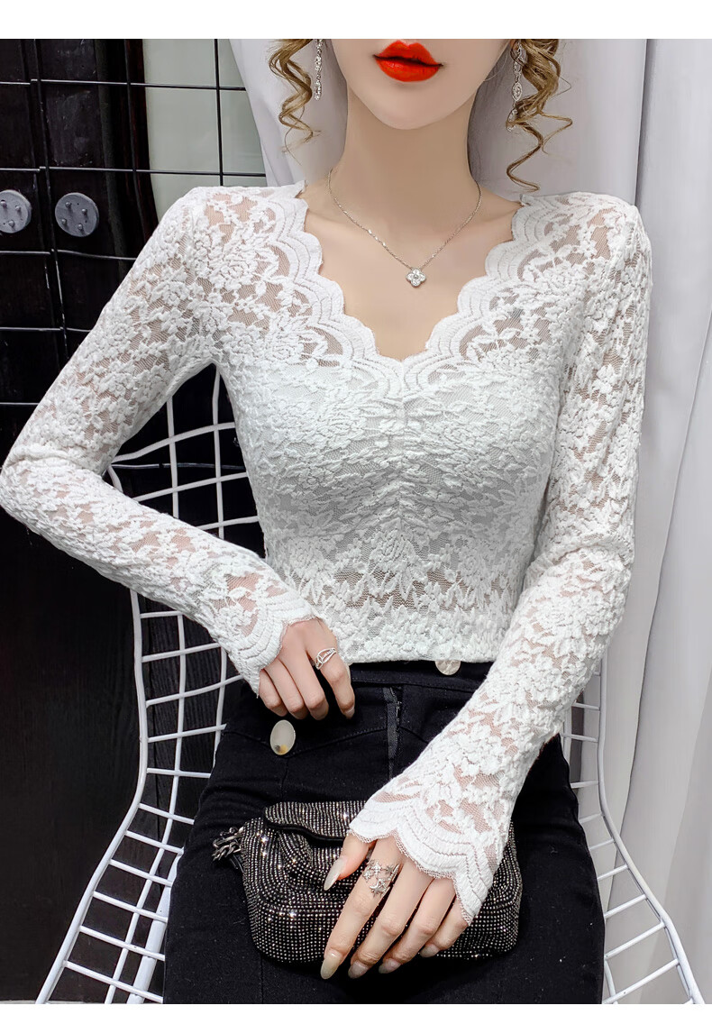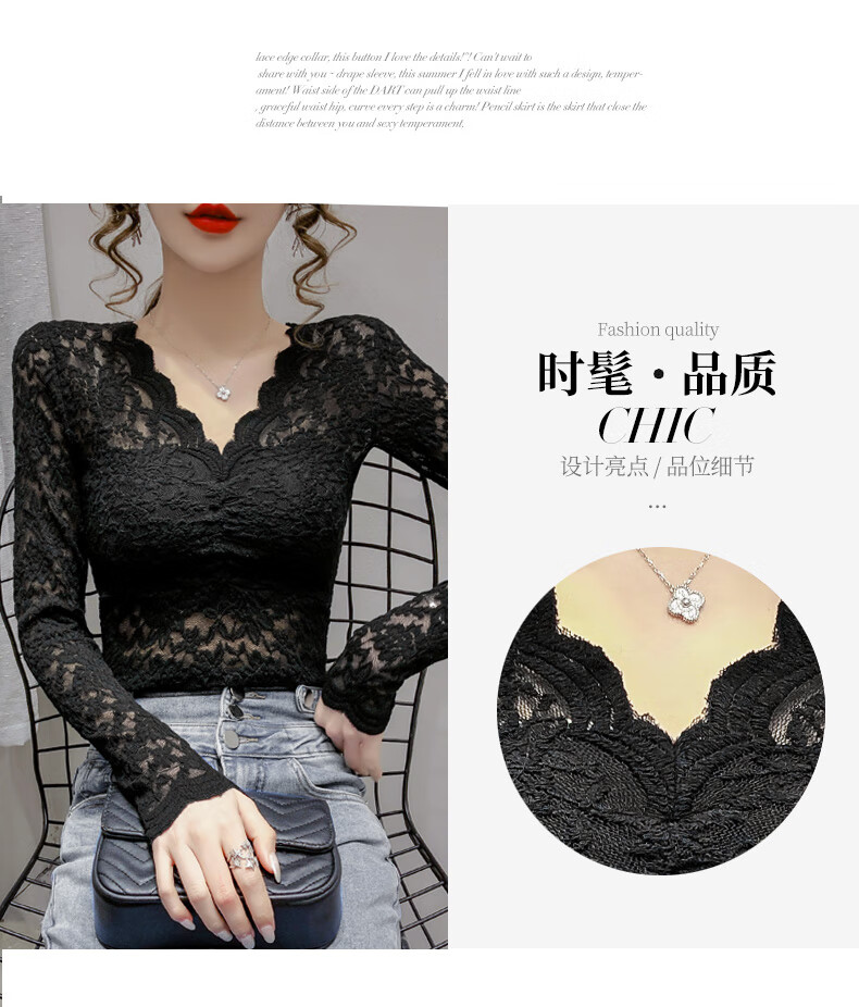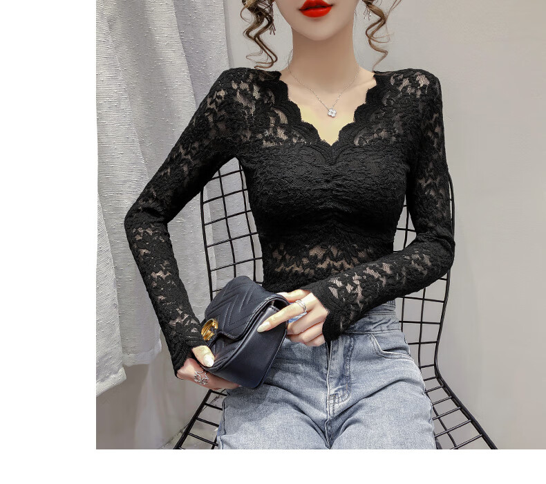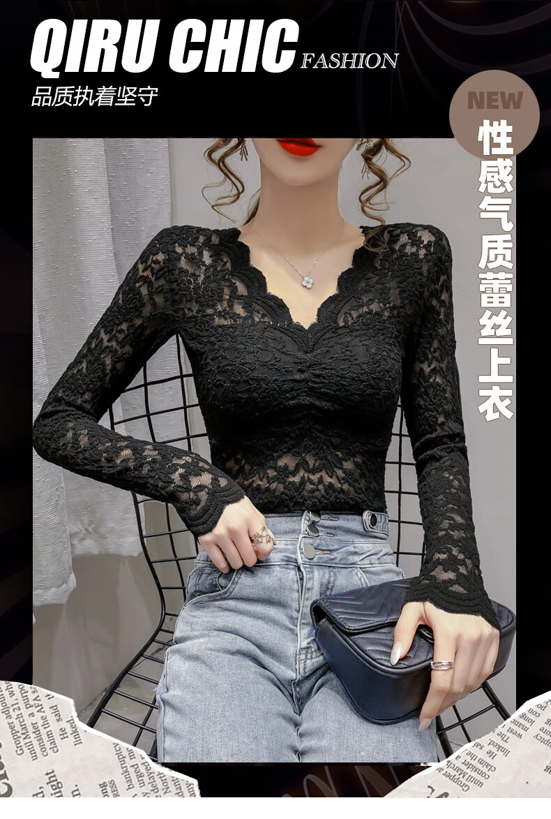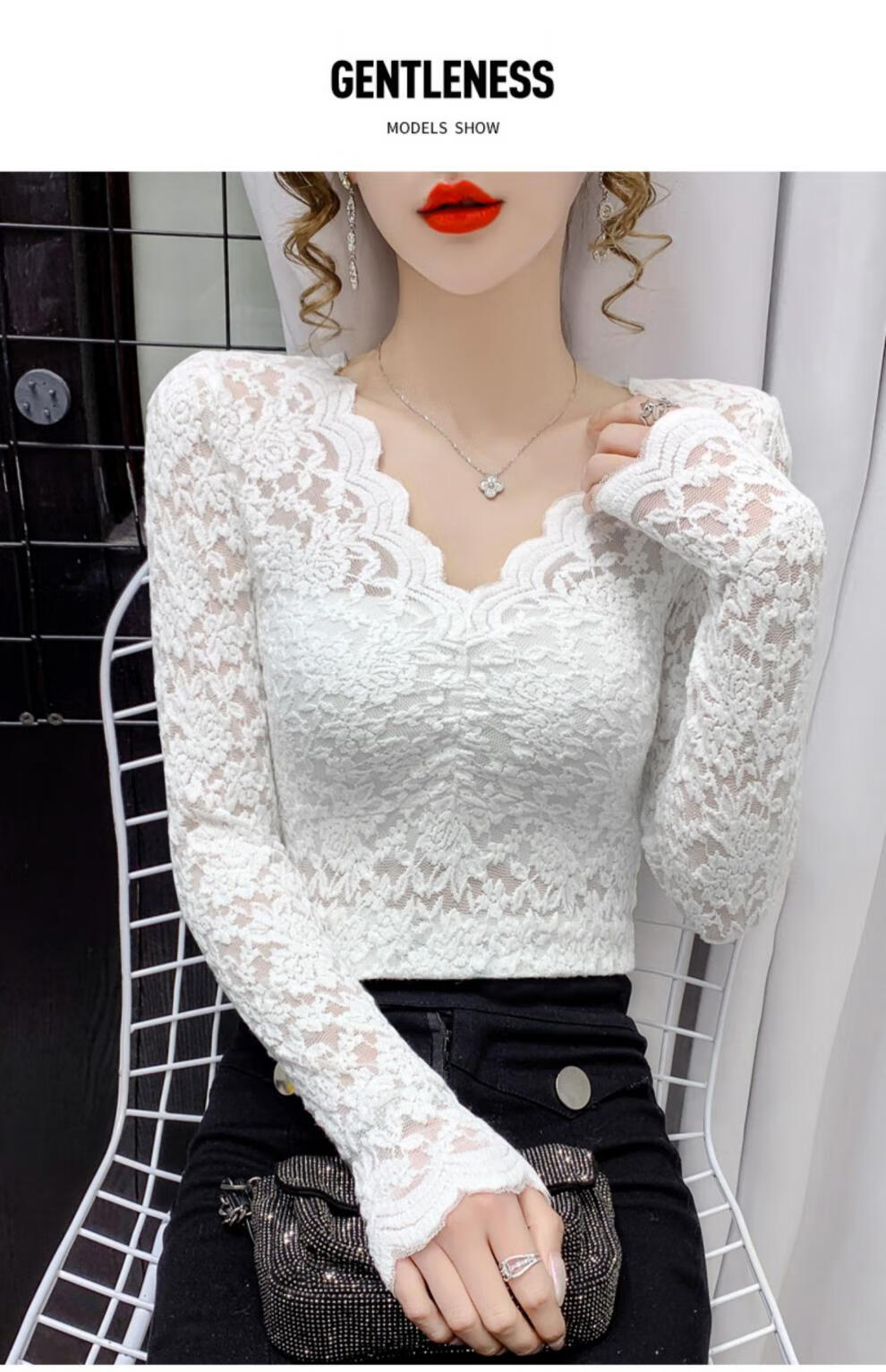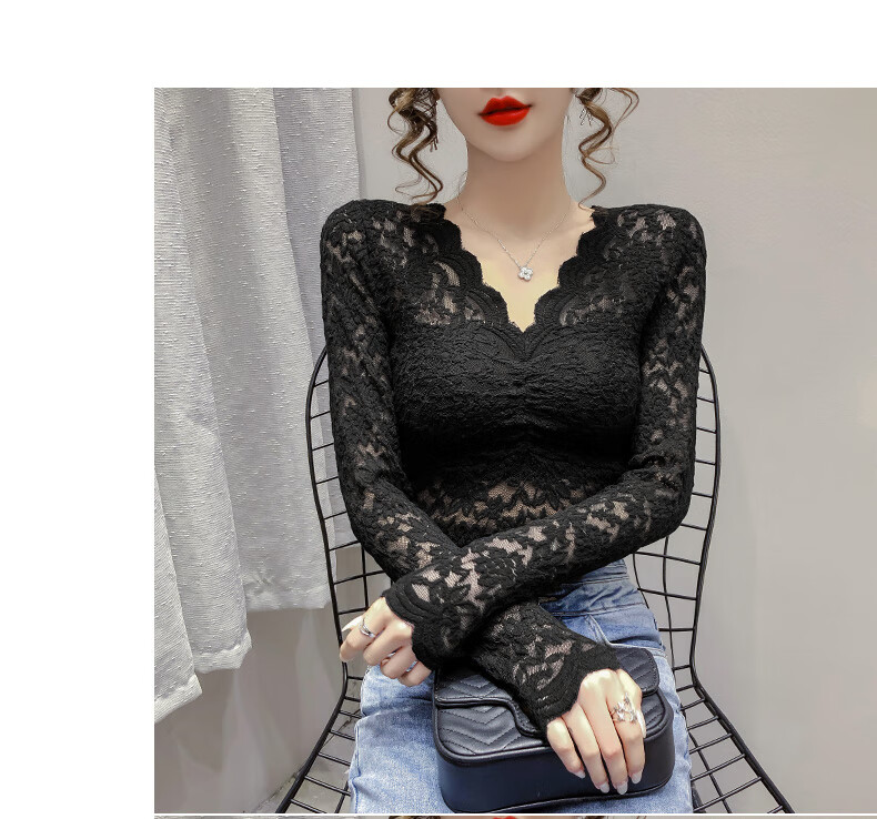 Woodpecker high-end V-neck lace bottoming shirt for women 2025 spring new small shirt with velvet inner long-sleeved mesh top for women Black Garib L 110-120