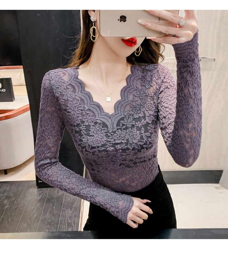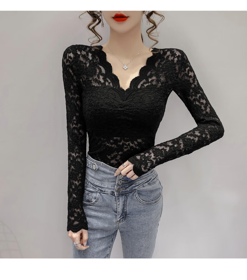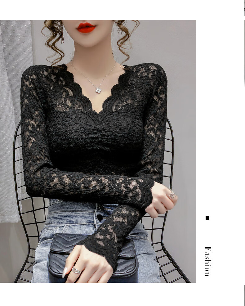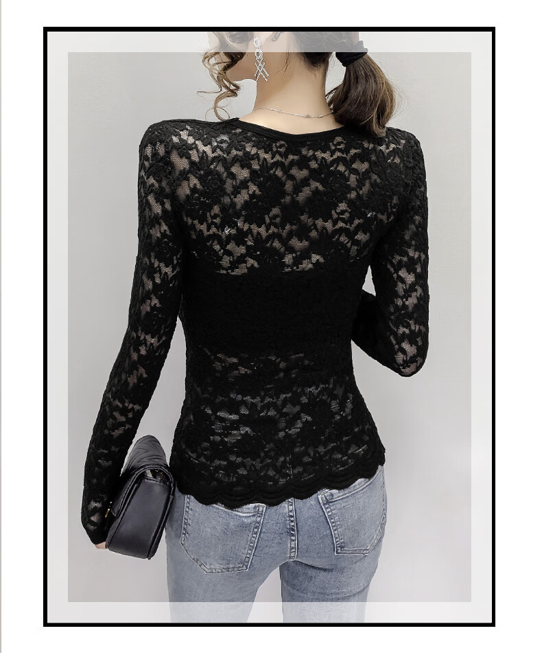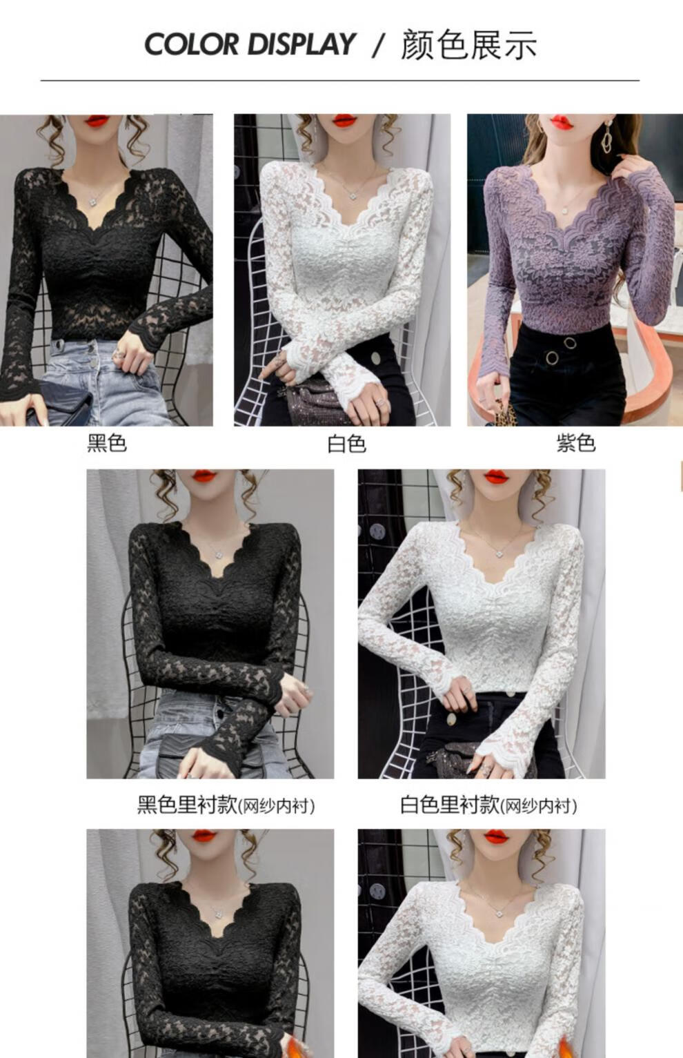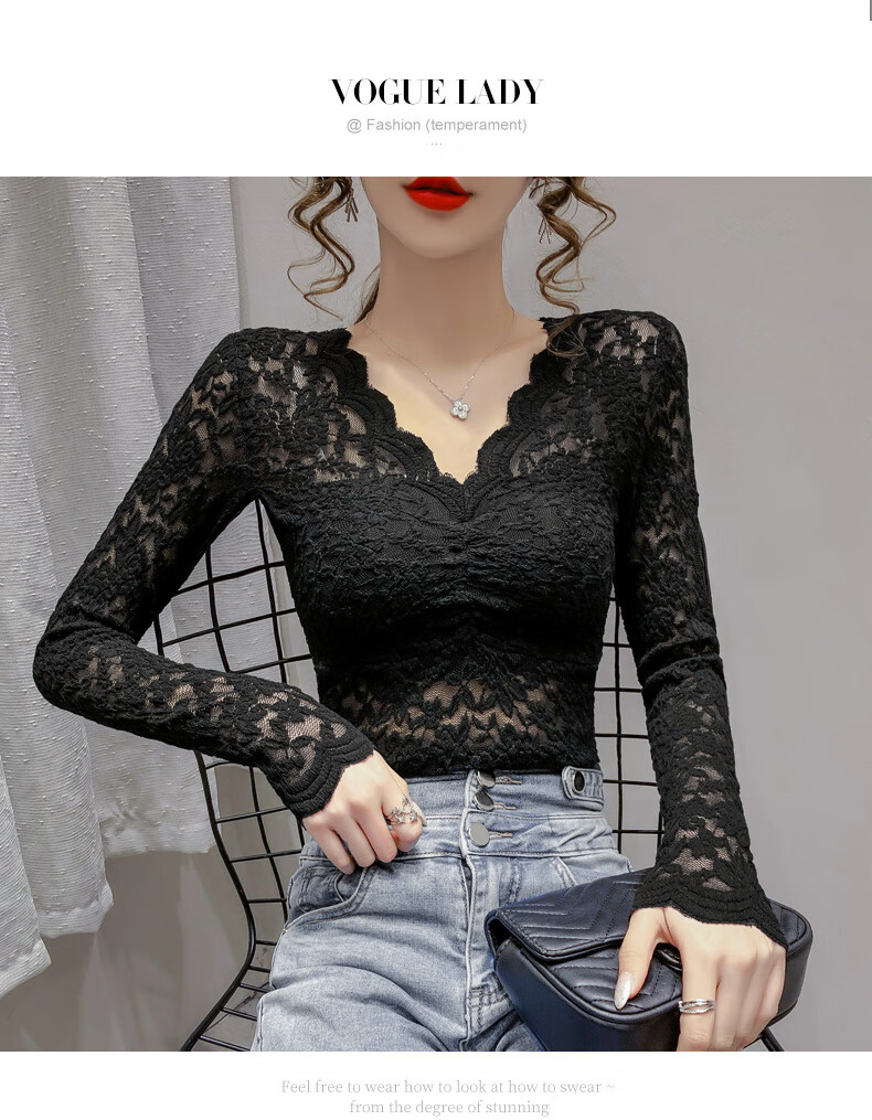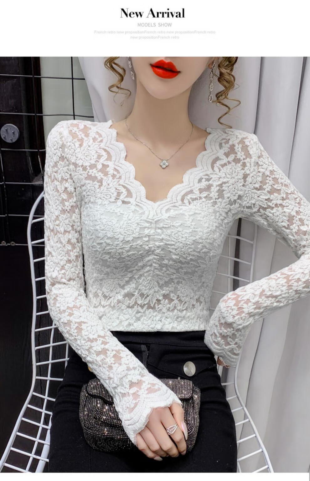 Woodpecker high-end V-neck lace bottoming shirt for women 2025 spring new small shirt with velvet inner long-sleeved mesh top for women Black Garib L 110-120