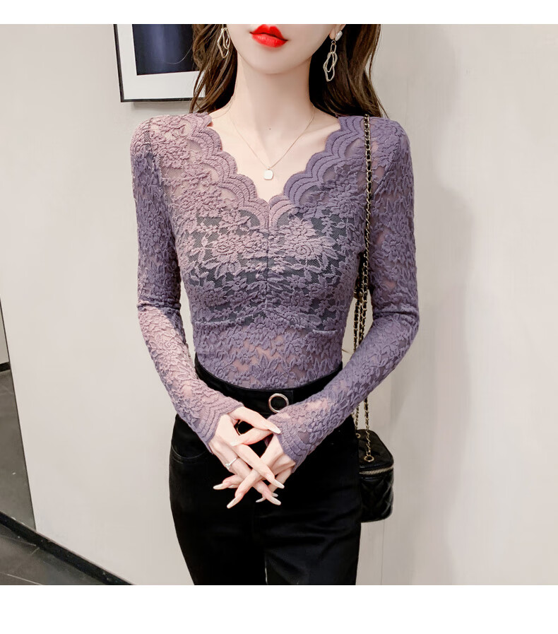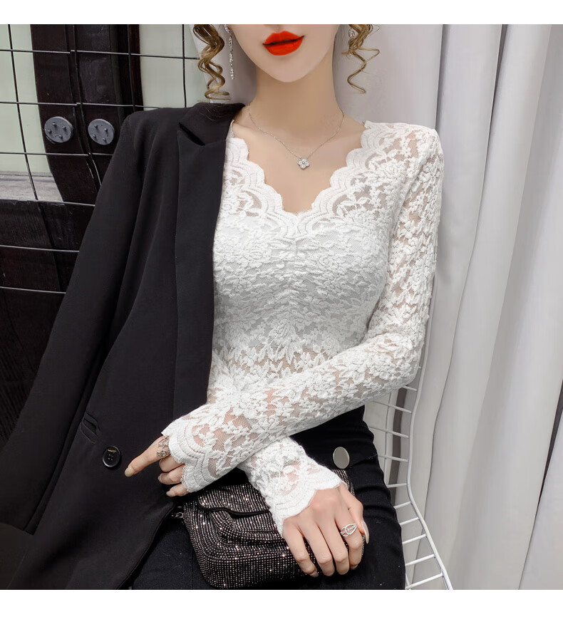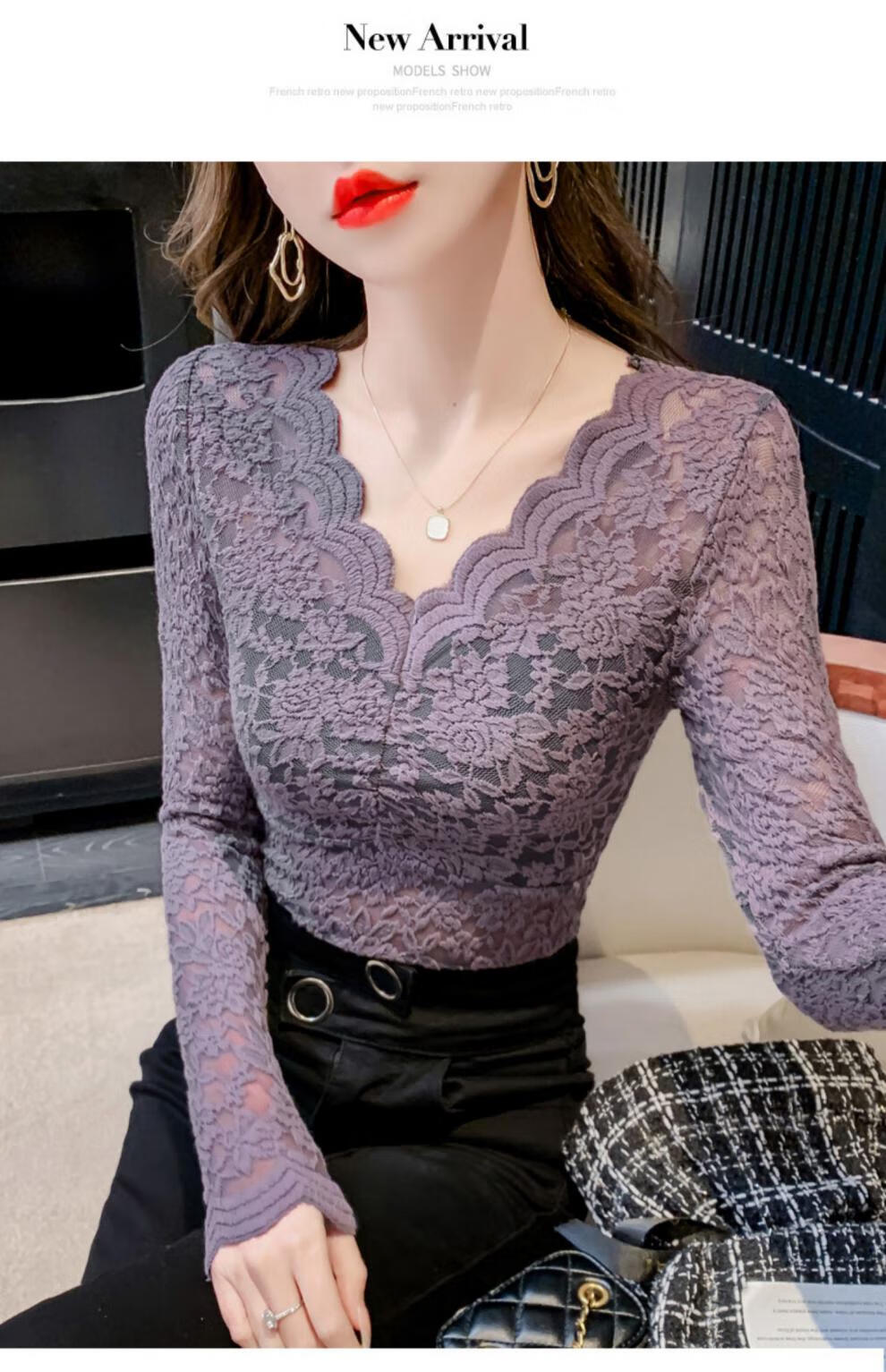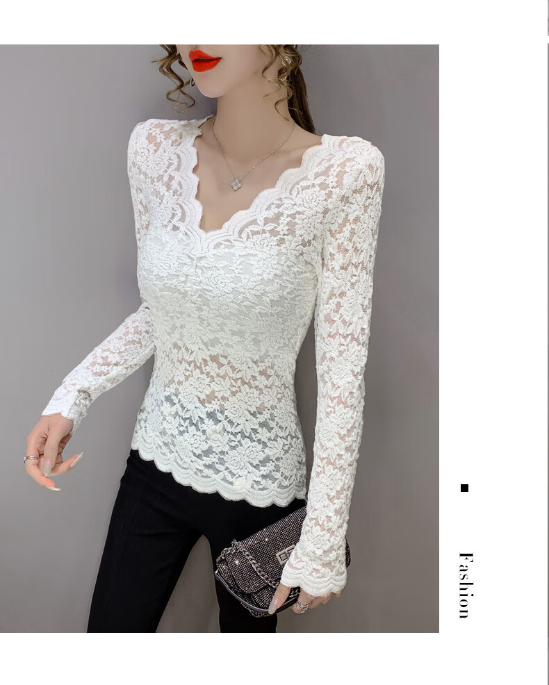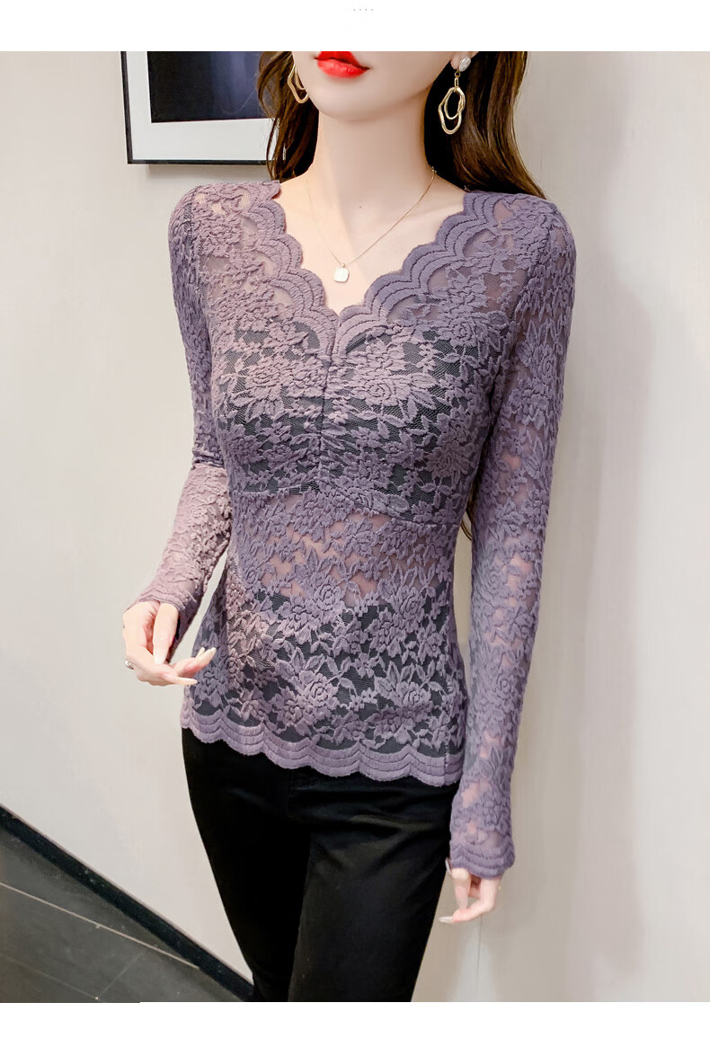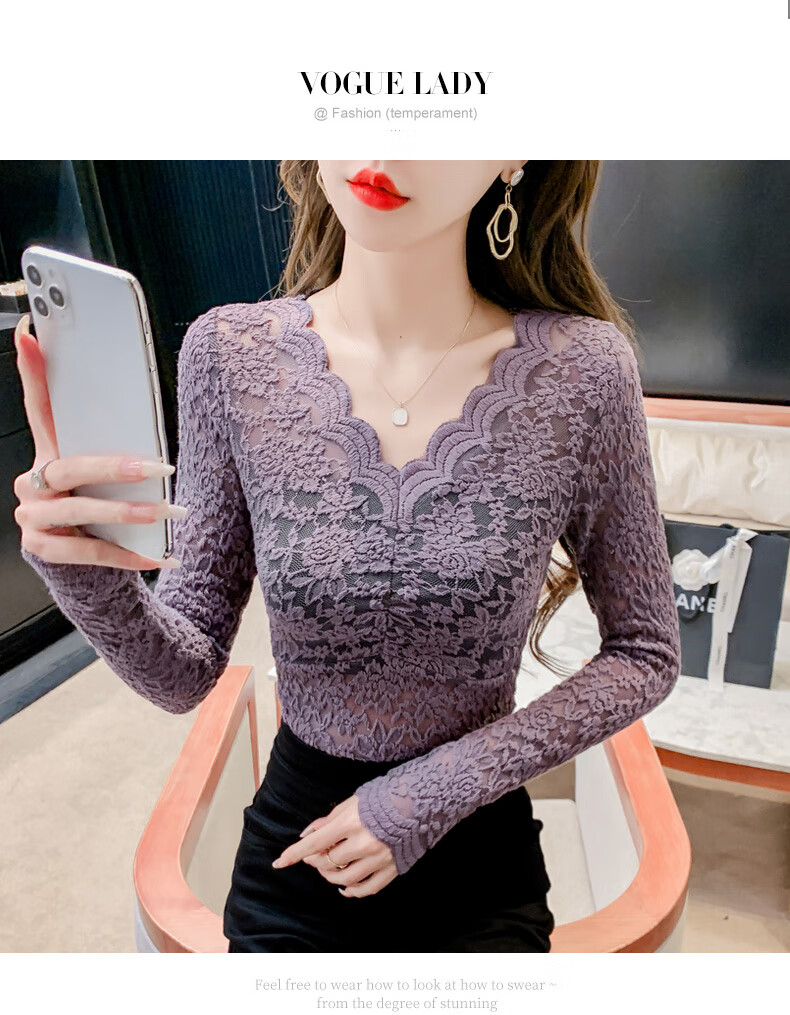 Woodpecker high-end V-neck lace bottoming shirt for women 2025 spring new small shirt with velvet inner long-sleeved mesh top for women Black Garib L 110-120