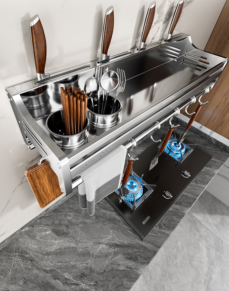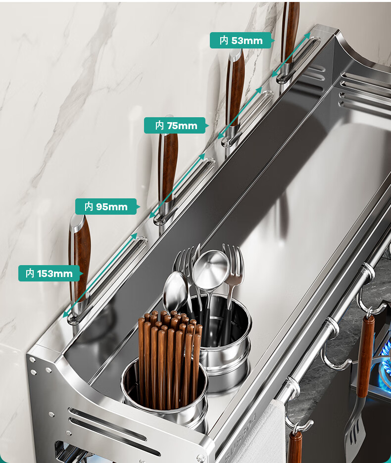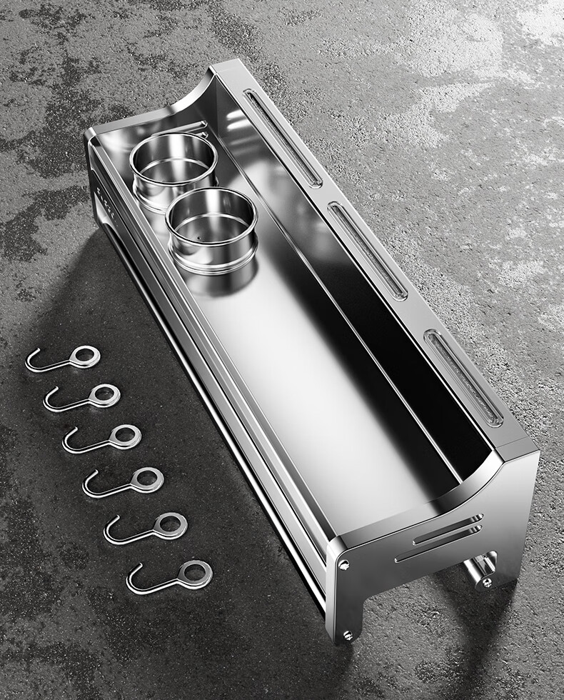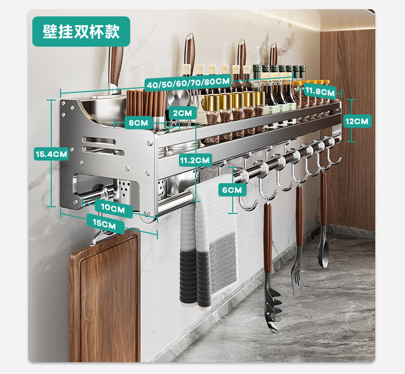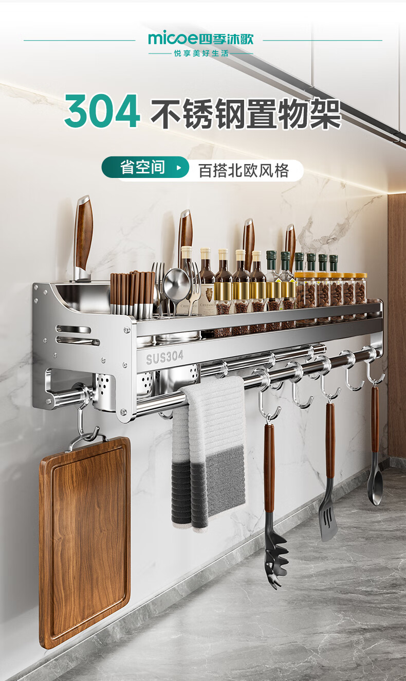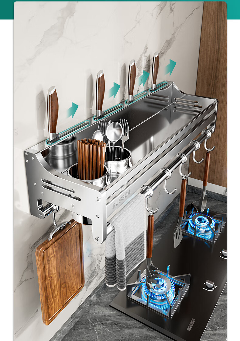 Four Seasons Muge 304 stainless steel kitchen rack wall-mounted knife holder pot lid seasoning storage rack chopstick barrel kitchen utensils 304 stainless steel 60cm double cup