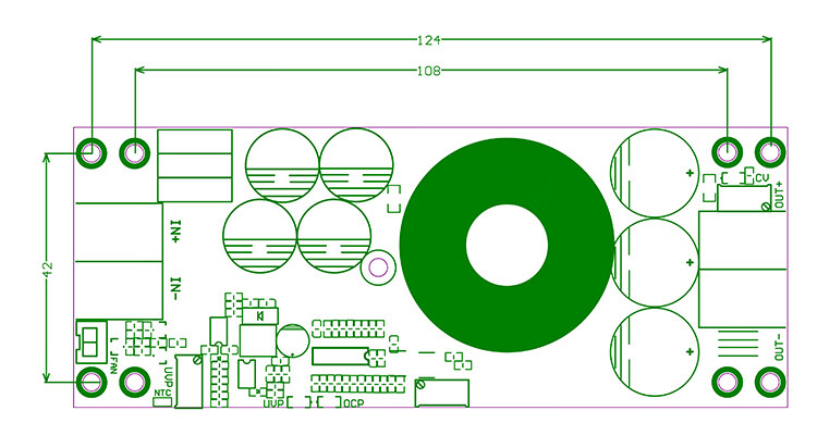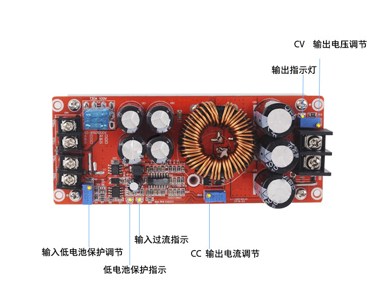 7.输出电流:20A MAX 超过15A请加强散热(与输入、输出压差有关,压差越大输出电流越小)