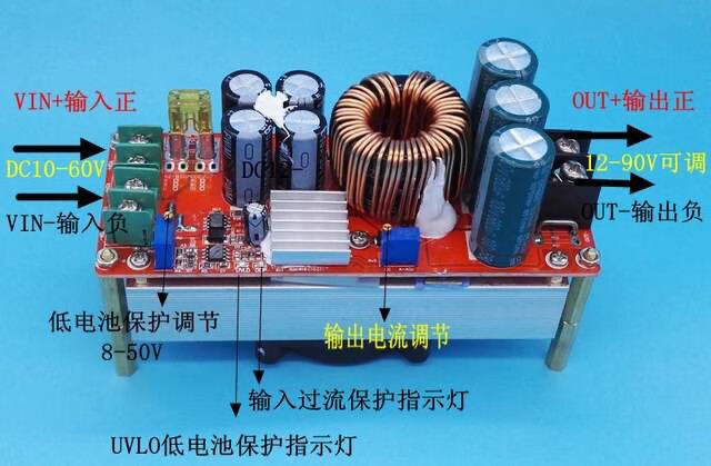 BT900W大功率DC-DC升压模块是一款宽电压输入,输出电压电流可调的新型升压模块。产品用料实足,采用定制散热器,散热器和升压板一体化设计。采用1mm双线绕制电感,高品质滤波电容,升压输出电源品质更好。板载电源工作指示灯,具有输入欠压调节、输出电压调节、输入电流调节电位器,可随时调节输出电压、电流大小,输入和输出采用8500接线端子,通过电流能力强,保证长时间可靠工作。