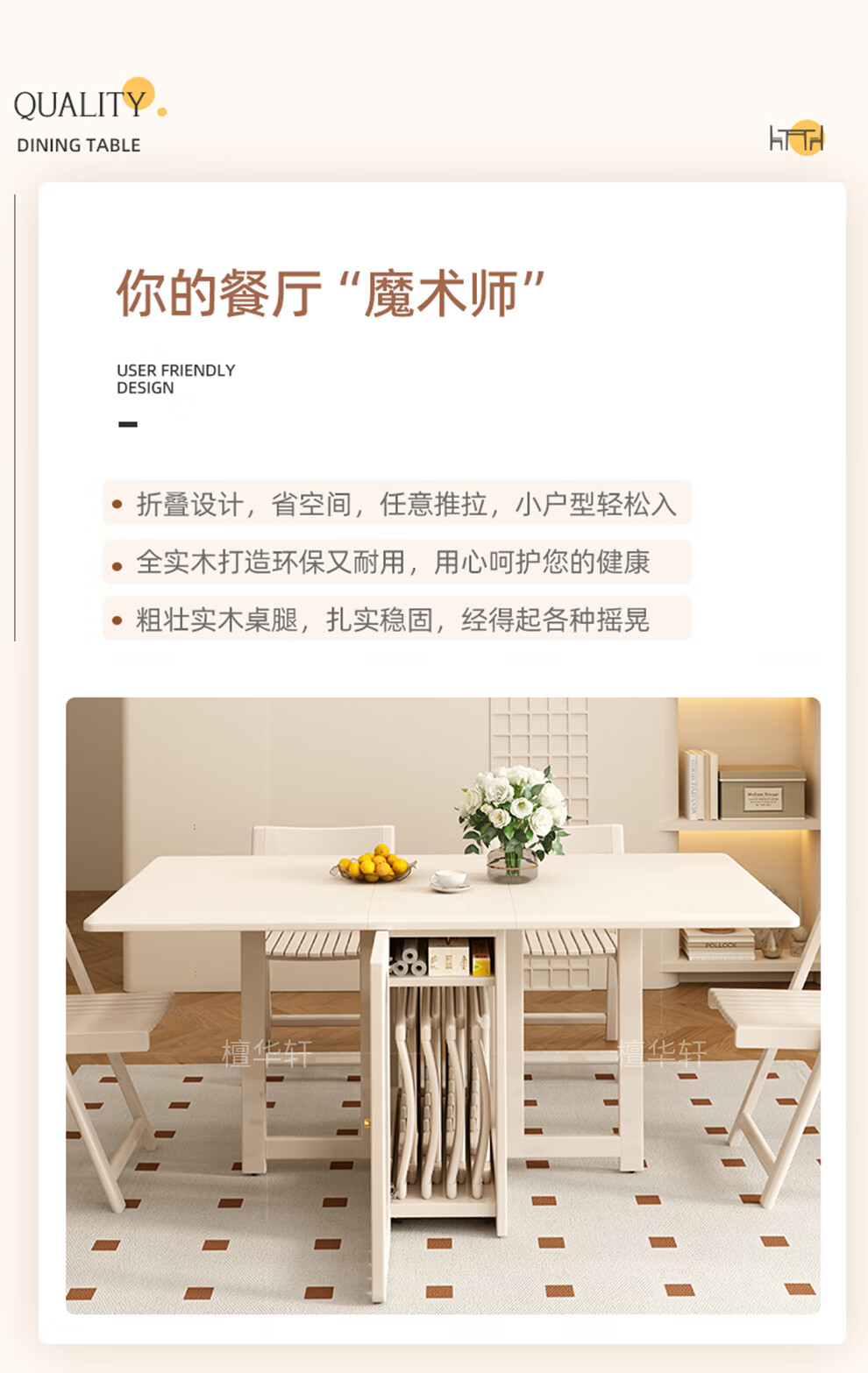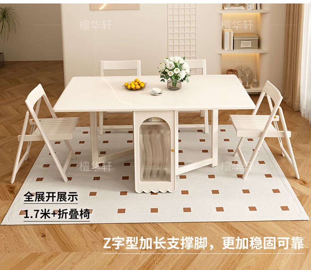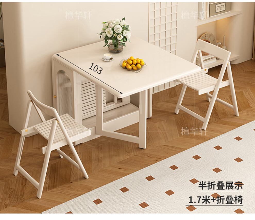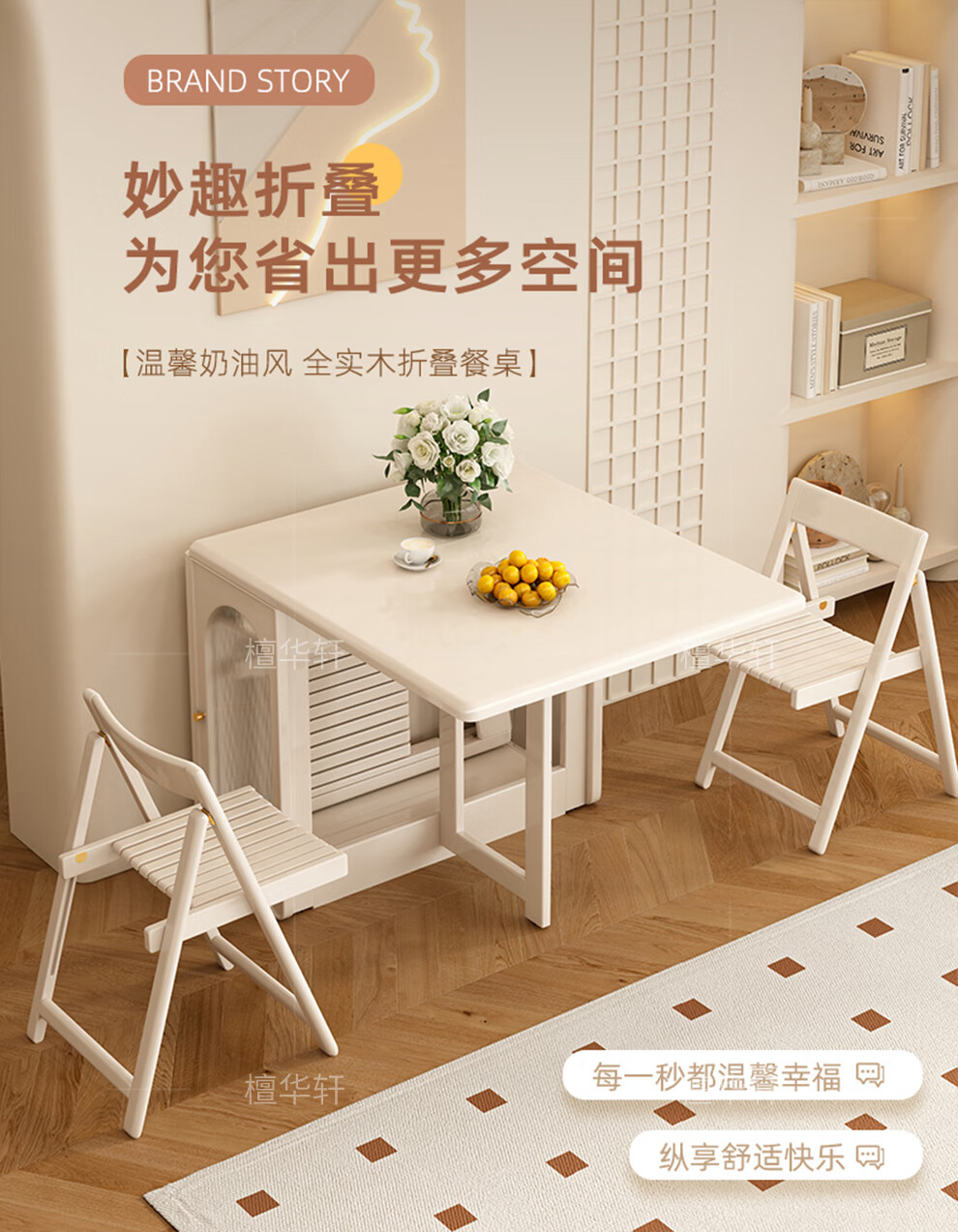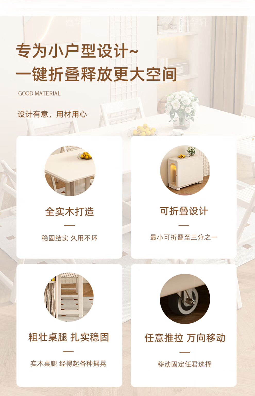 Tan Hua Xuan all solid wood folding dining table and sideboard integrated small apartment cream style dining table with lights and wheels white oak table 1.4m folding dining table + folding leather chairs x4