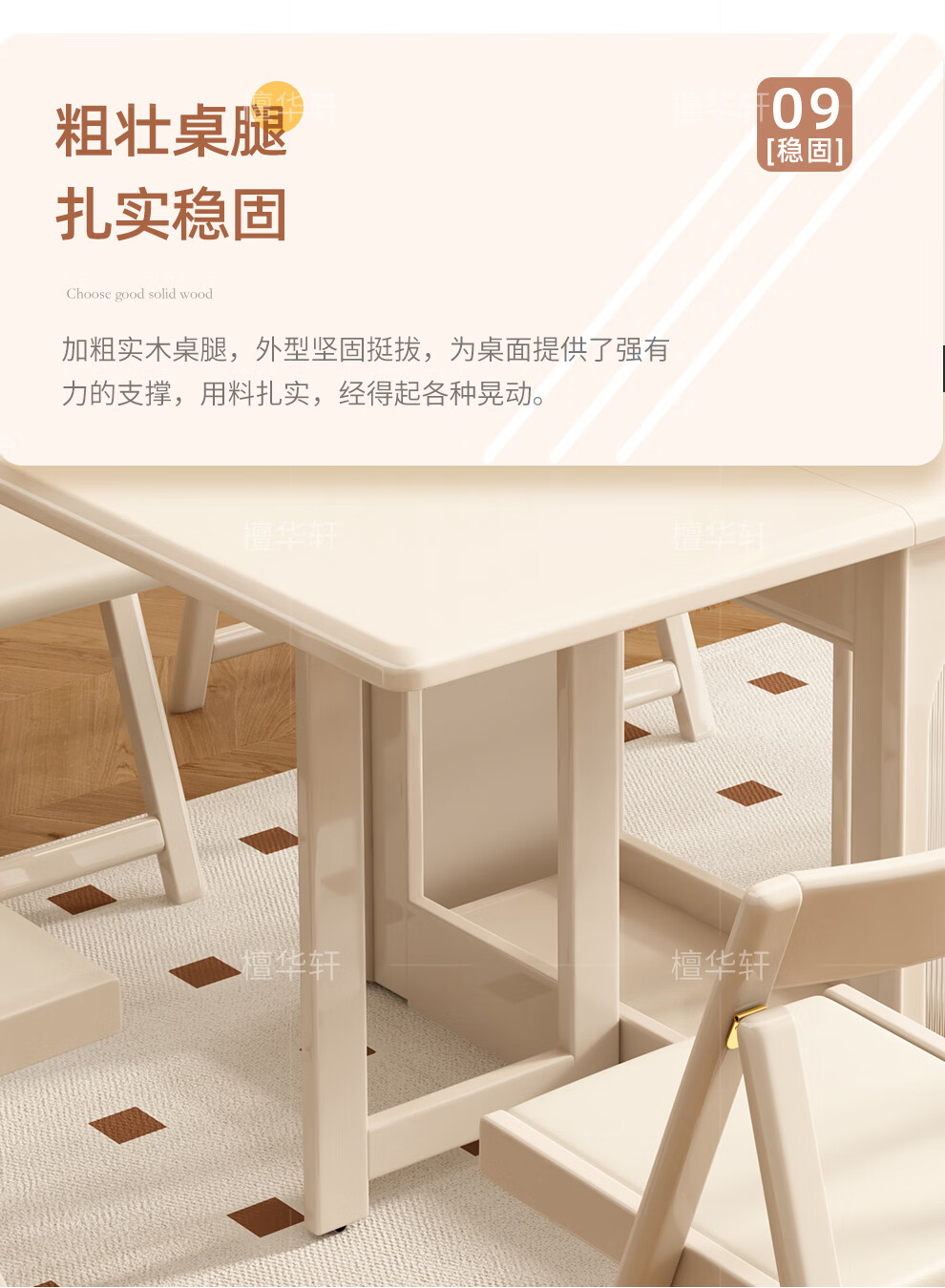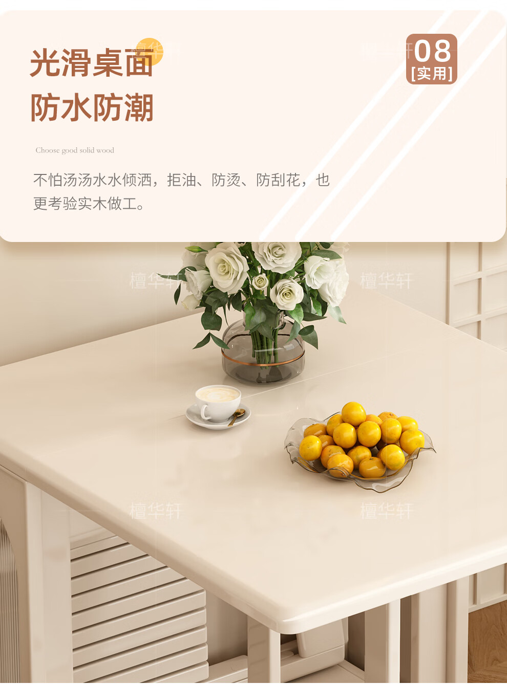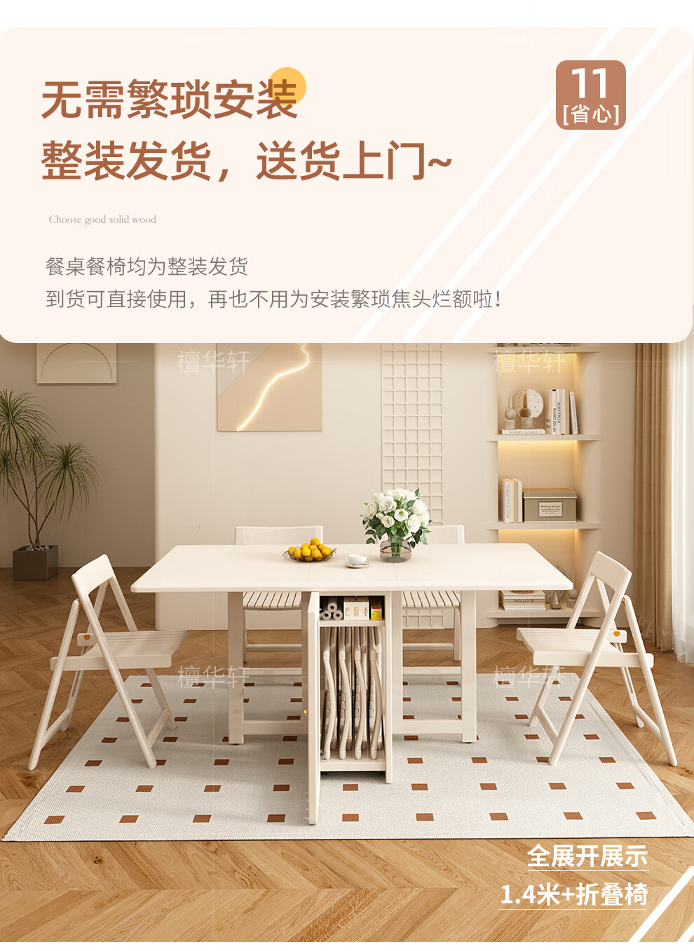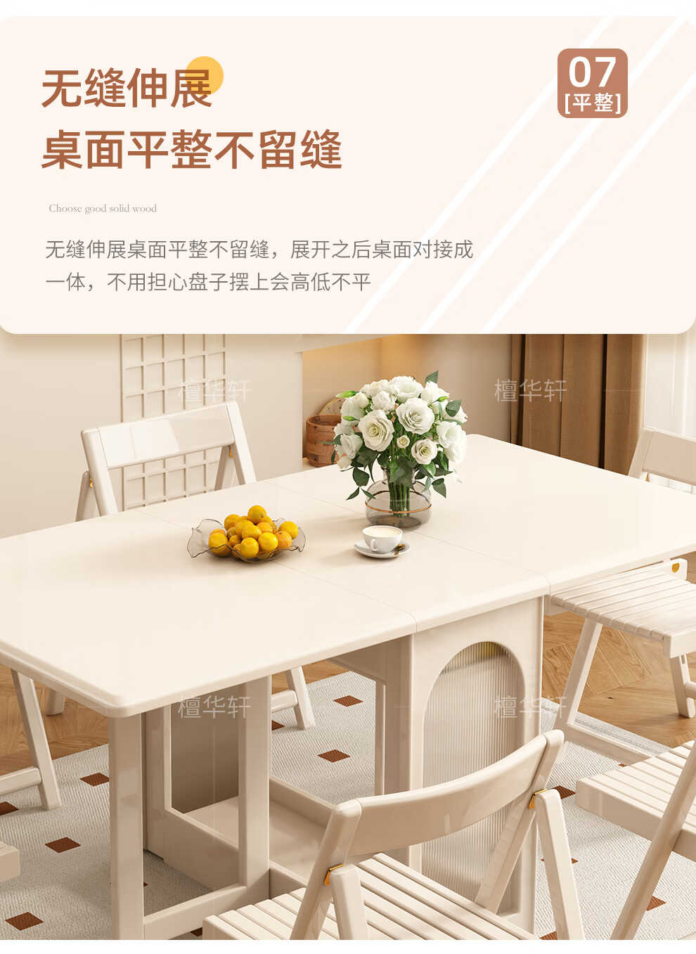 Tan Hua Xuan all solid wood folding dining table and sideboard integrated small apartment cream style dining table with lights and wheels white oak table 1.4m folding dining table + folding leather chairs x4