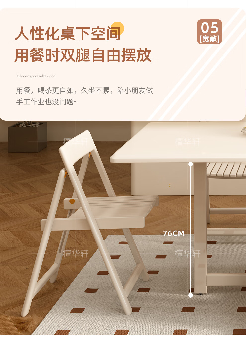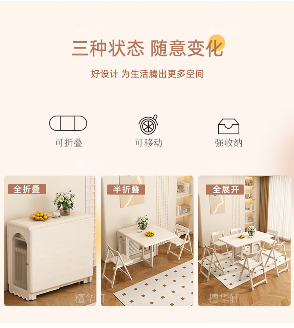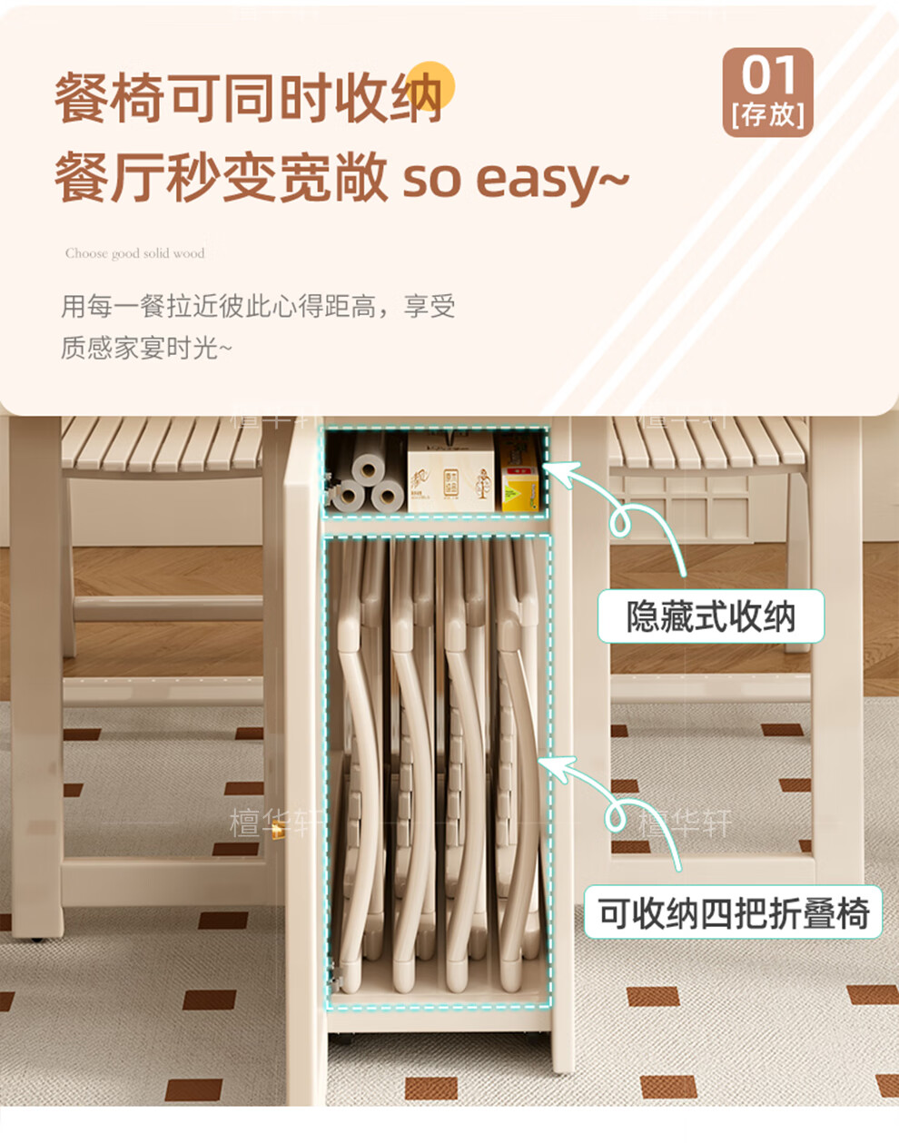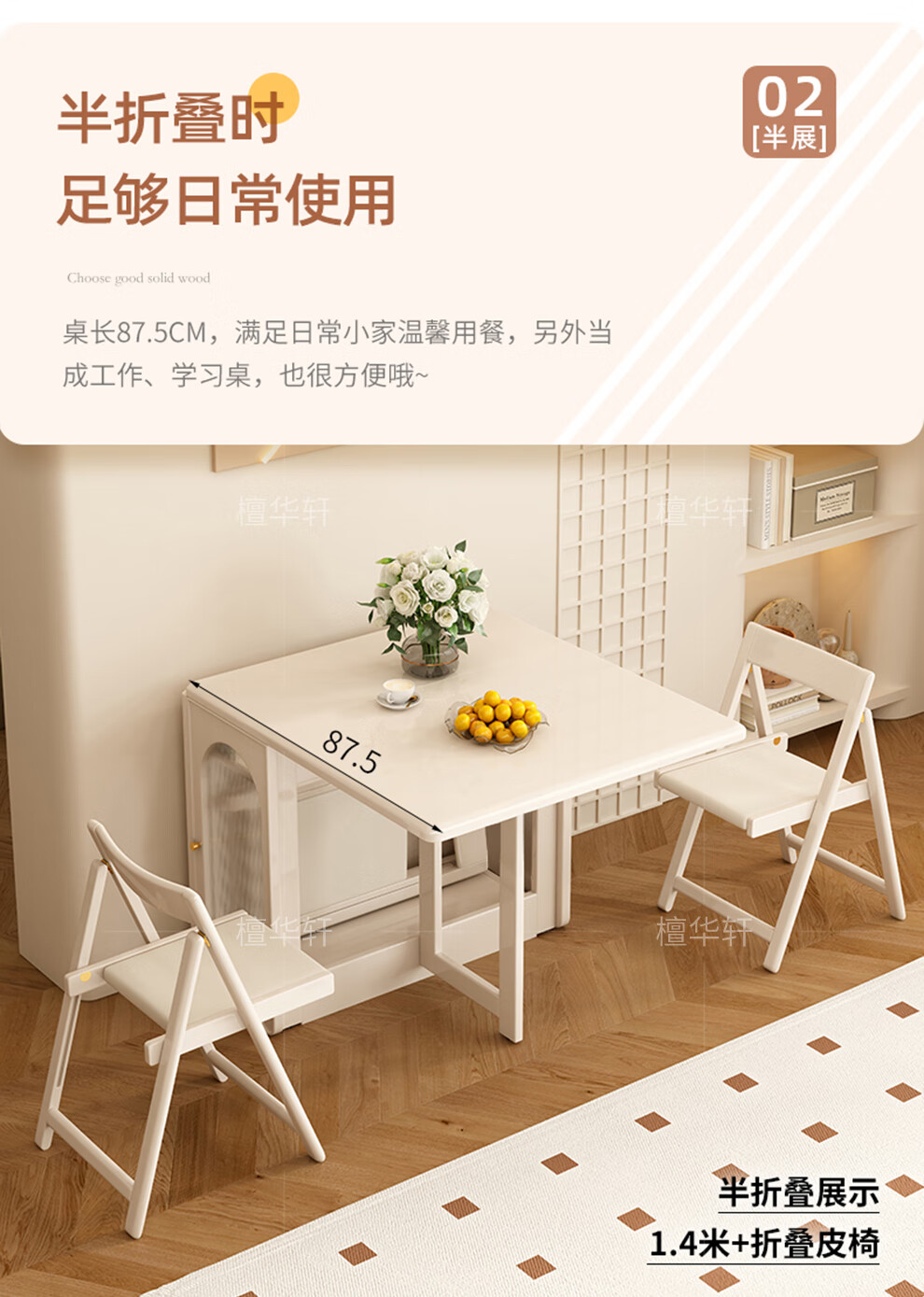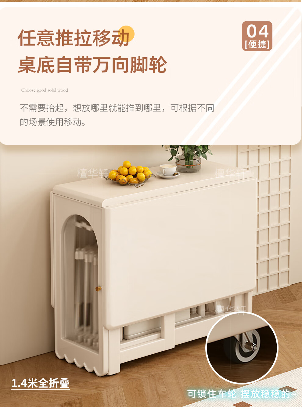 Tan Hua Xuan all solid wood folding dining table and sideboard integrated small apartment cream style dining table with lights and wheels white oak table 1.4m folding dining table + folding leather chairs x4