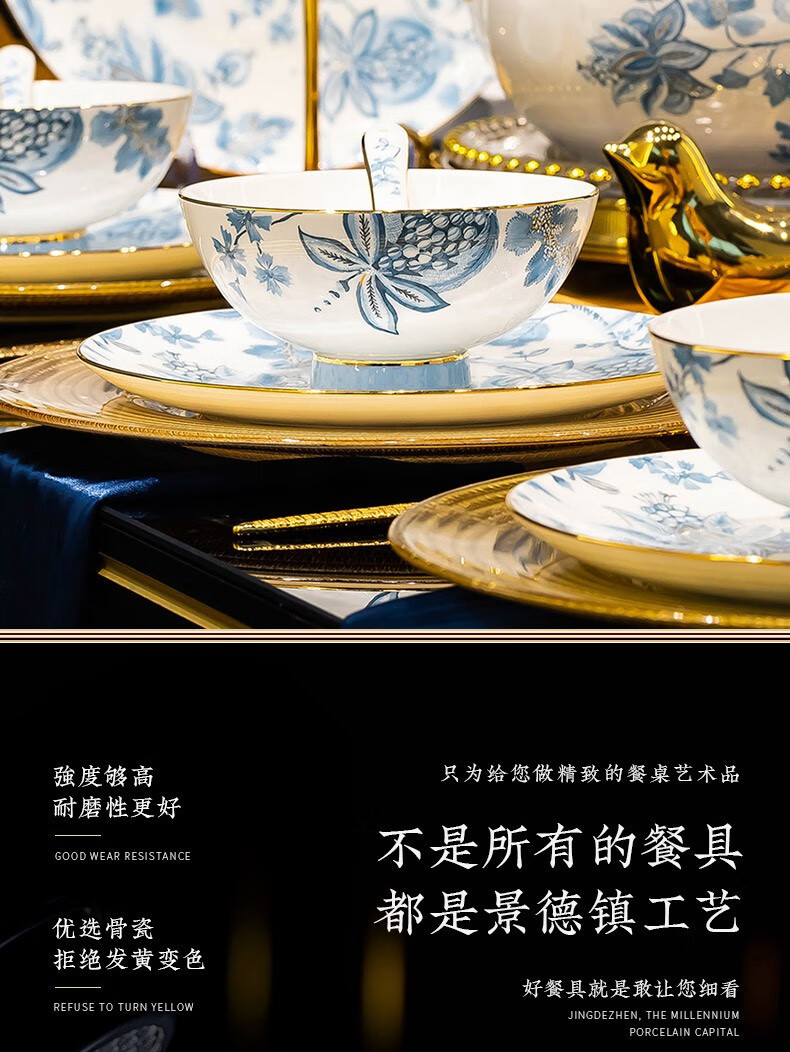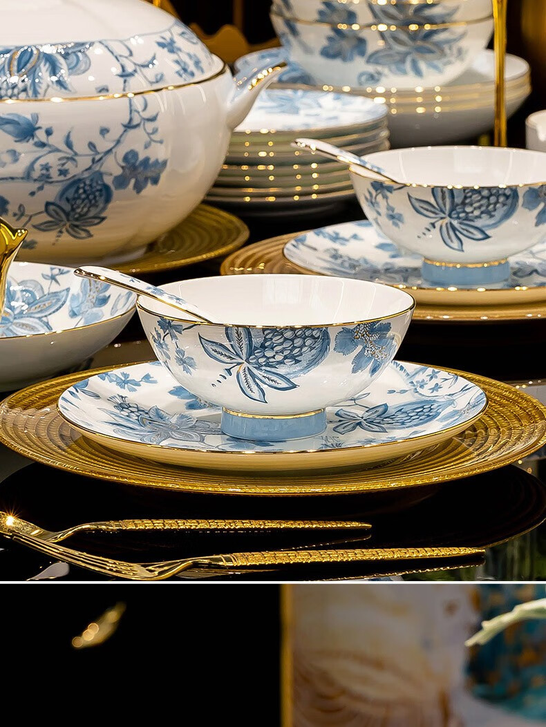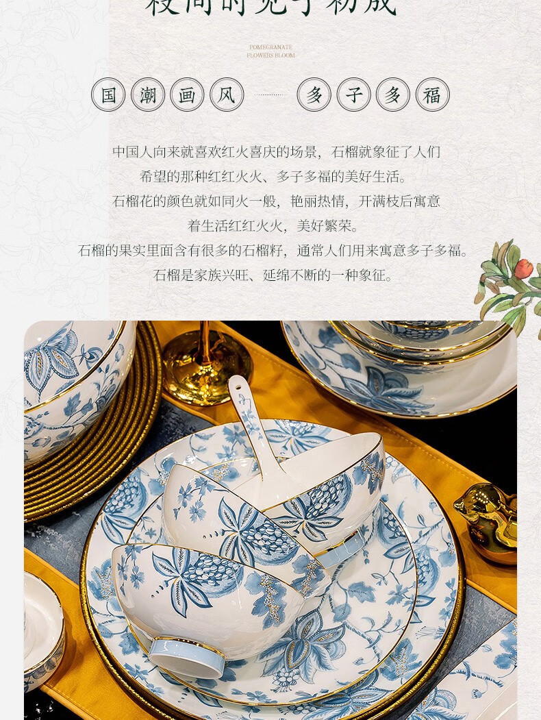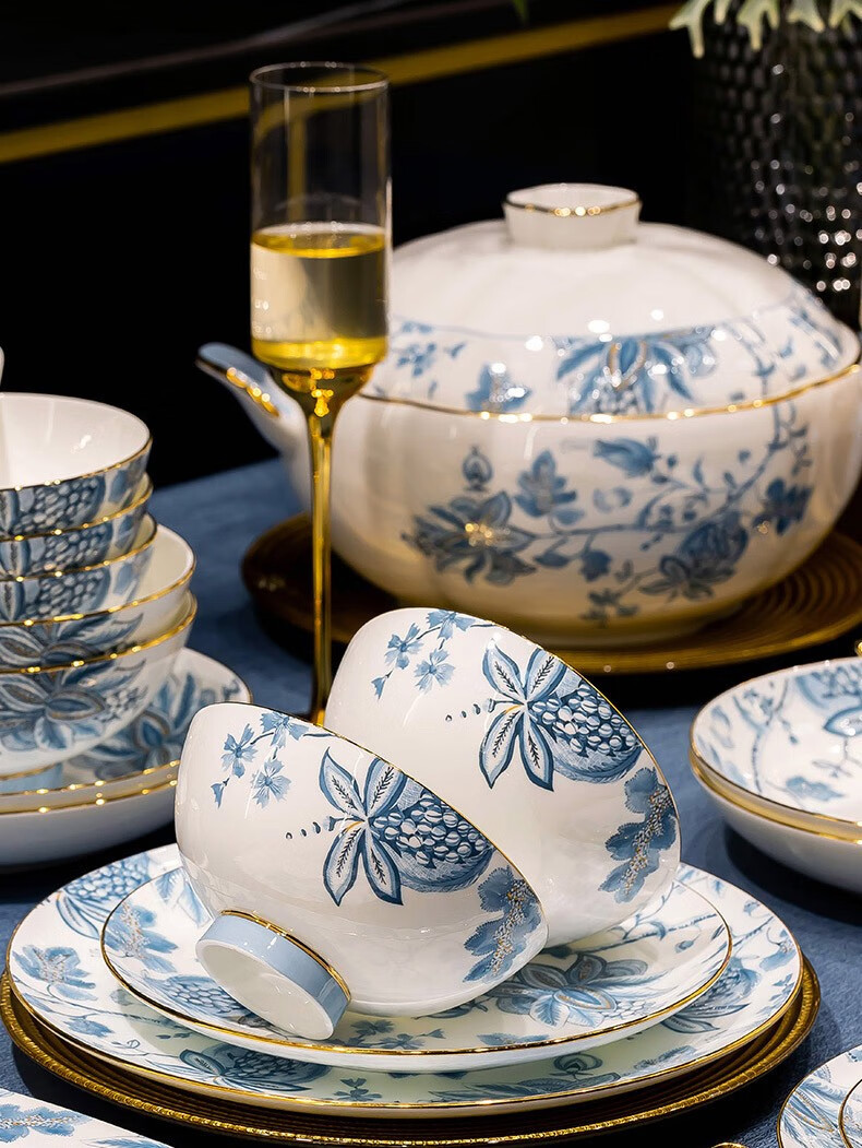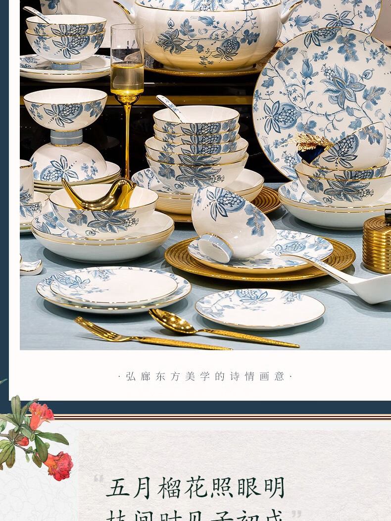 Honglang 2023 new style Chinese tableware and dishes set high-end bone china Jingdezhen new home moving and wedding gift bowls 70 pomegranate flowers (high-end gift packaging)
