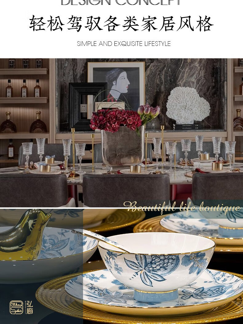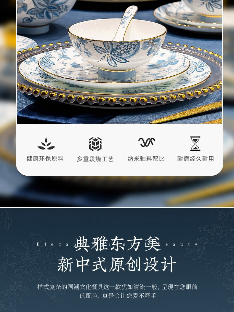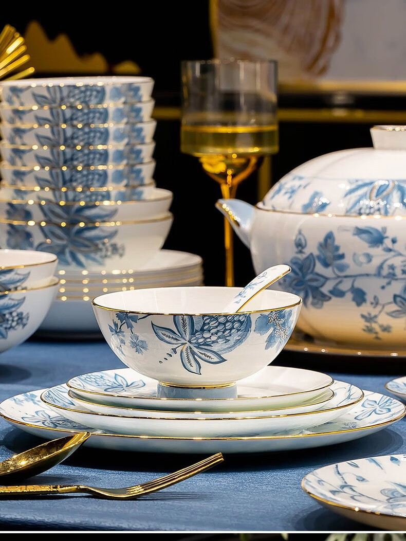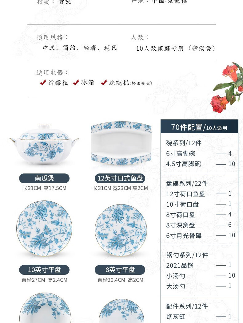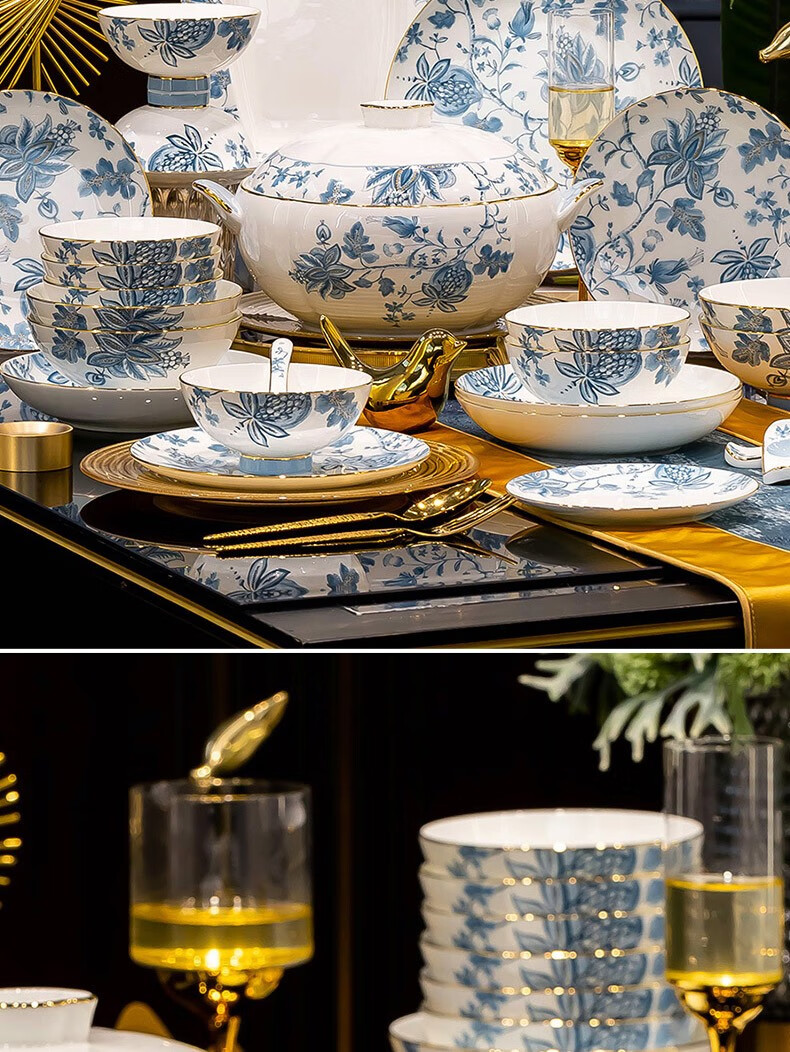 Honglang 2023 new style Chinese tableware and dishes set high-end bone china Jingdezhen new home moving and wedding gift bowls 70 pomegranate flowers (high-end gift packaging)
