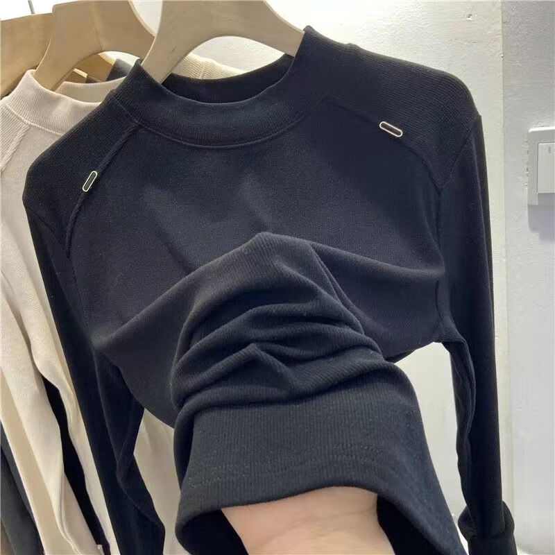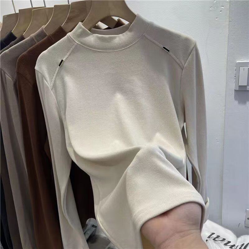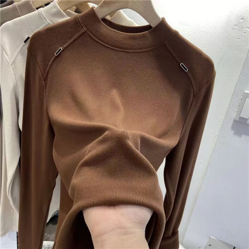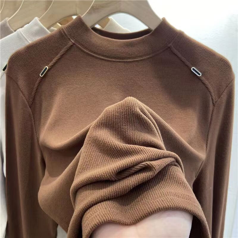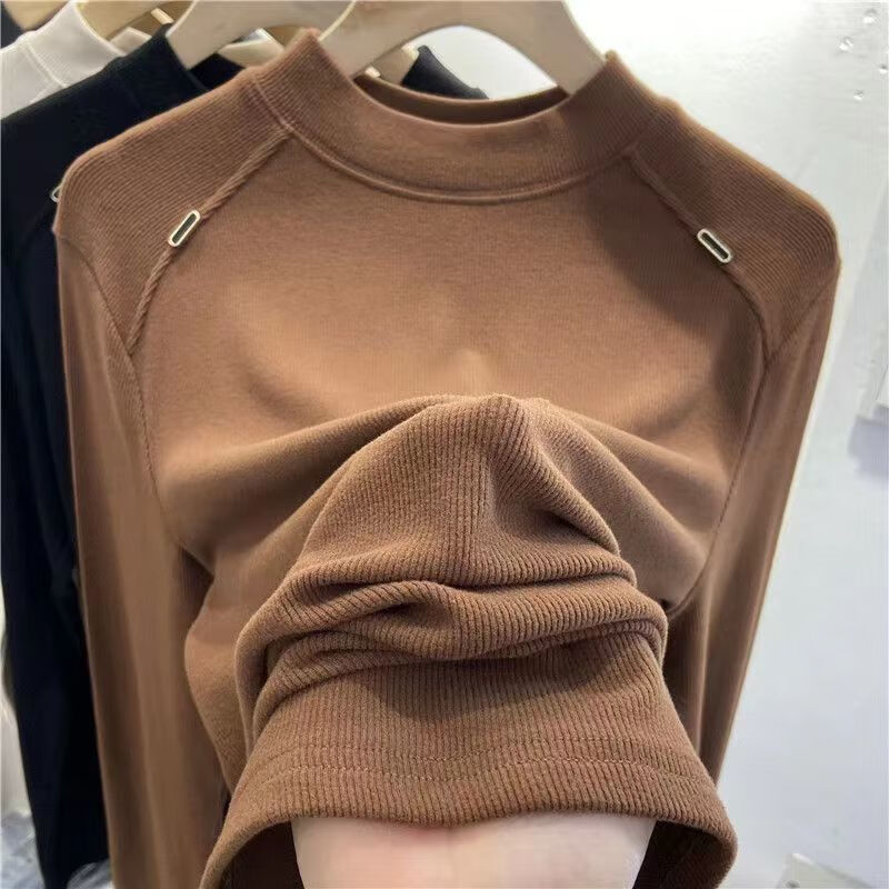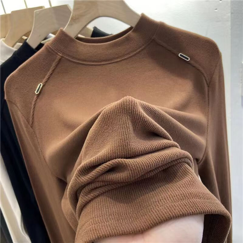 Luo Dada bottoming shirt for women in autumn and winter new casual round neck slimming long-sleeved T-shirt for women with warm top, brown M, recommended 85-100 pounds