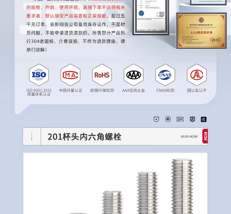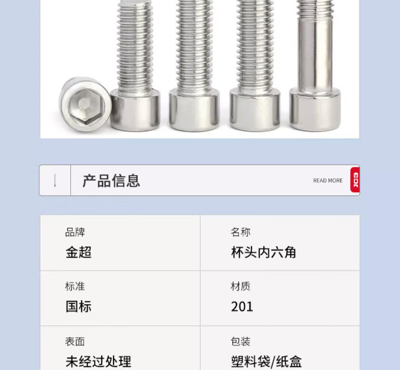 Jinchao 201 stainless steel cup head hexagonal screw GB70 cylindrical head bolt screw M4M5M6M8M10M12 M8*50 (10 pieces)
