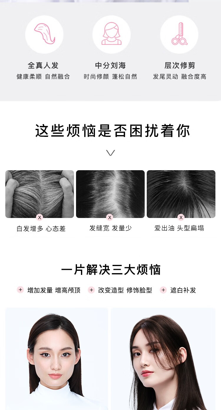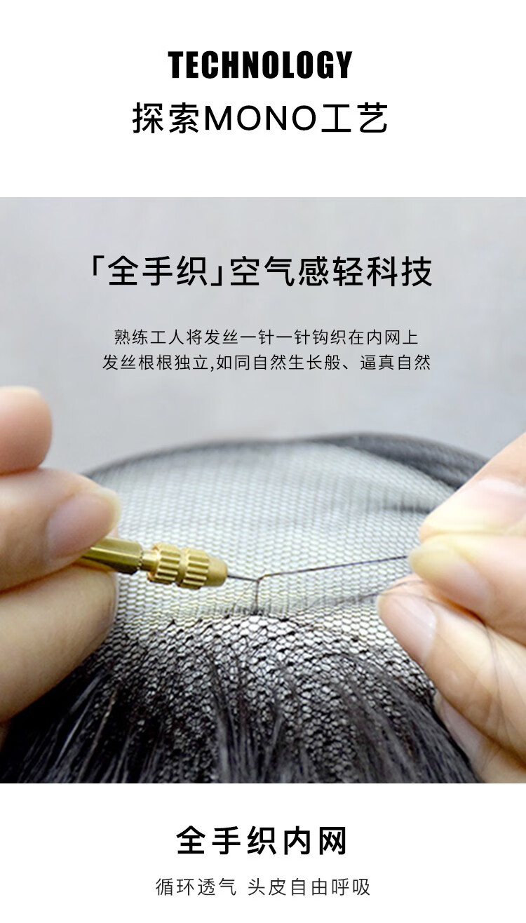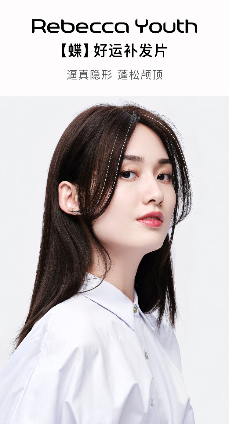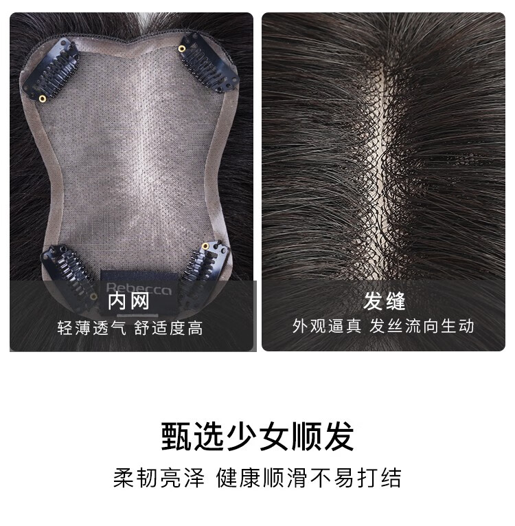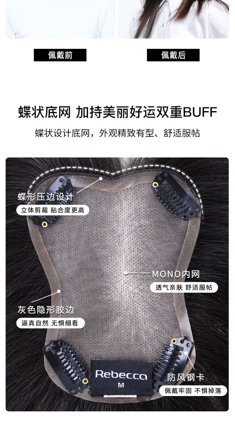 Rebecca wig for women, full human hair wig piece, butterfly shape on top of head, hand-woven MONO net, free split seam to cover white hair, replacement piece, center-parted bangs, natural black 25cm, fully hand-woven craftsmanship