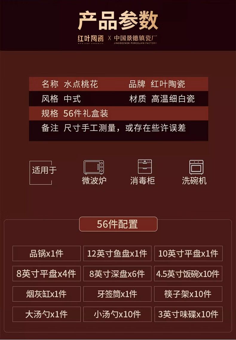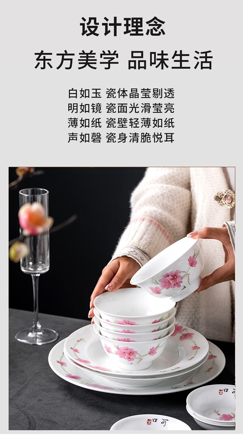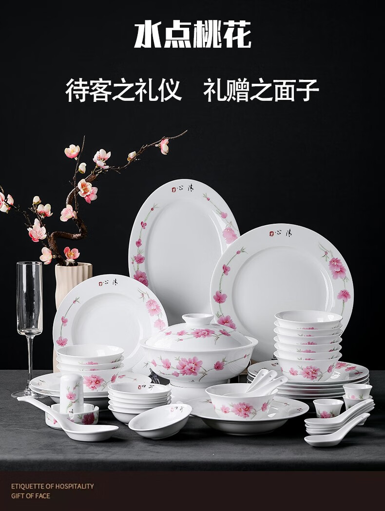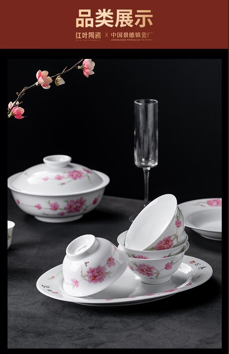 Hongye (RL) Chinese porcelain Jingdezhen ceramic tableware bowls and dishes set bowls and dishes gift box Chinese high-end high-temperature overglaze color water-dotted peach blossom 56 pieces