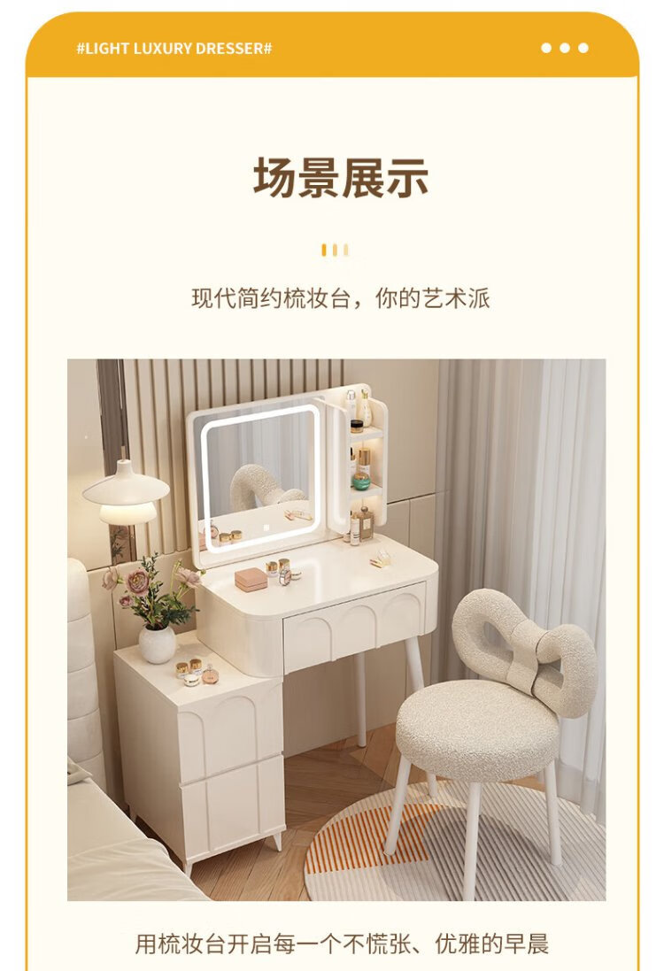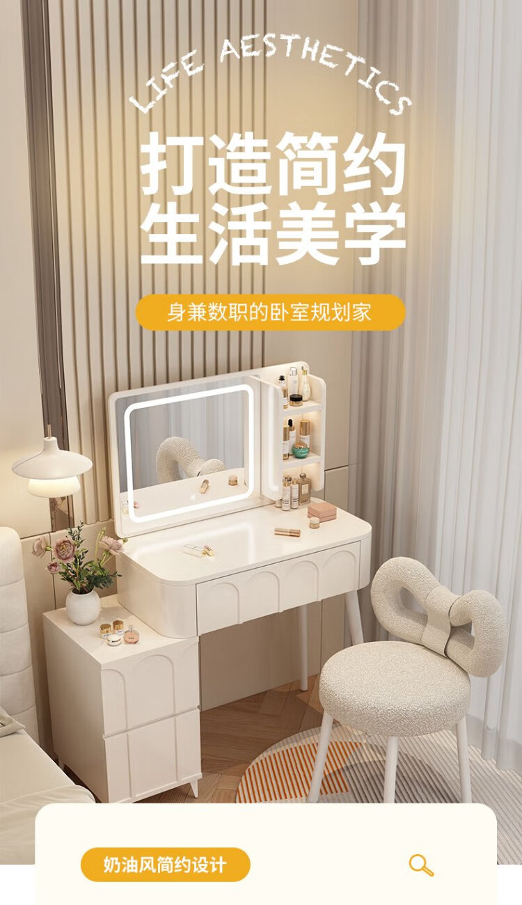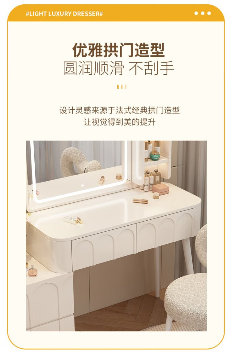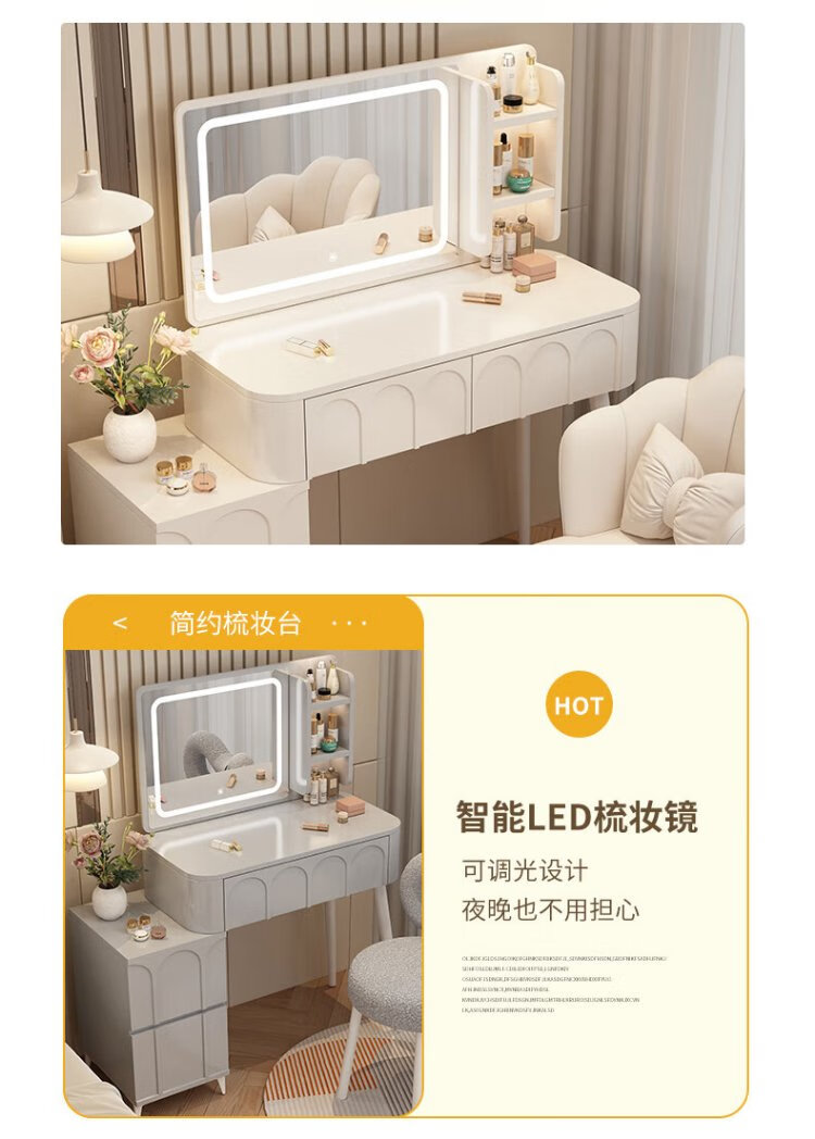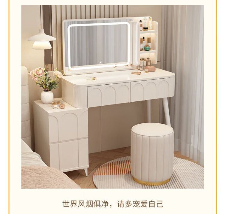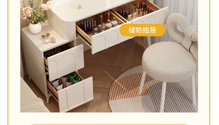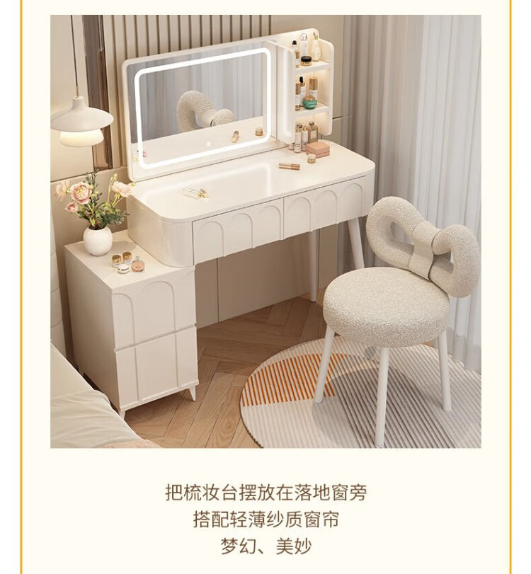 DUMANNI Cream Style Dressing Table Bedroom Modern Simple Small Apartment Solid Wood Dressing Table Desk Cabinet Desk Mirror Integrated Cream White 100 Table + Storage Cabinet + Mirror + Petal Chair Complete