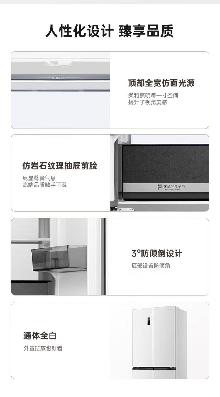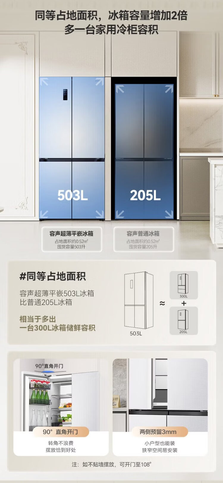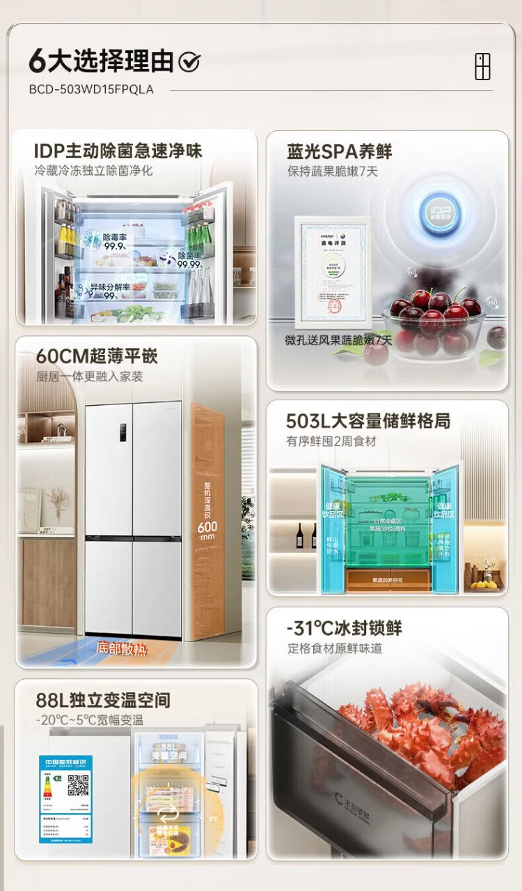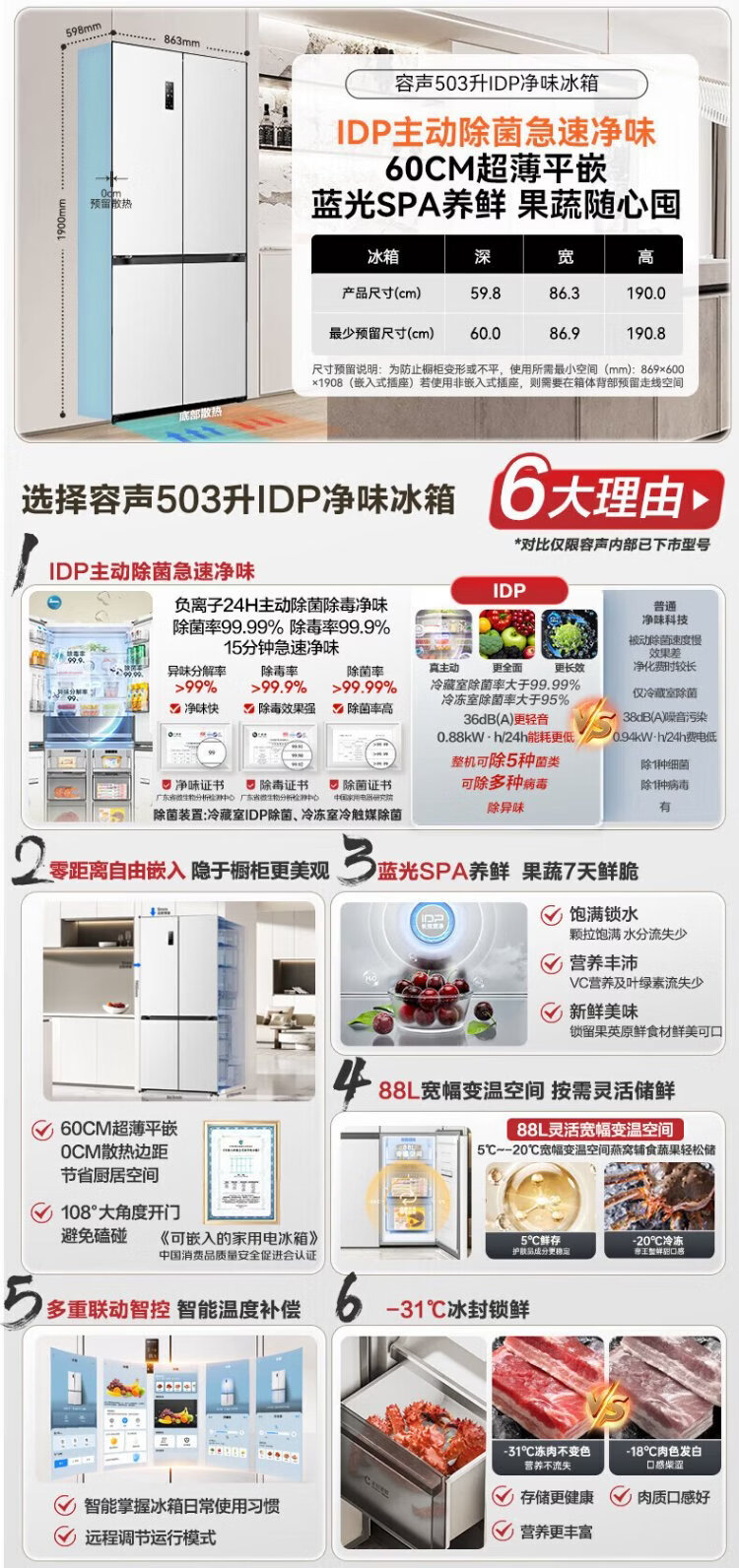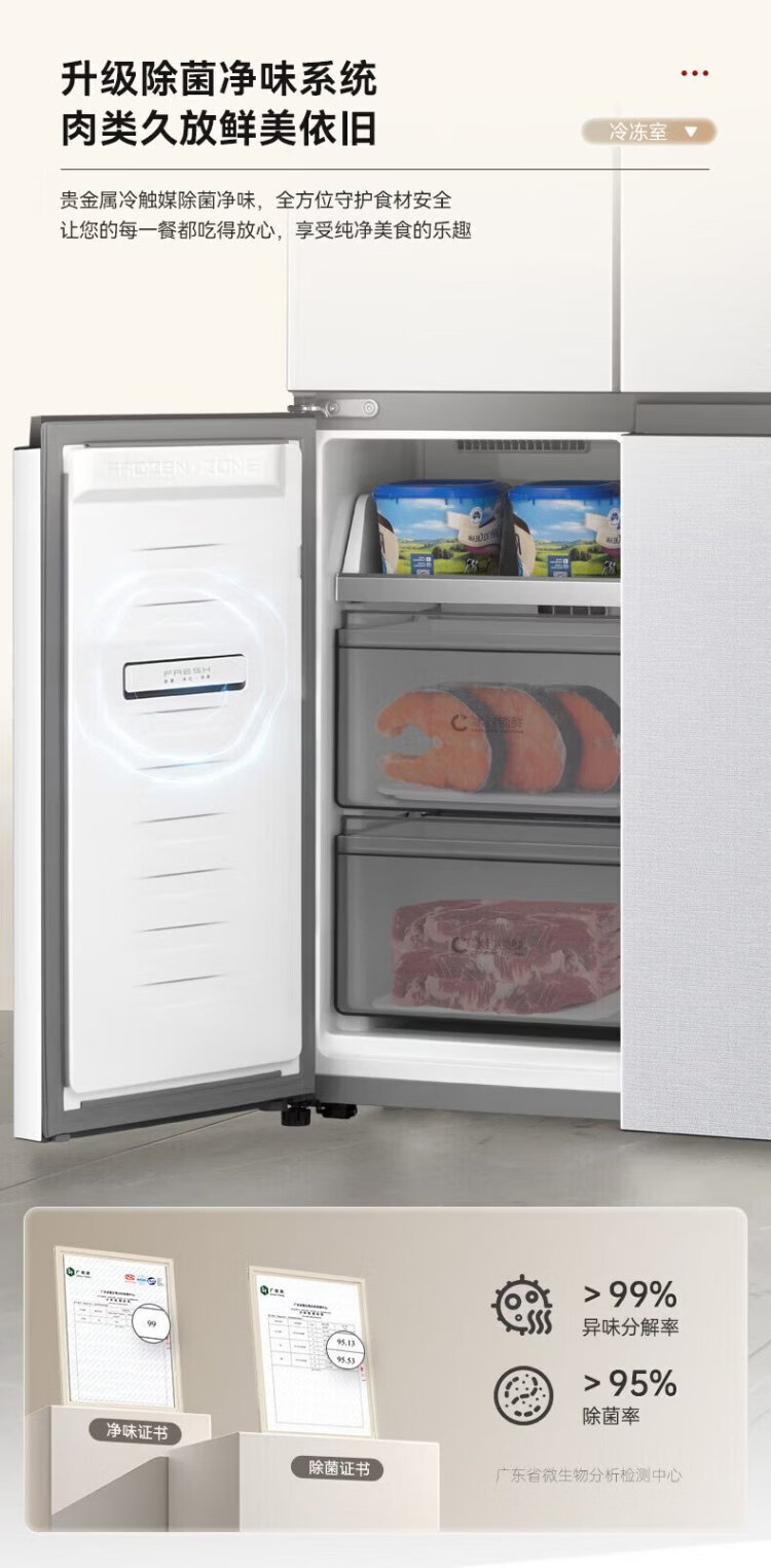 Rongsheng 503pro zero-embedded cross double-open four-door IDP active sterilization extremely fast odor clean ultra-thin refrigerator household first-class energy efficiency variable frequency air-cooled frost-free refrigerator subsidy BCD-503WD15FPQLA white