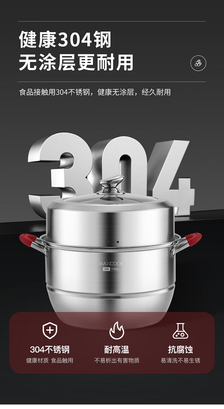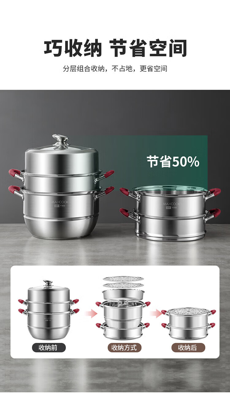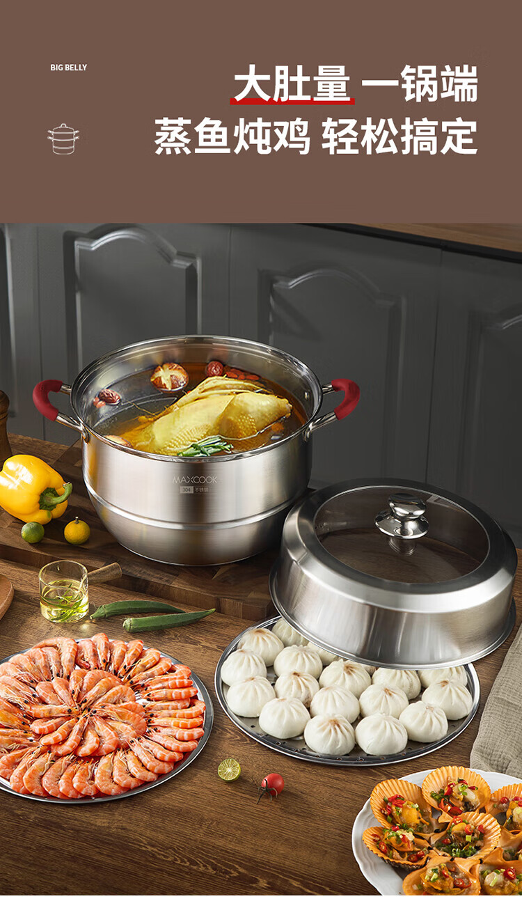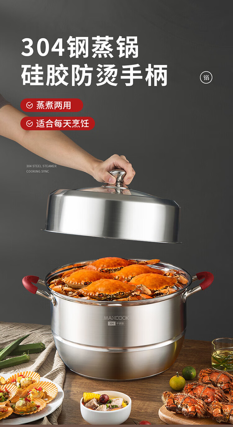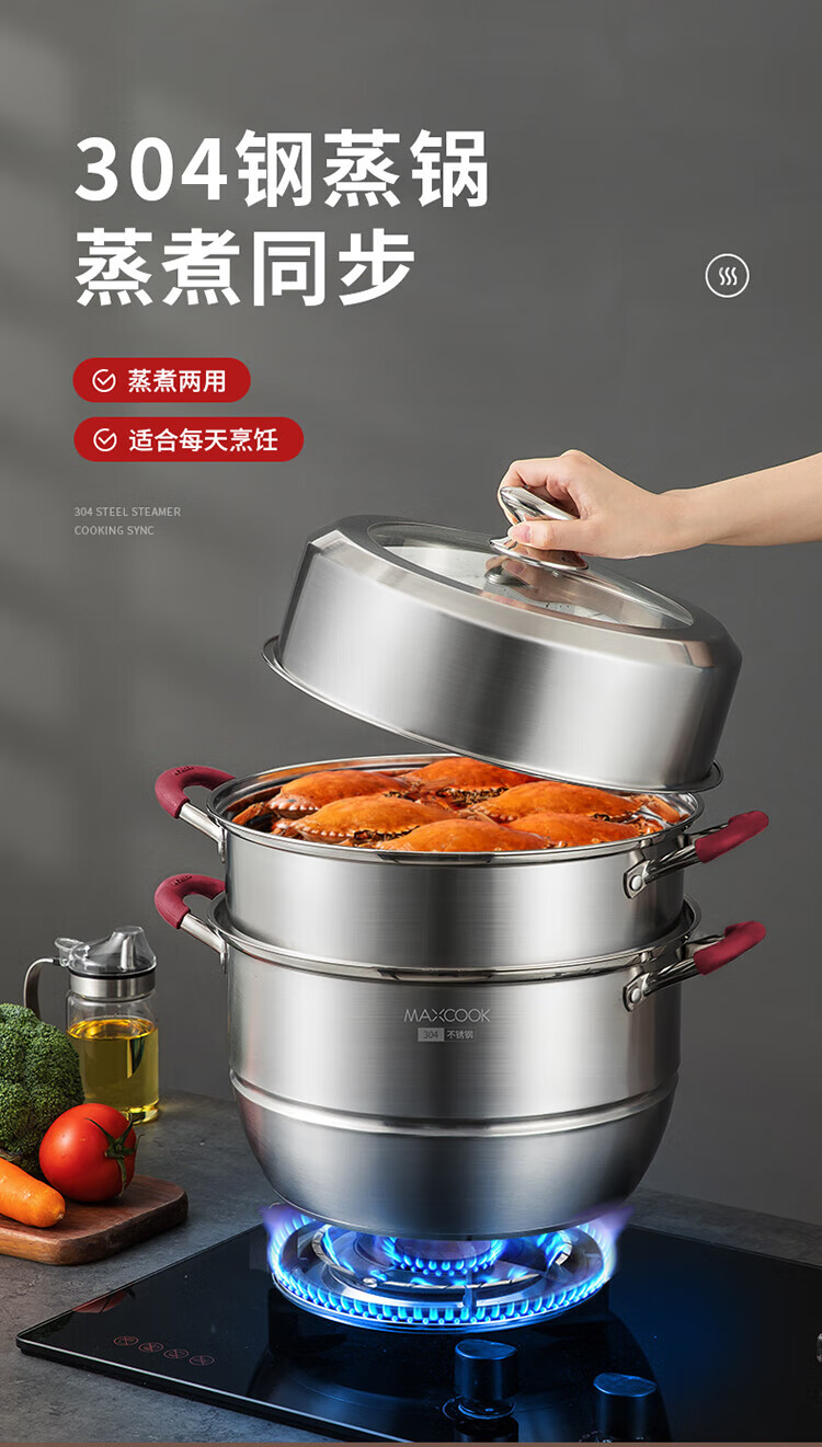 MAXCOOK anti-scalding steamer 304 stainless steel multi-layer steamer thickened multi-bottom soup pot gas electric three-layer MCZ5205 34cm