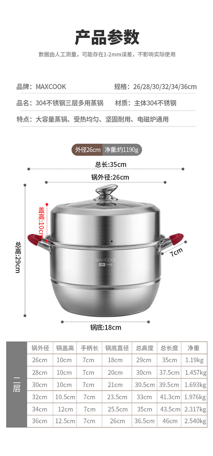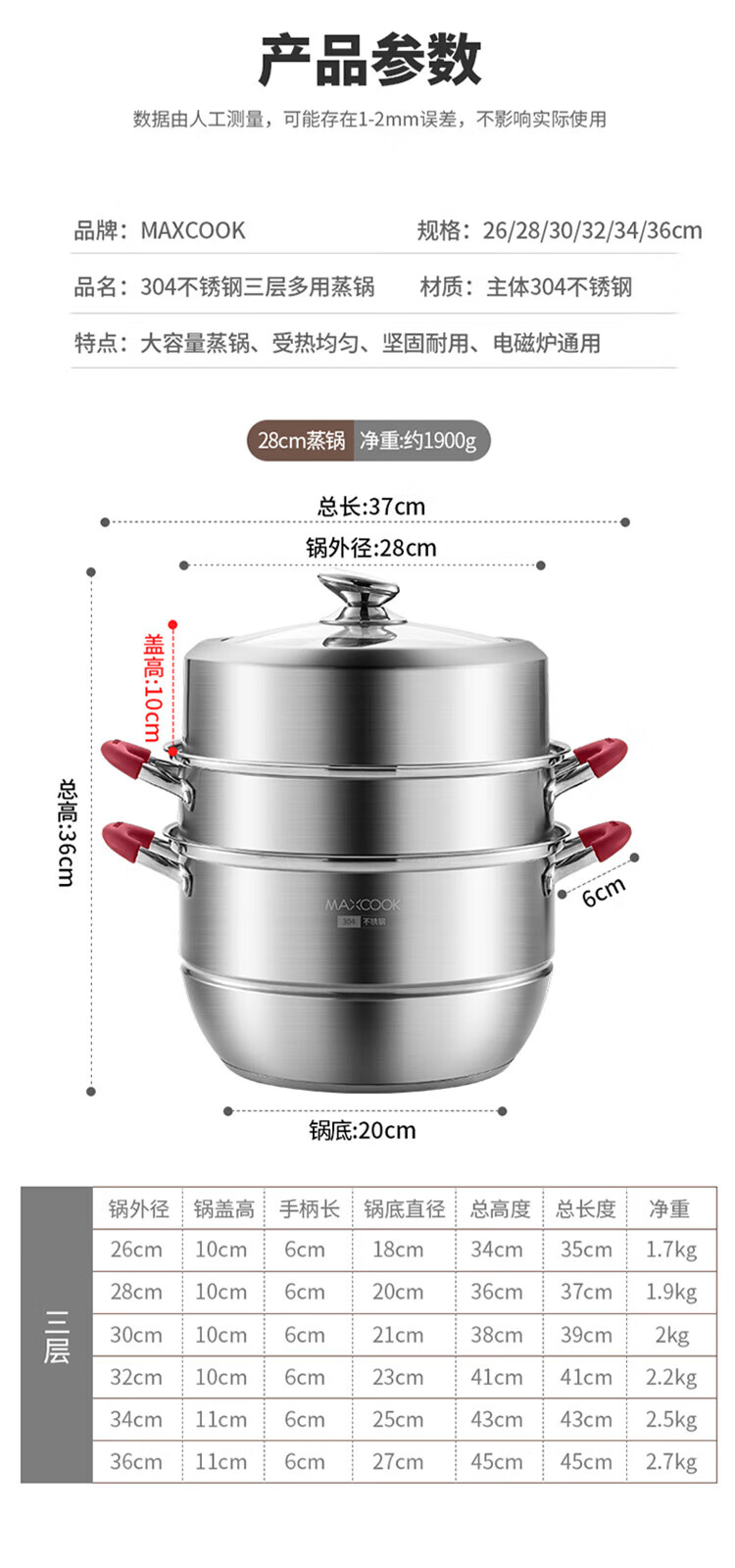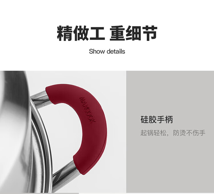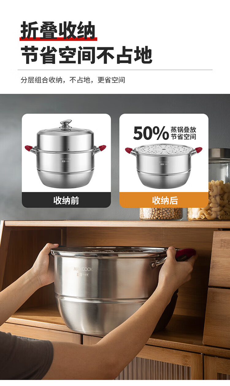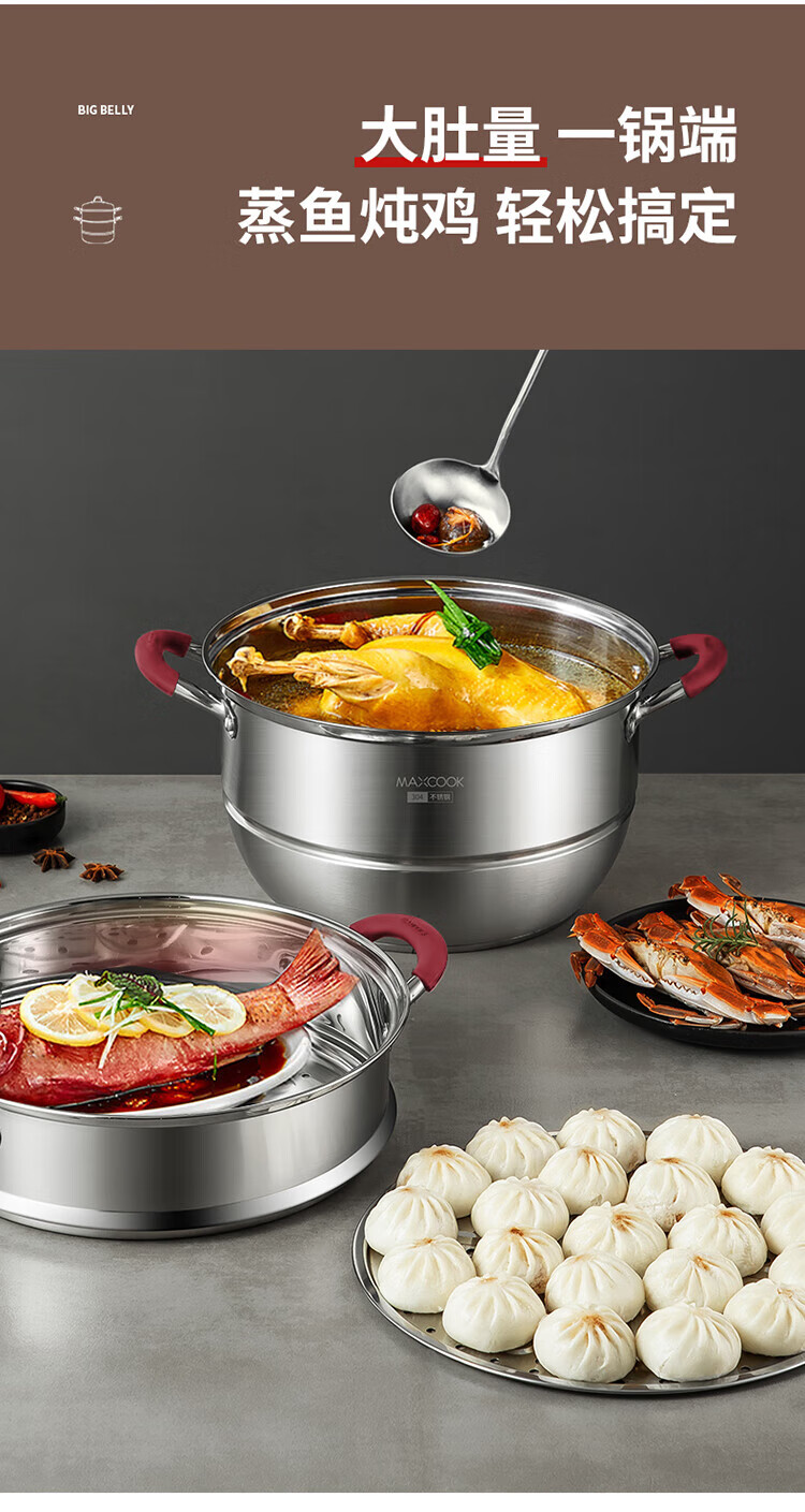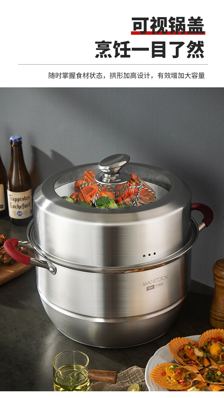 MAXCOOK anti-scalding steamer 304 stainless steel multi-layer steamer thickened multi-bottom soup pot gas electric three-layer MCZ5205 34cm