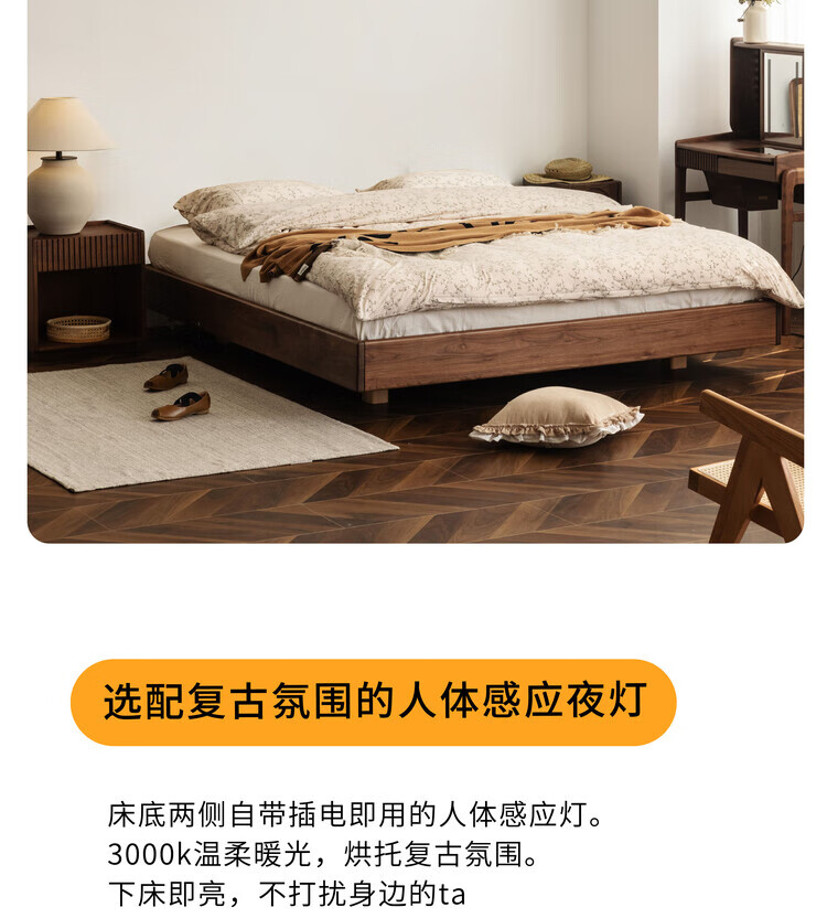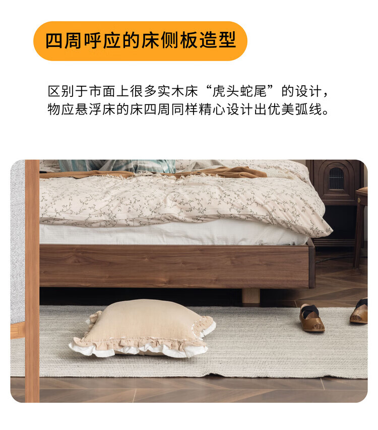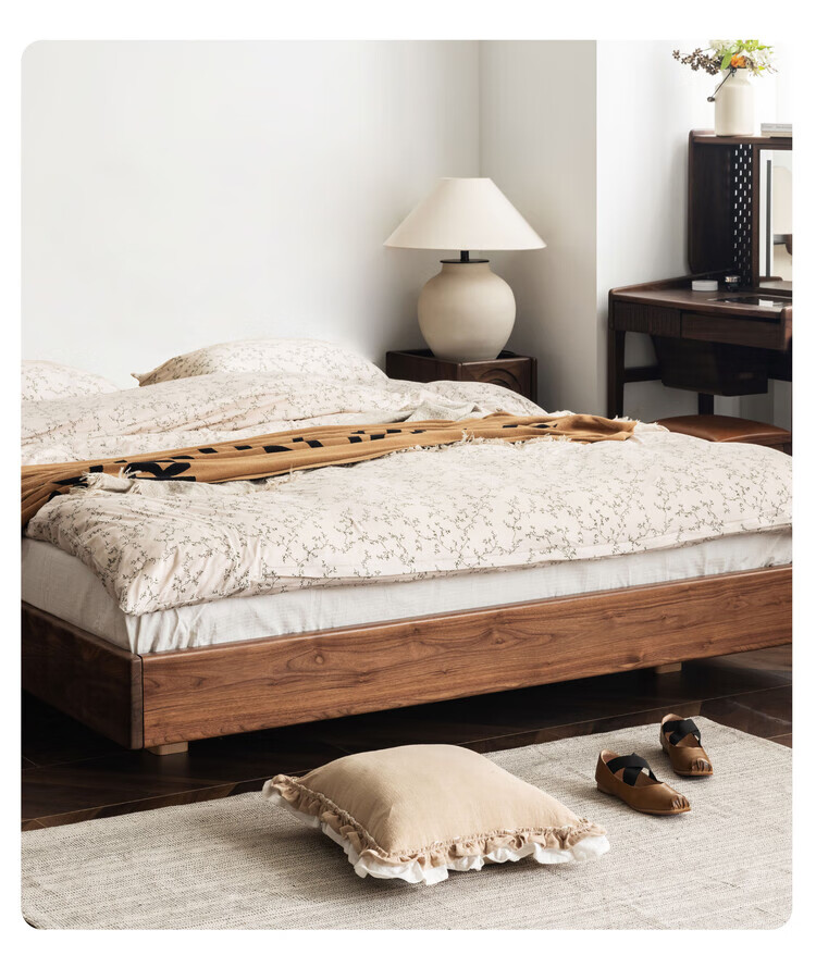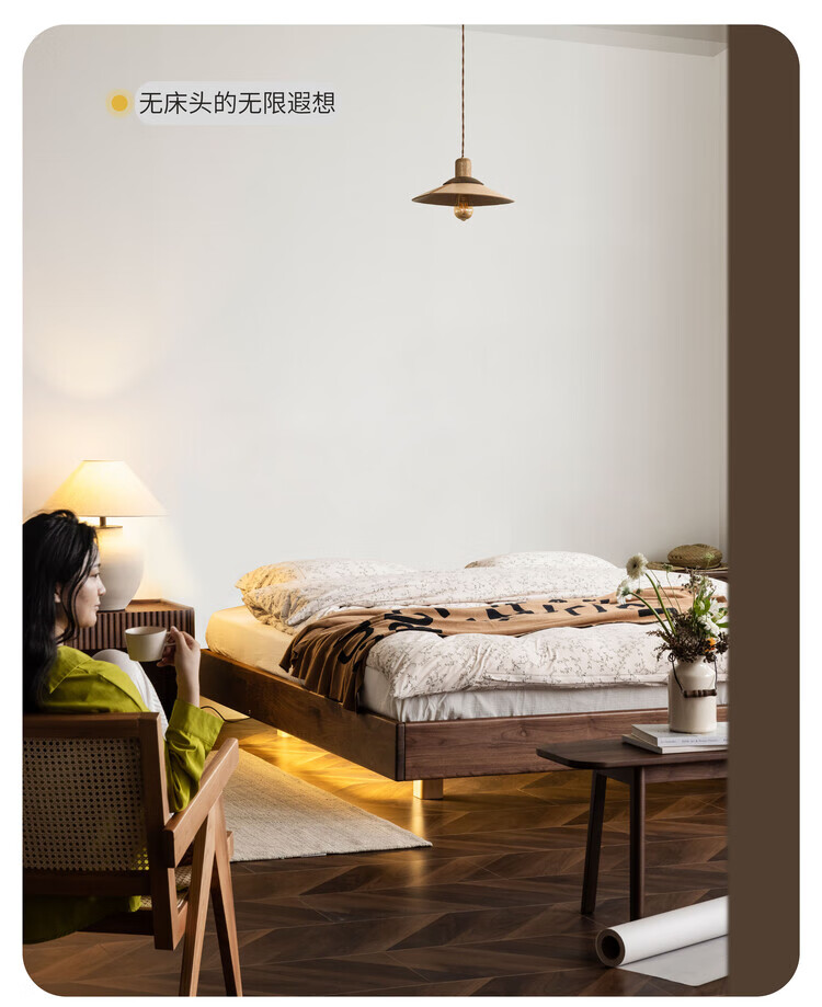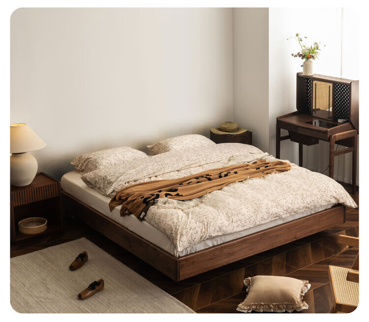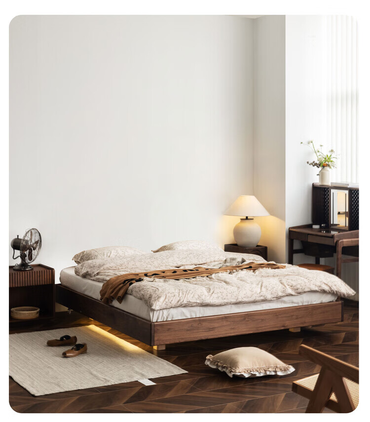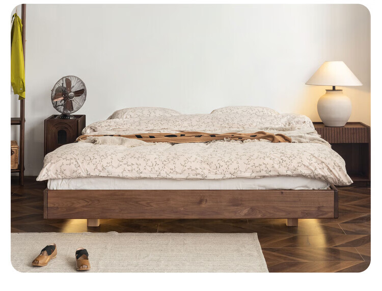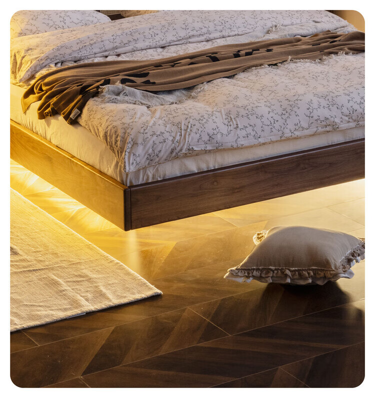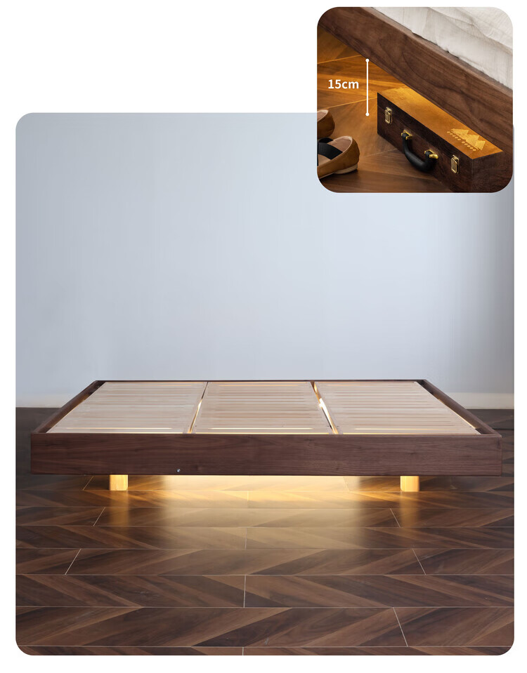 Wuying Japanese-style floating bed without headboard black walnut solid wood double bed Nordic backless tatami short bed with lights three-sided red oak + pine rib frame ready stock 1200mm*2000mm frame structure