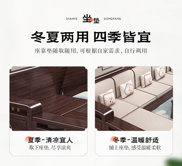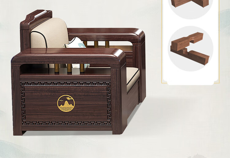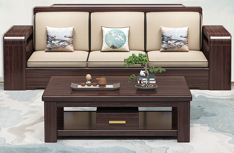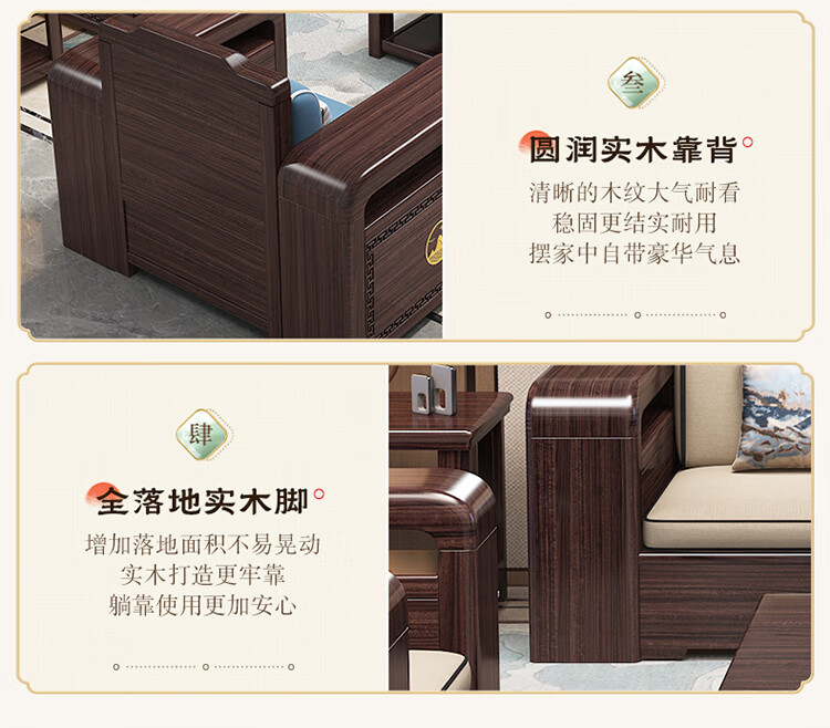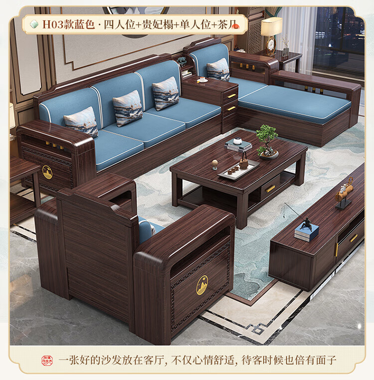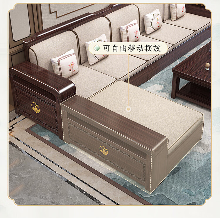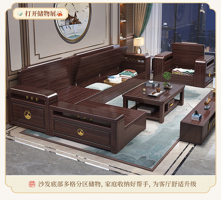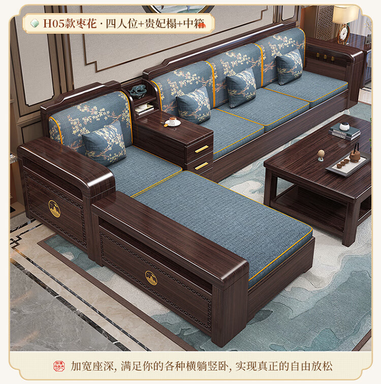 Huiwangfu black gold solid wood sofa new Chinese style modern simple living room sofa combination winter and summer dual-use storage wooden sofa 5 people + imperial concubine couch + middle box