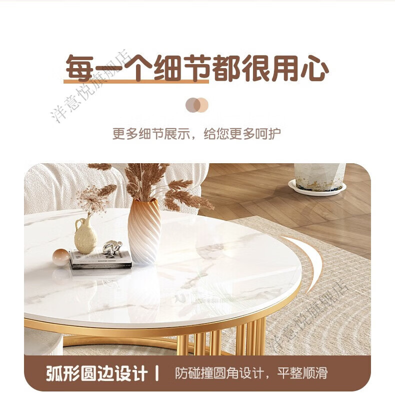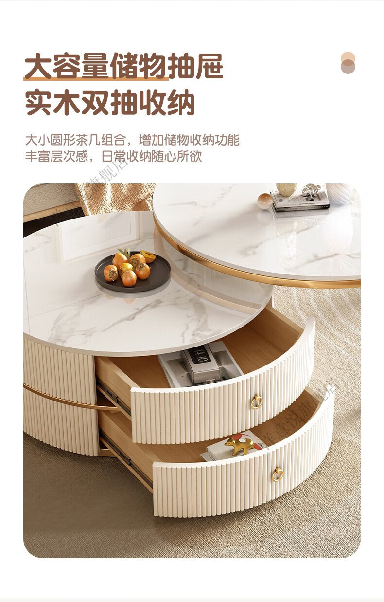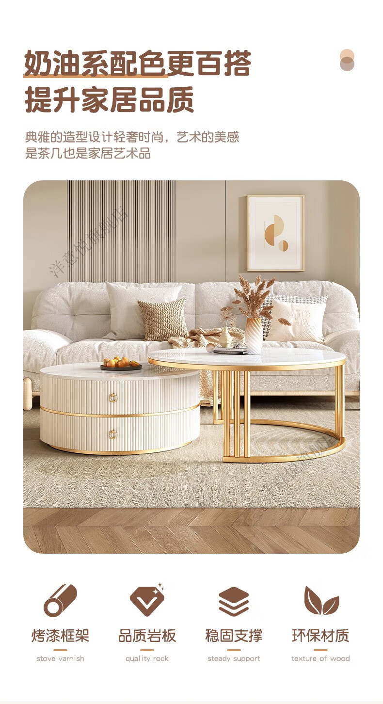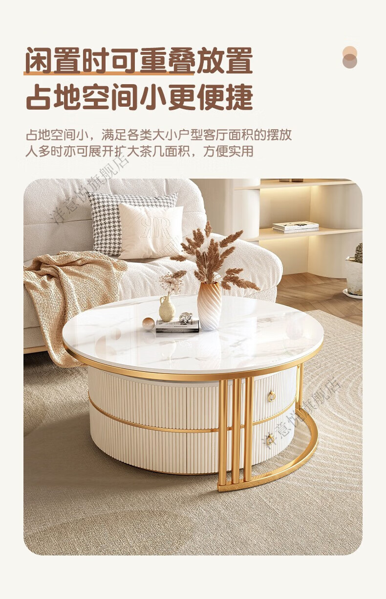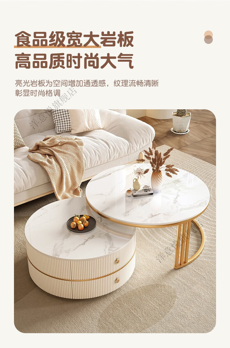 Yangyiyue coffee table TV cabinet living room modern simple small apartment mobile folding round slate small round table cream style glossy snow mountain white rock + snow mountain white rock + gold frame large 80cm*43cm + small 60cm*35cm