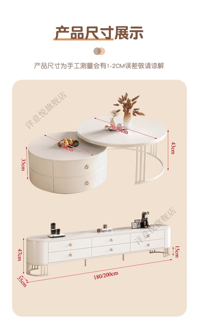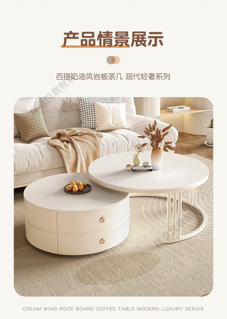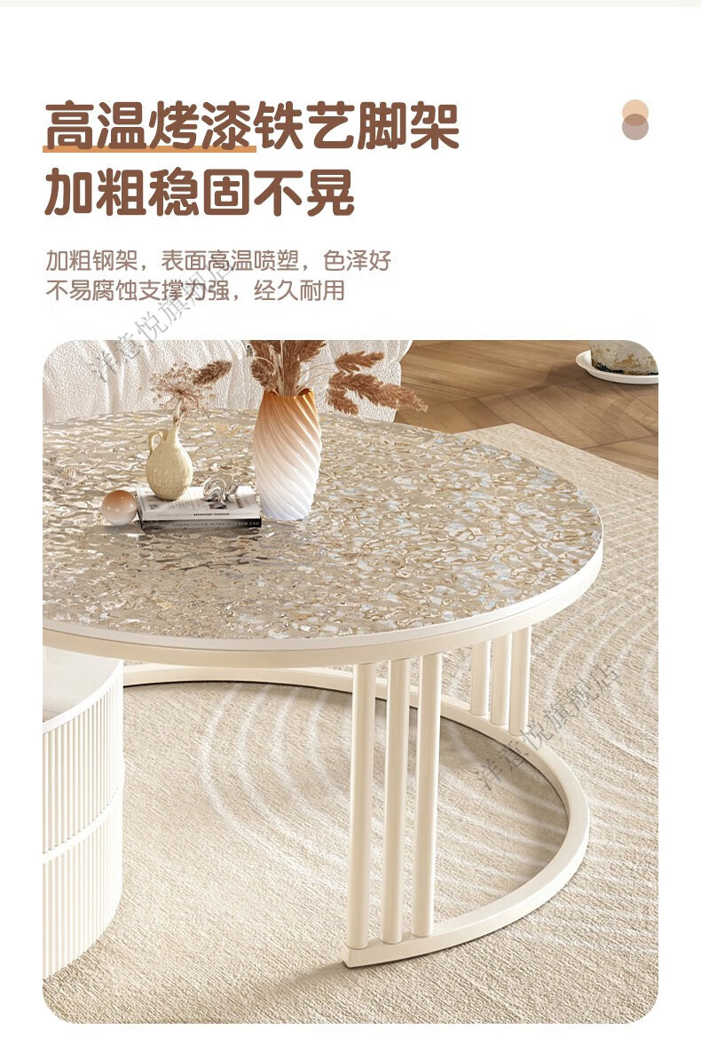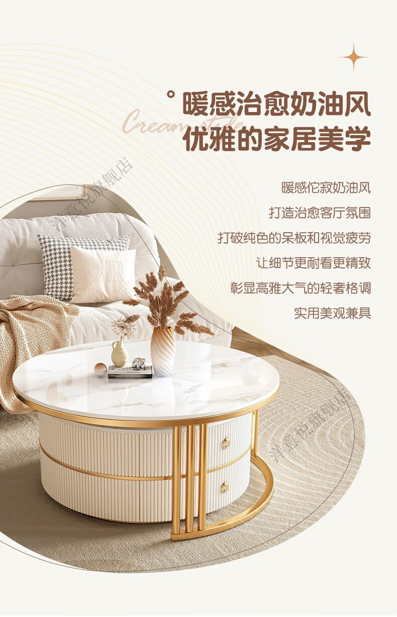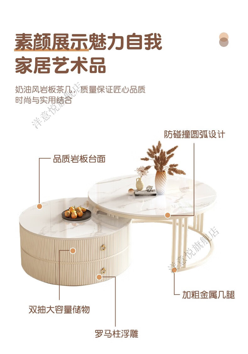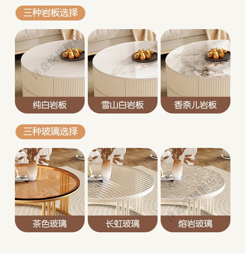 Yangyiyue coffee table TV cabinet living room modern simple small apartment mobile folding round slate small round table cream style glossy snow mountain white rock + snow mountain white rock + gold frame large 80cm*43cm + small 60cm*35cm