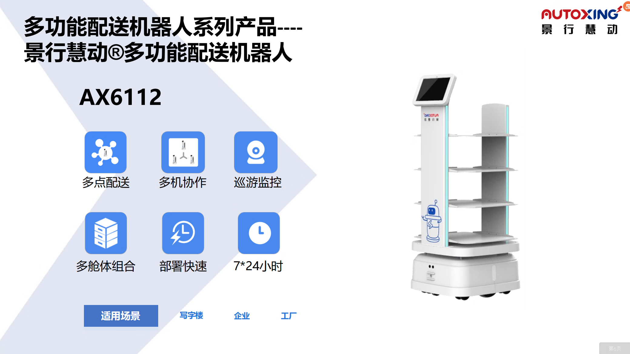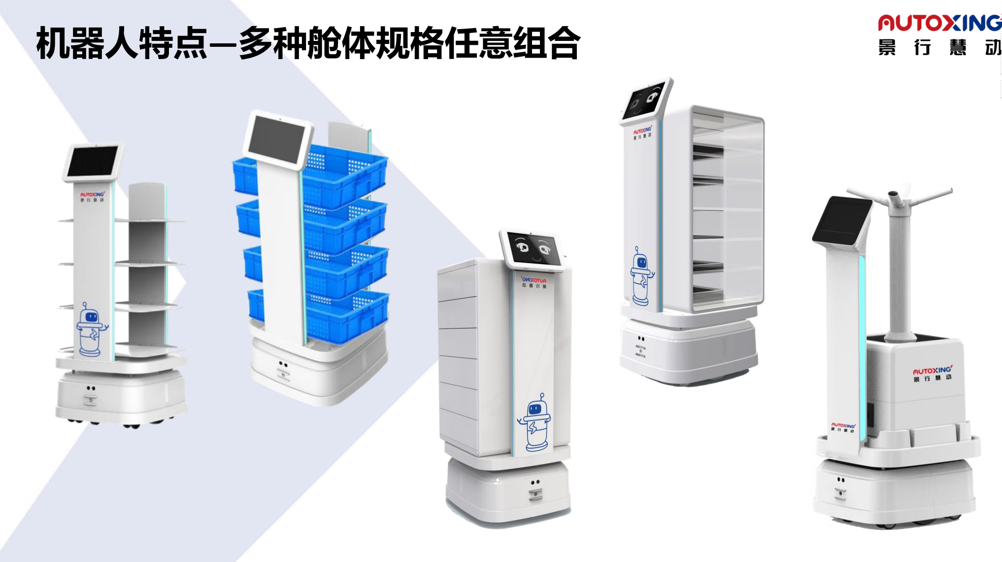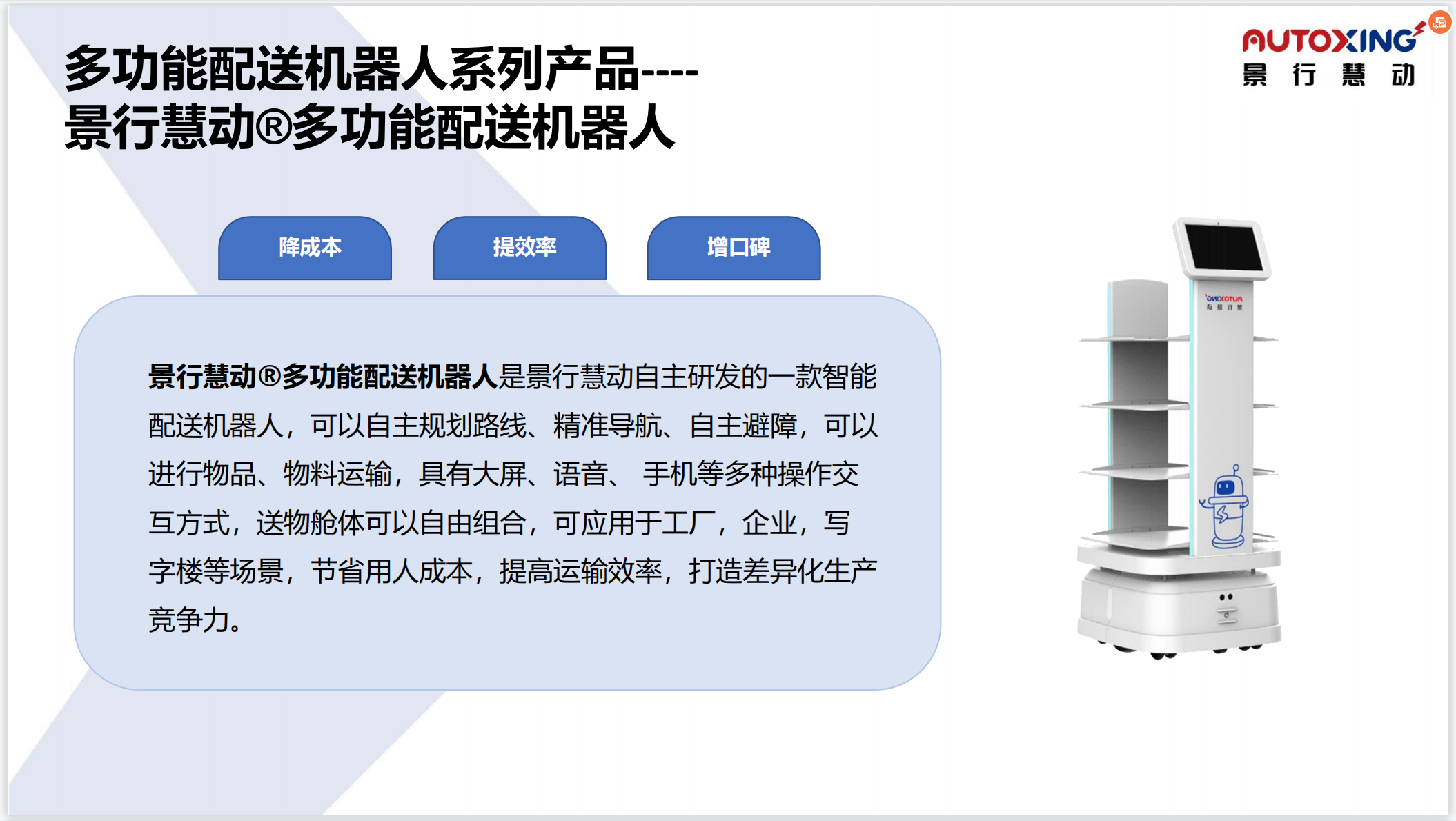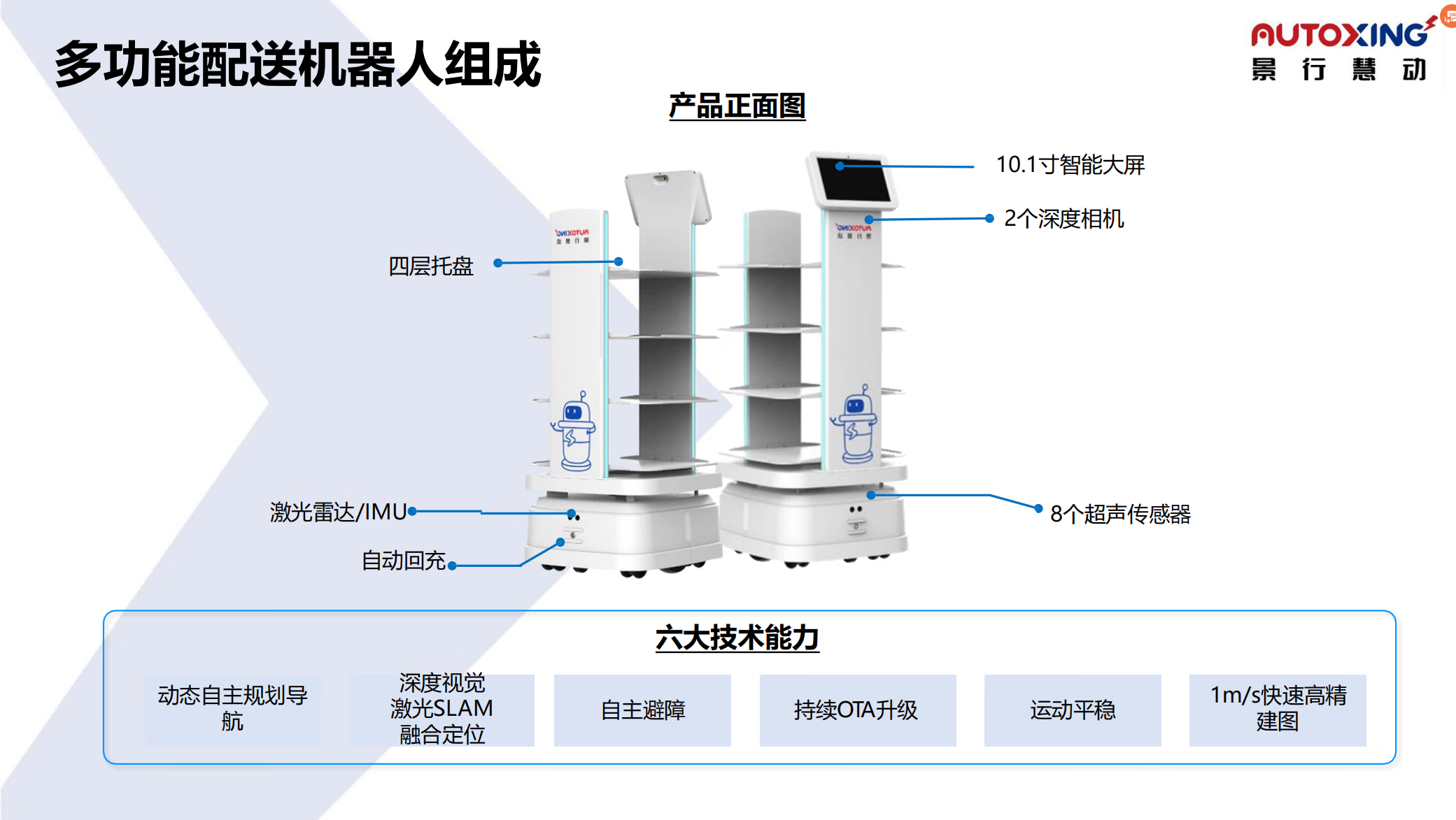 The delivery robot has a large load-bearing capacity, can be customized, and can be mounted on an elevator. It is suitable for various delivery scenarios. White