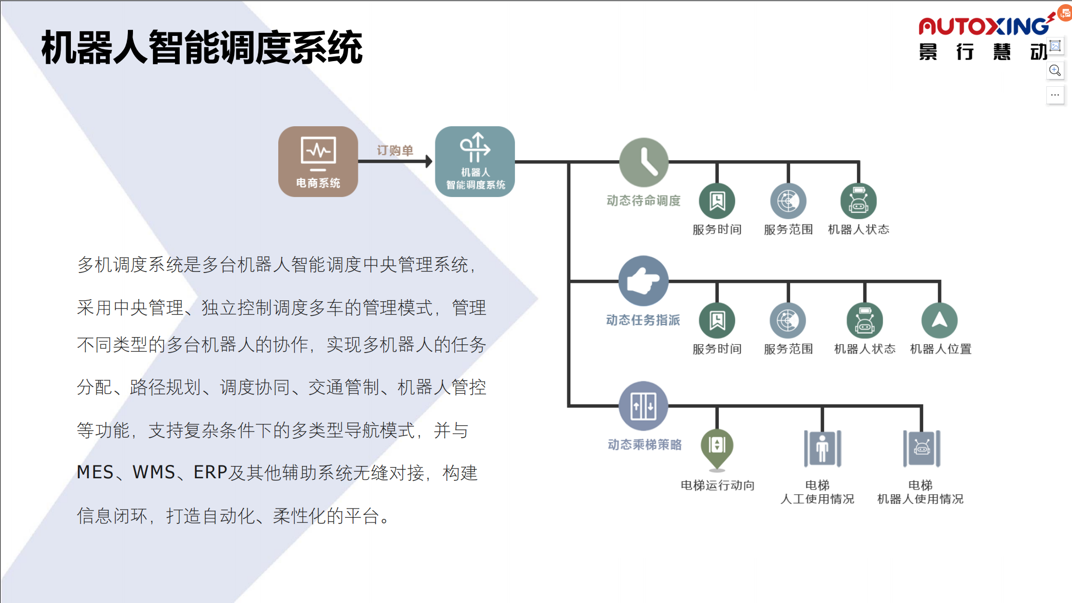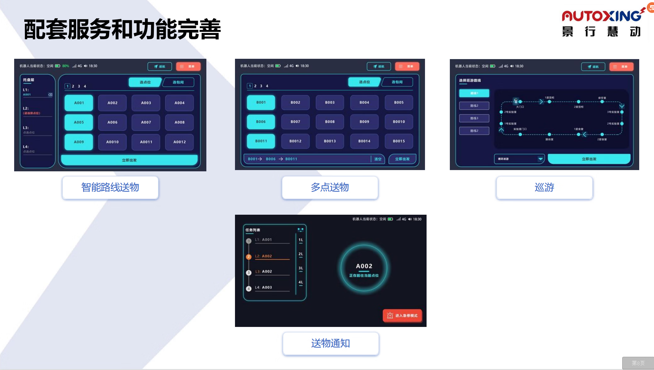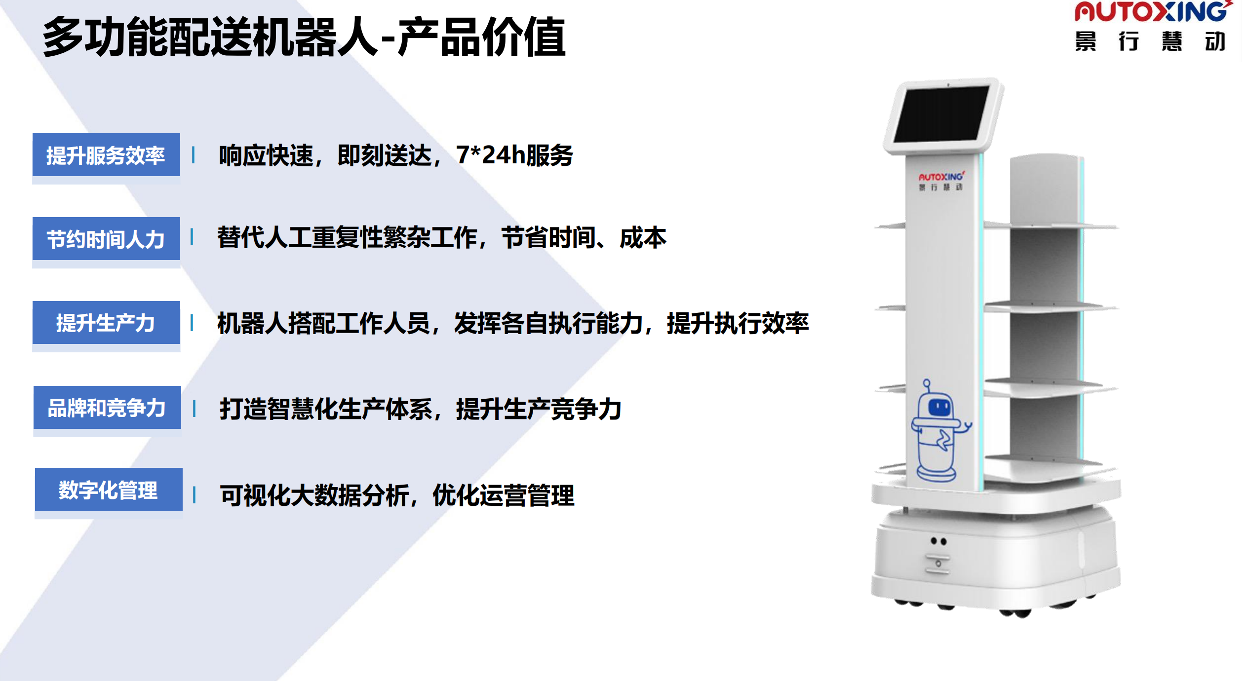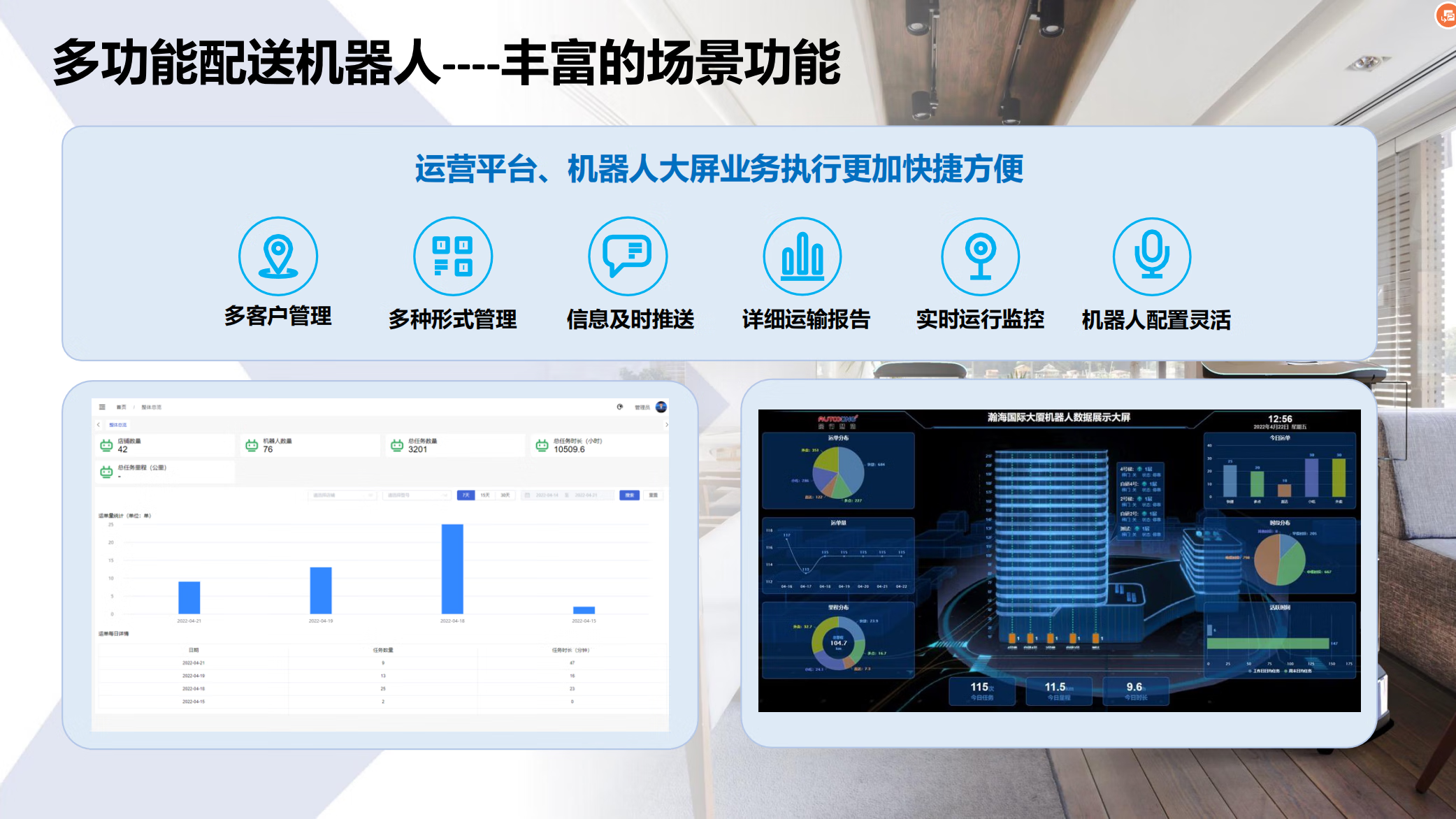 The delivery robot has a large load-bearing capacity, can be customized, and can be mounted on an elevator. It is suitable for various delivery scenarios. White