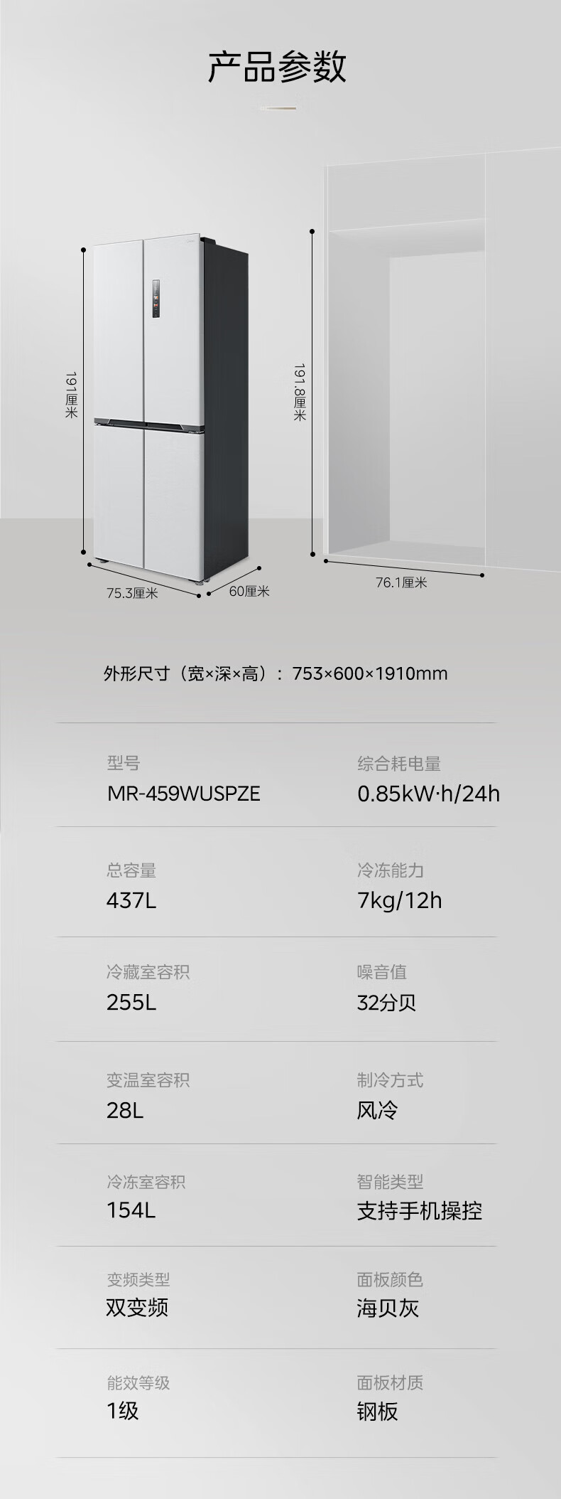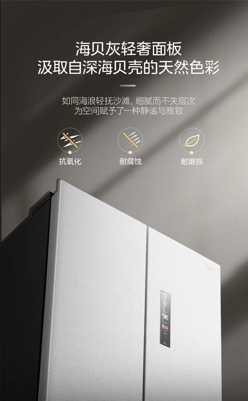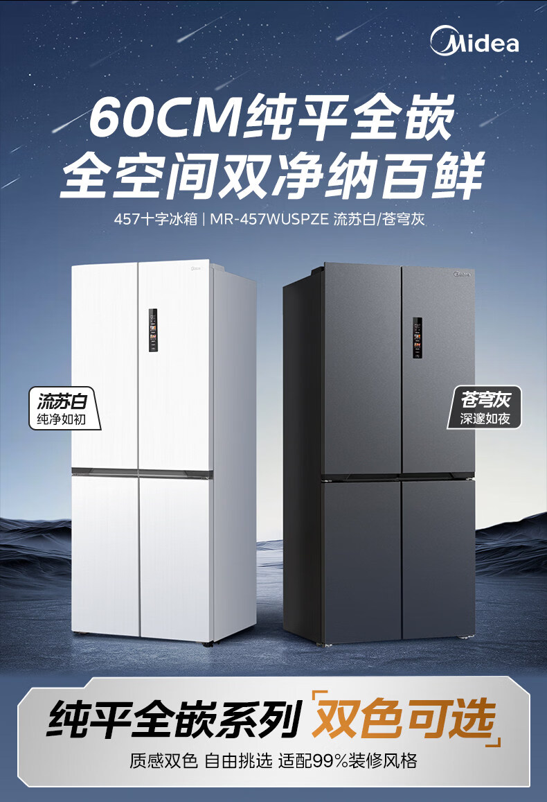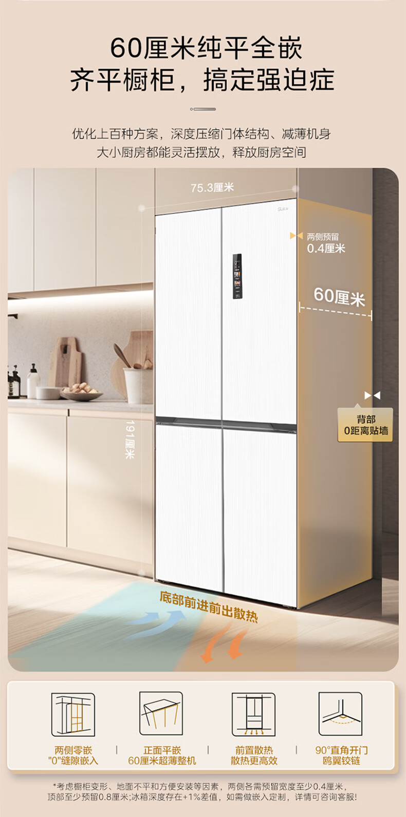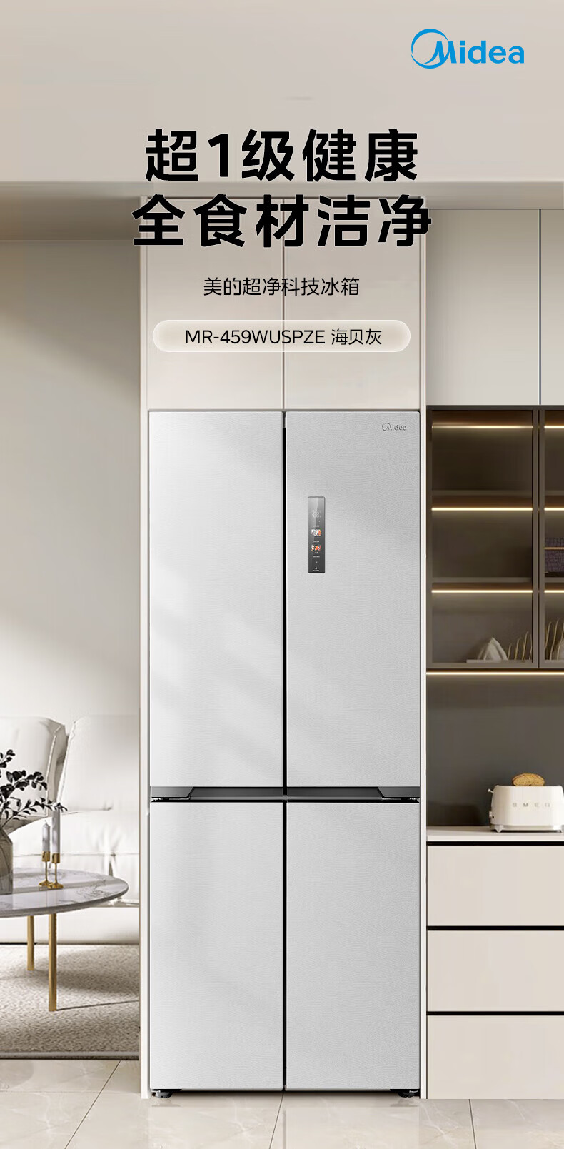 Midea Refrigerator 457 75.3cm wide 60cm ultra-thin flat embedded first-class energy efficiency air-cooled frost-free cross door four-door household odor-free large-capacity refrigerator subsidy discount 15% full space PT odor-free MR-457WUSPZE Sky Gray