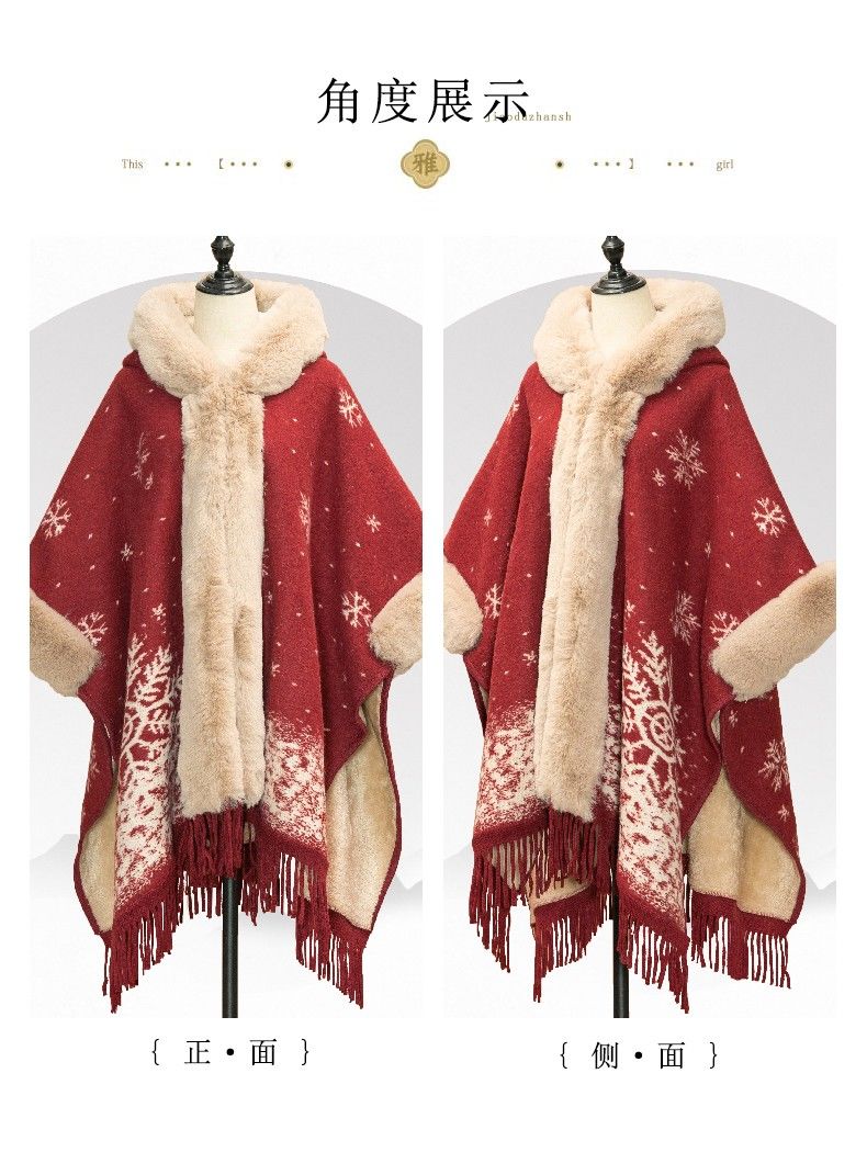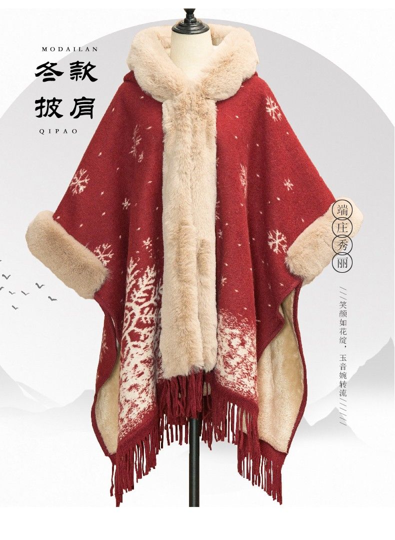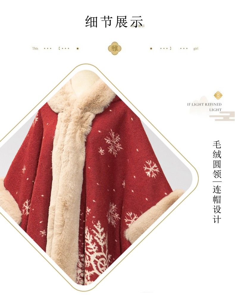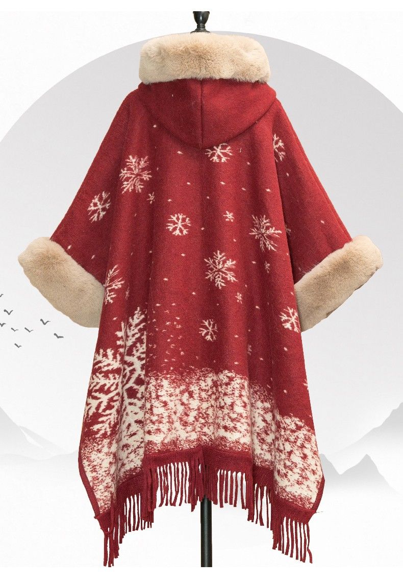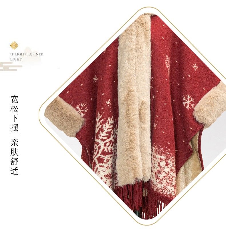 LISCN Red Christmas Cape Shawl Coat Women's Autumn and Winter New New Year Mid-Length Velvet Thickened Coat Snowflake Shawl Thickened One Size 90 Jin About 170 Jin