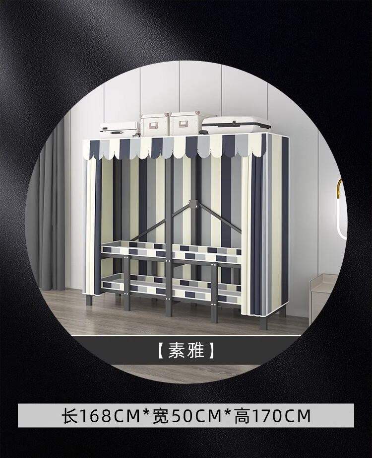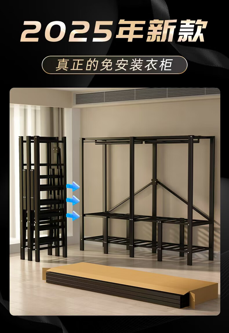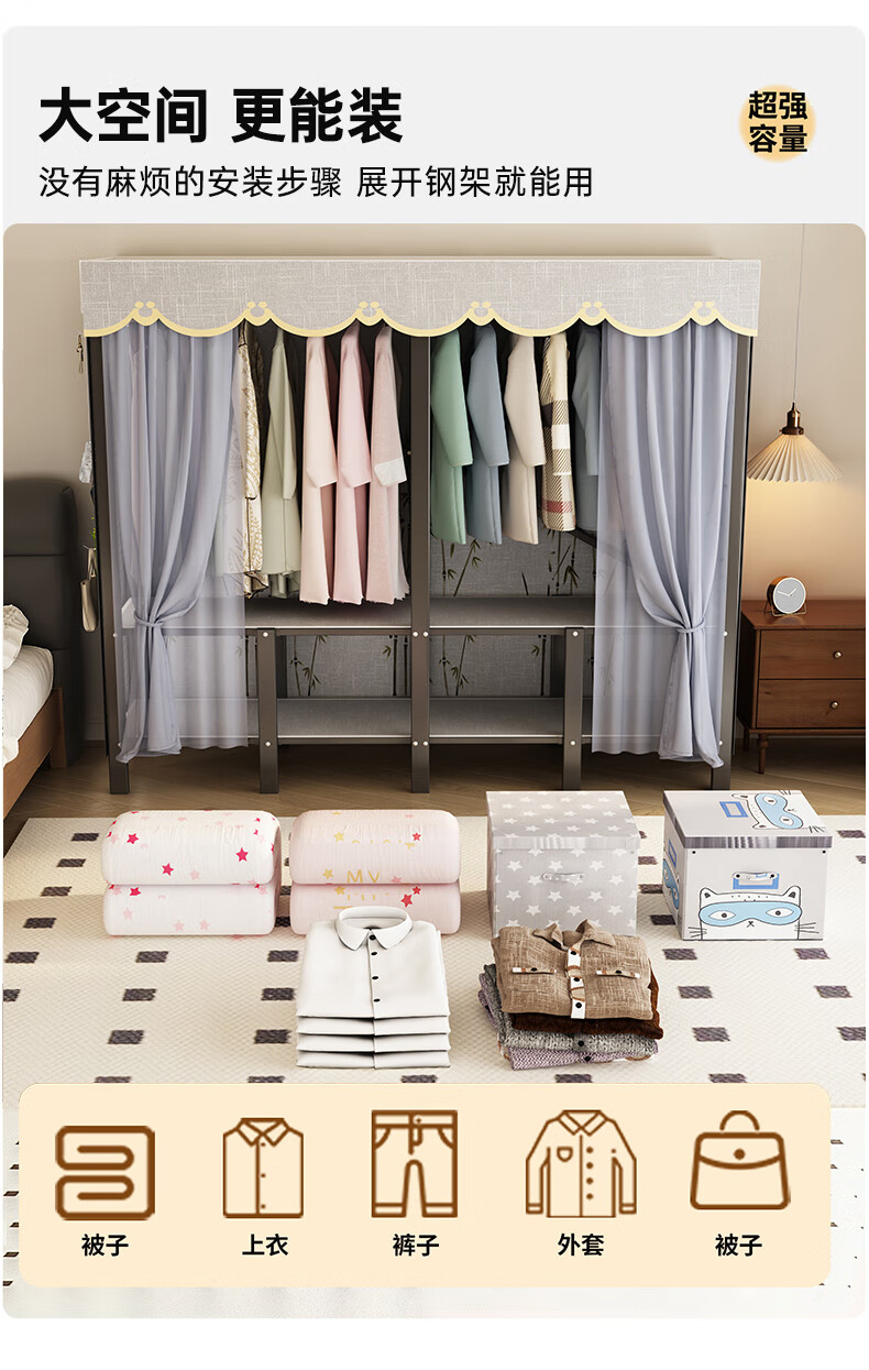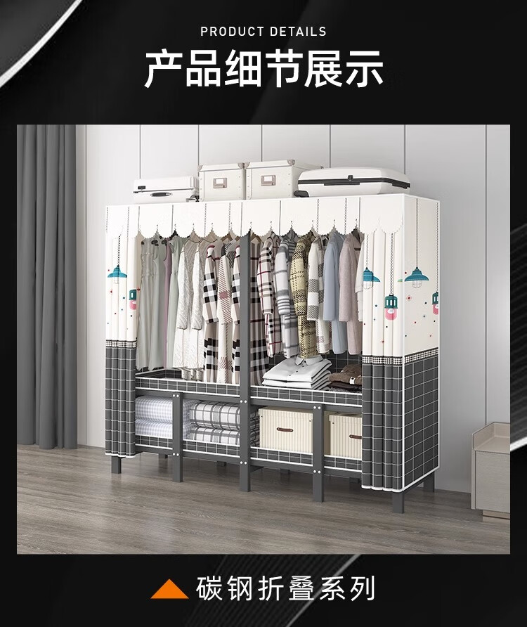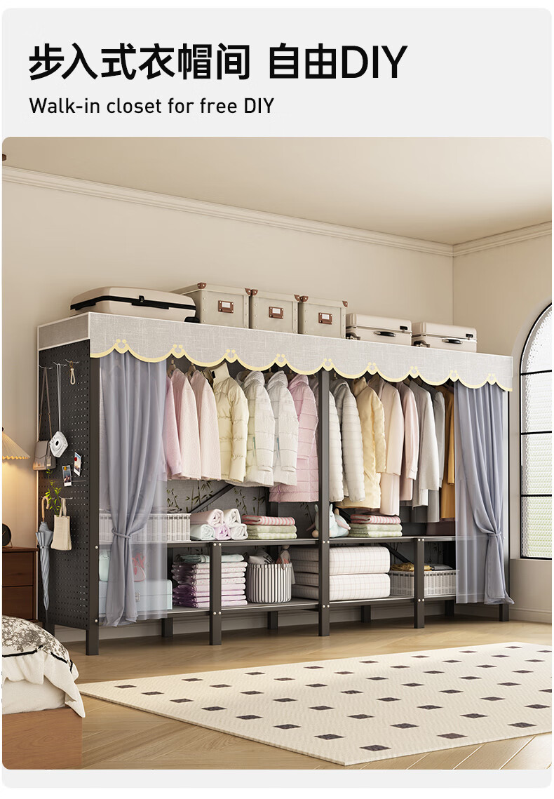 Wardrobe for home bedrooms, no installation required, folding simple fabric wardrobe, full steel frame for rental, strong and durable wardrobe, longing grid, one-piece, no installation required, length 240*width 50*height 170cm