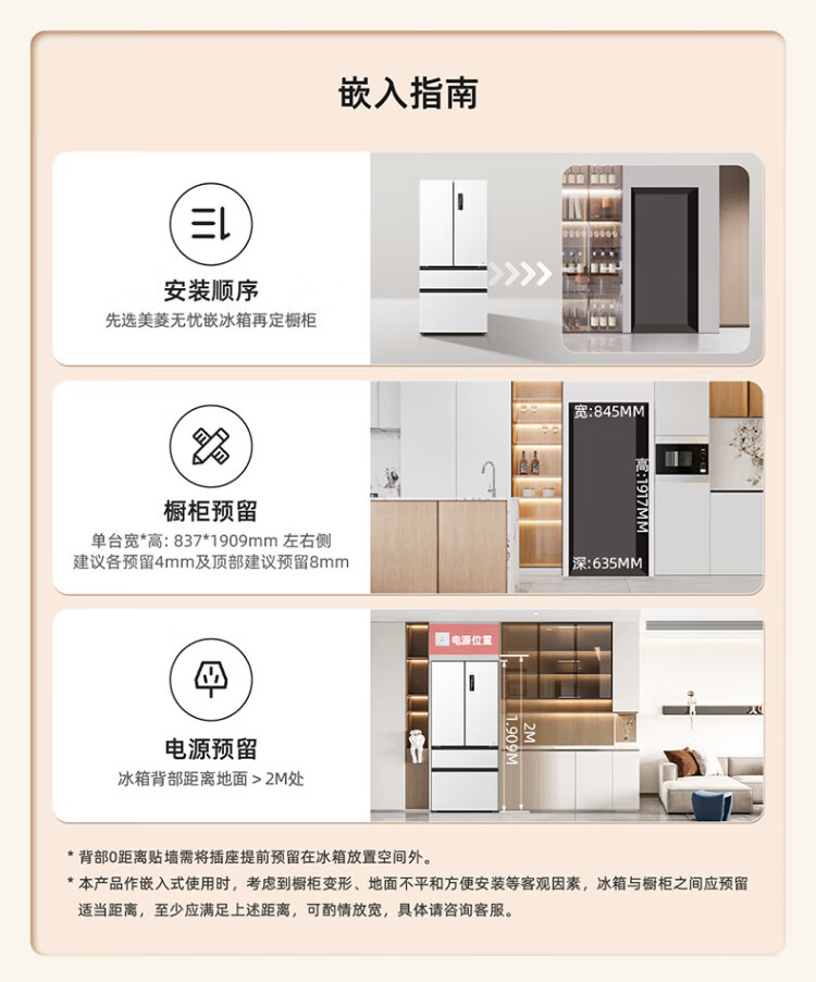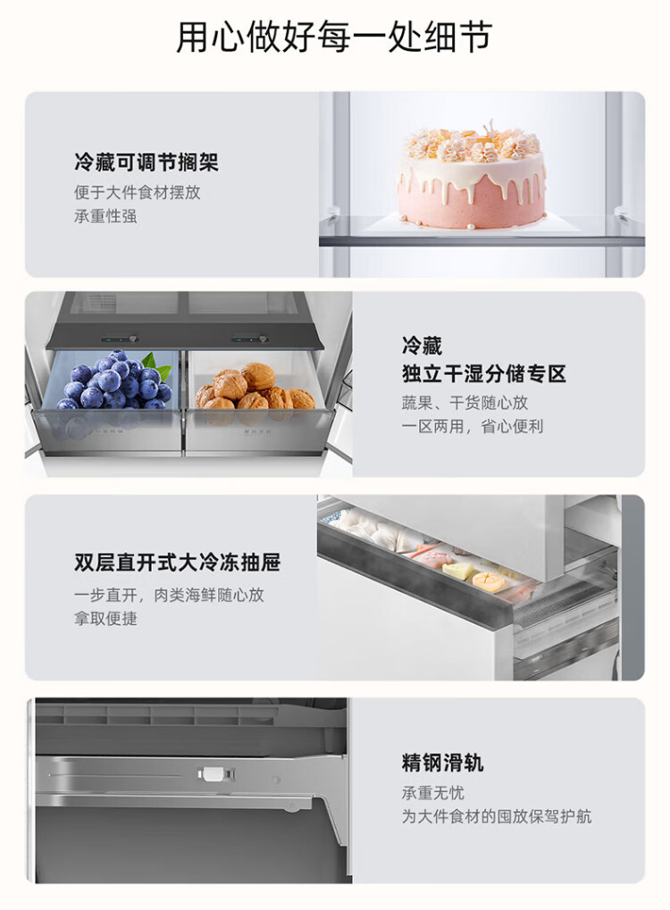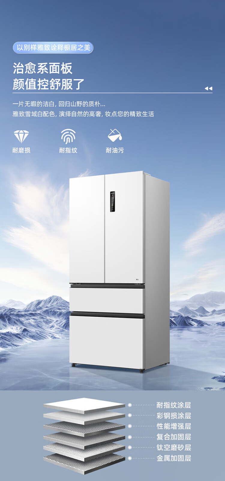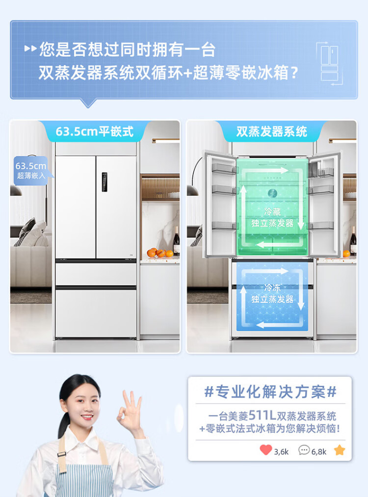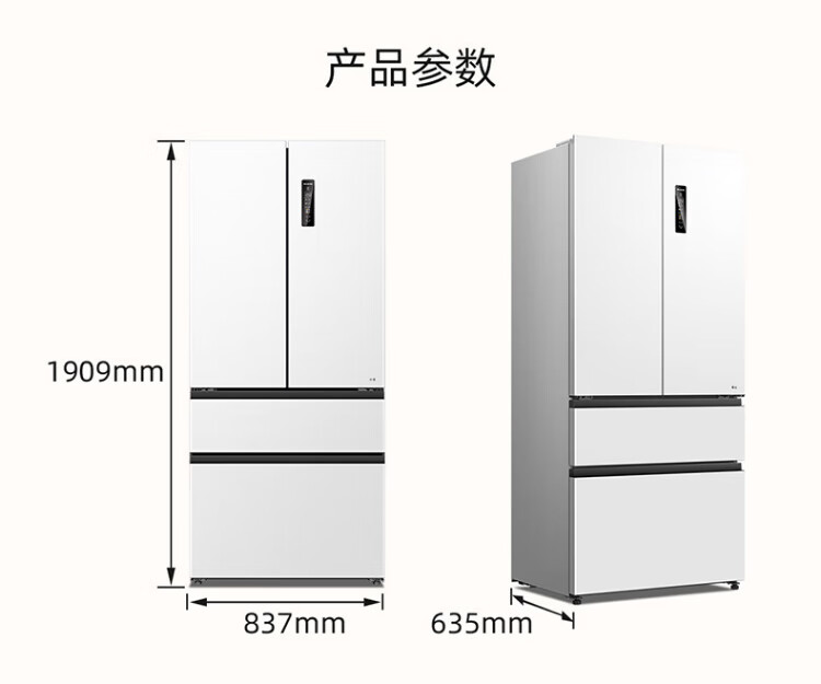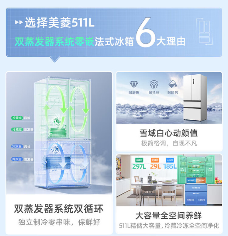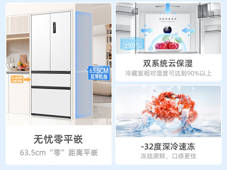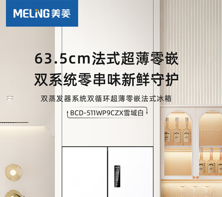 MeiLing worry-free embedded | 511 French four-door multi-door household ultra-thin zero embedded large capacity refrigerator deep 63.5cm dual system circulation air-cooled frost-free first-level energy efficiency subsidy refrigerator Wuyou embedded BCD-511WP9CZX Snowy White