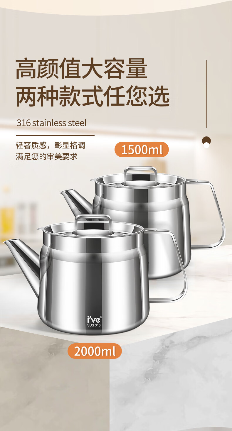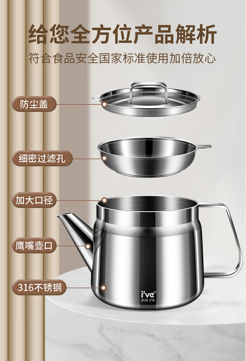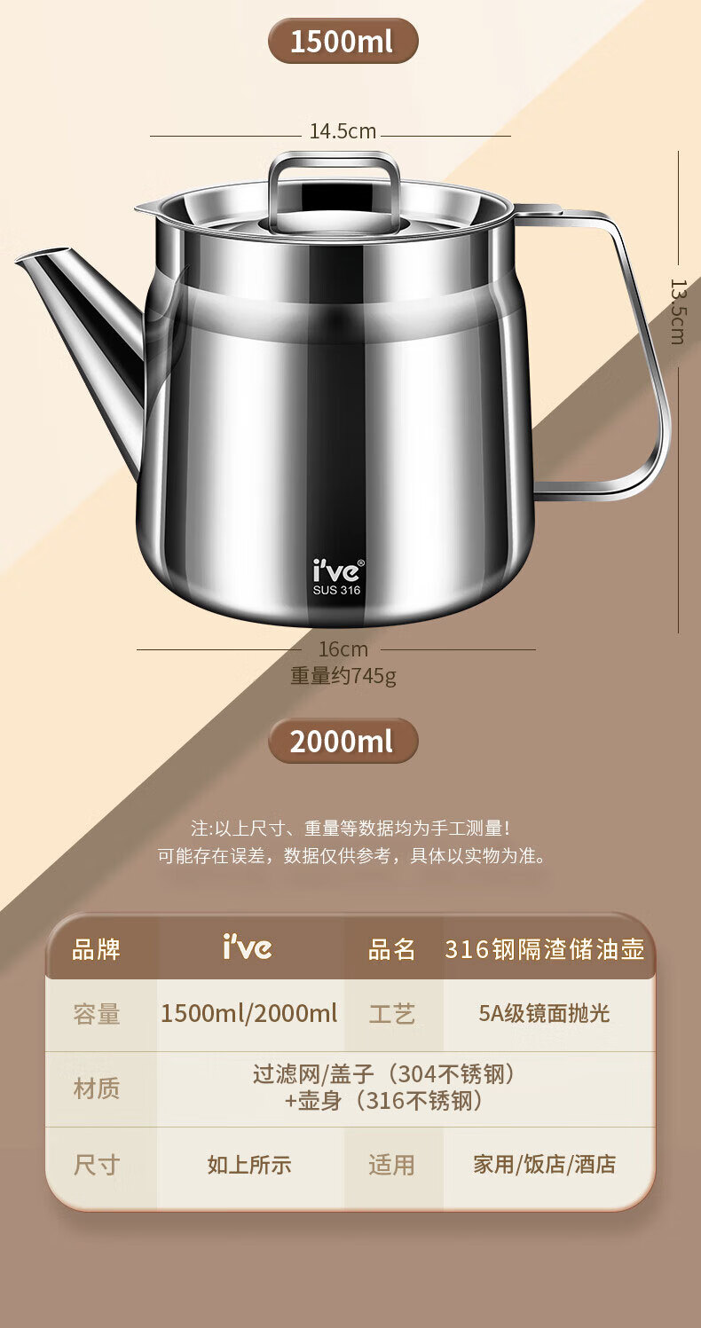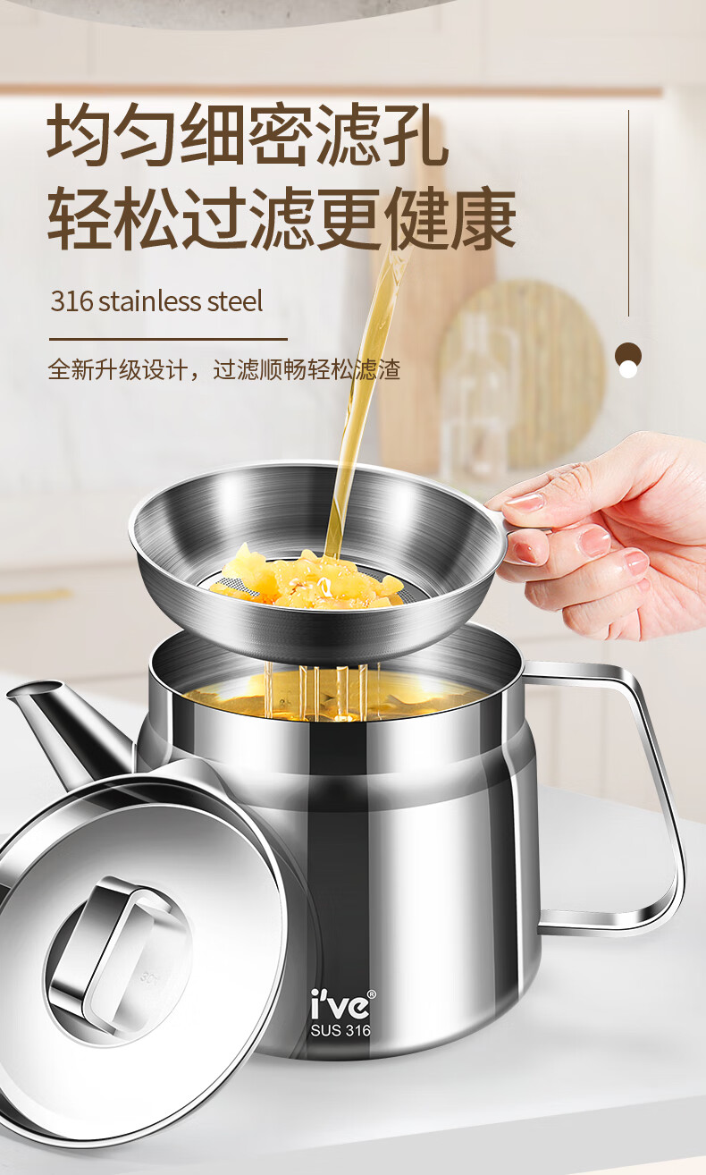I VE Germany 316 stainless steel oil kettle filter oil kettle large capacity household filter oil residue anti-leakage oil storage kettle 1500ml small 316 stainless steel oil filter kettle