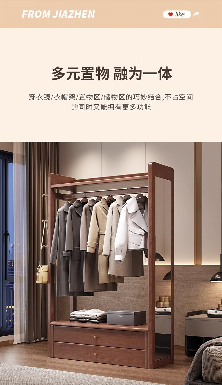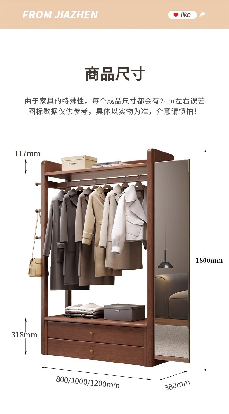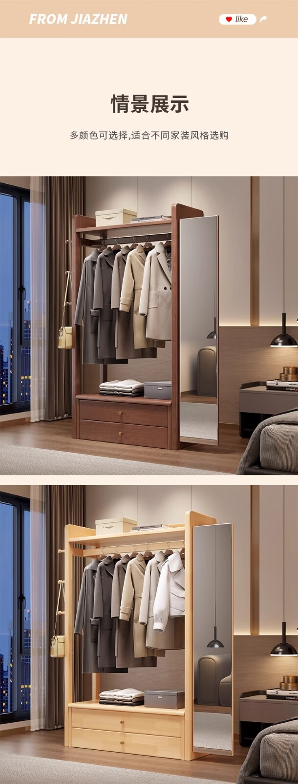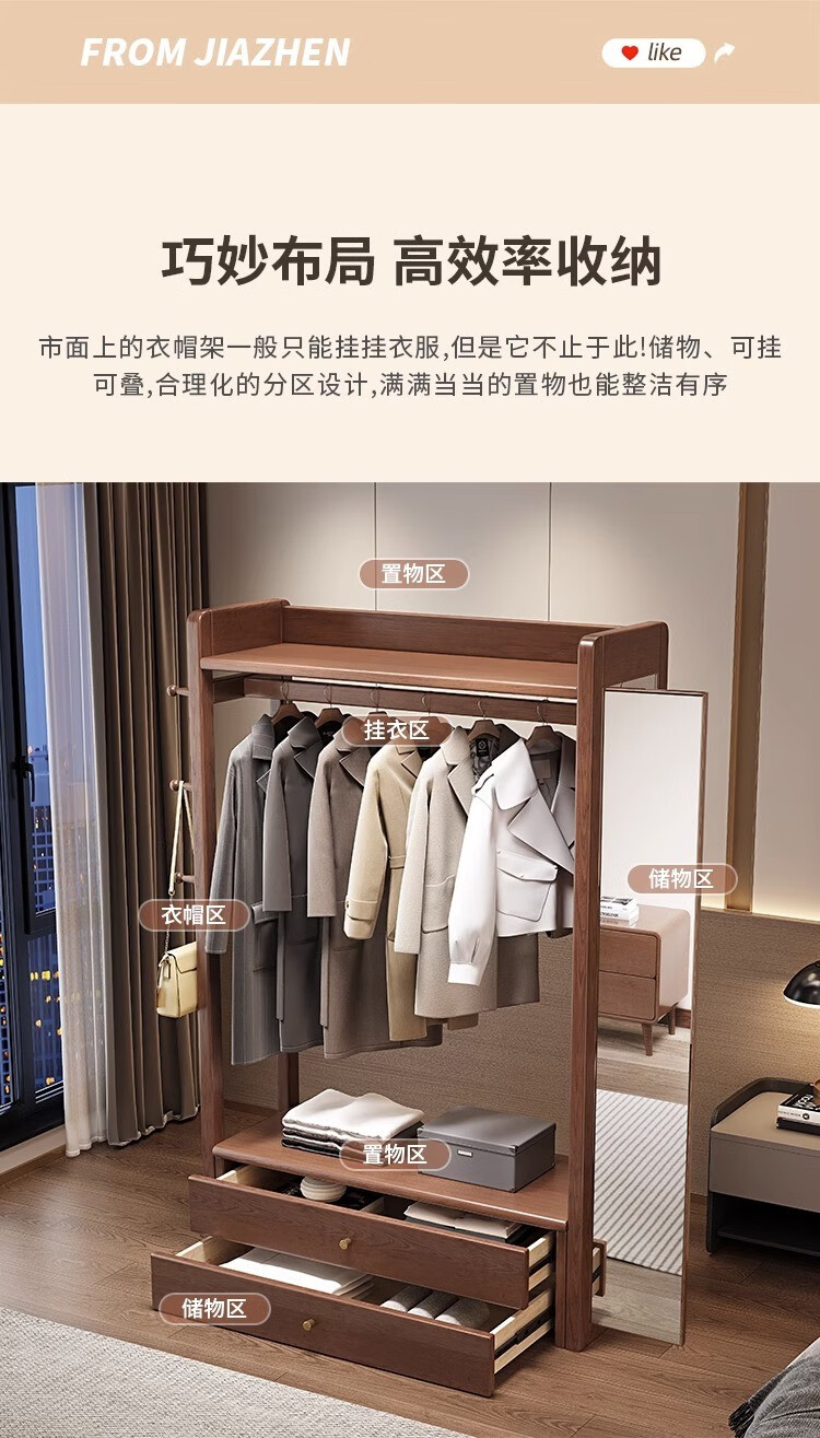 Shaochengke coat rack floor-standing household solid wood coat rack dressing mirror combination living room bedroom multi-functional fitting mirror storage rack walnut color-120cm (installation included)