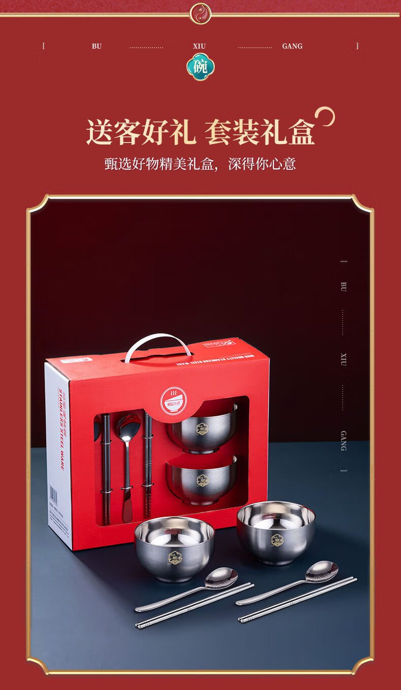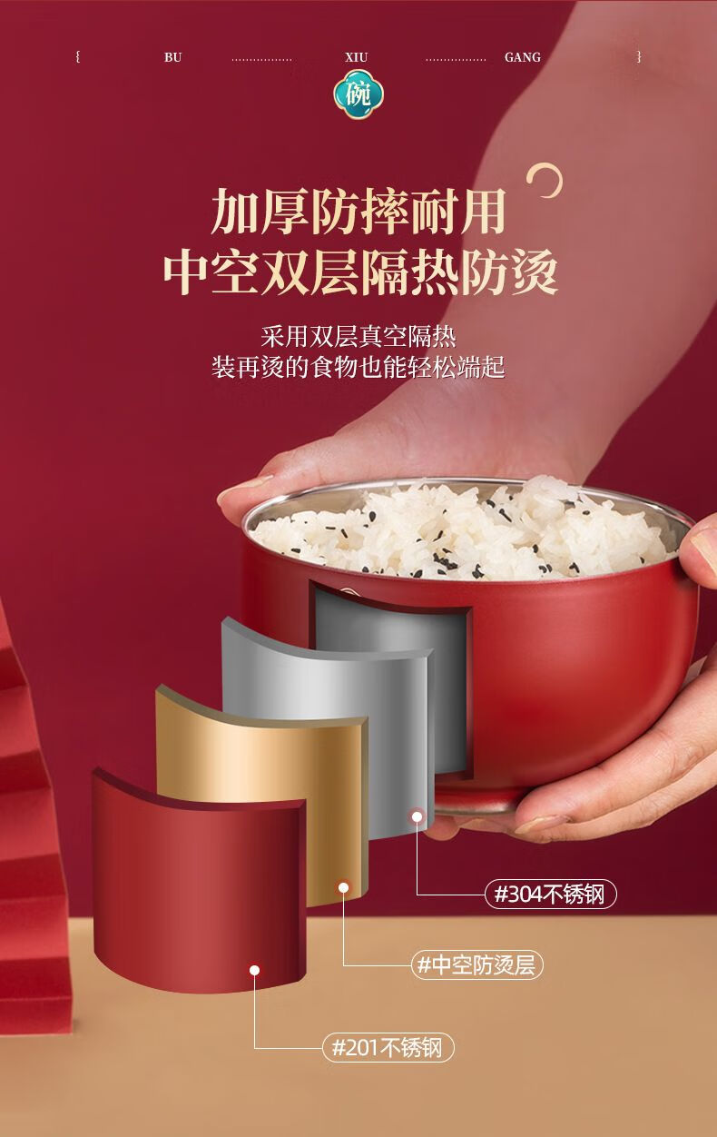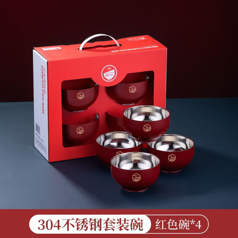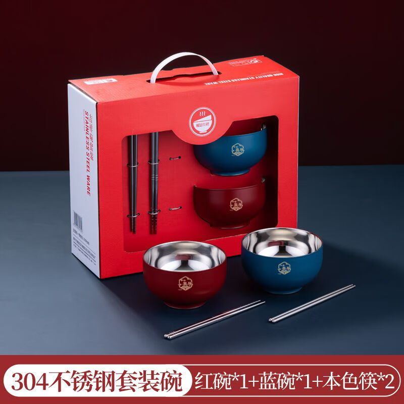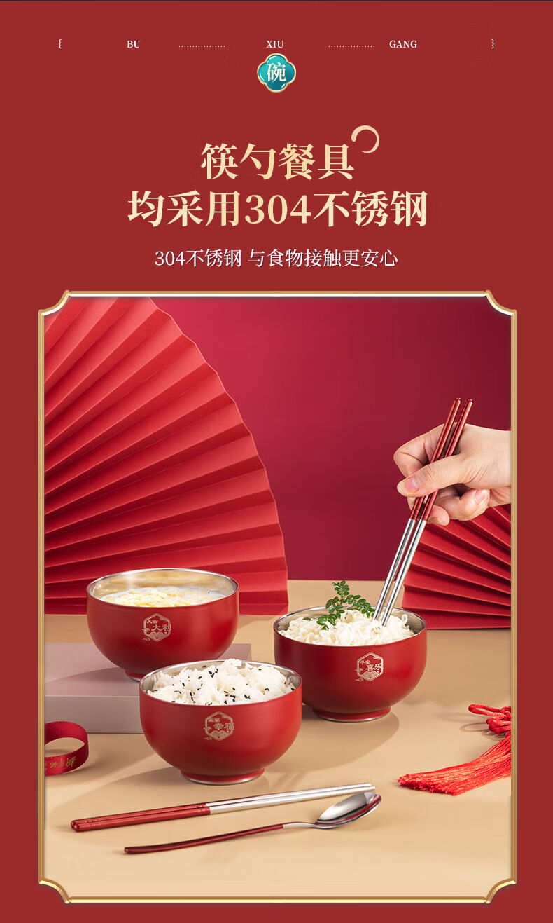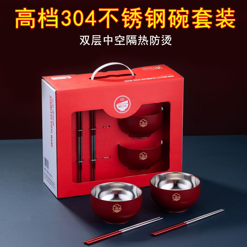 High-end Chinese red 304 stainless steel bowl and chopsticks set, double layer anti-scalding and thickened, red bowl and chopsticks for the full moon, wedding celebration, 2 red bowls + 2 pairs of red chopsticks + 2 red spoons, 6 heads