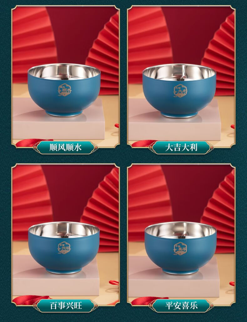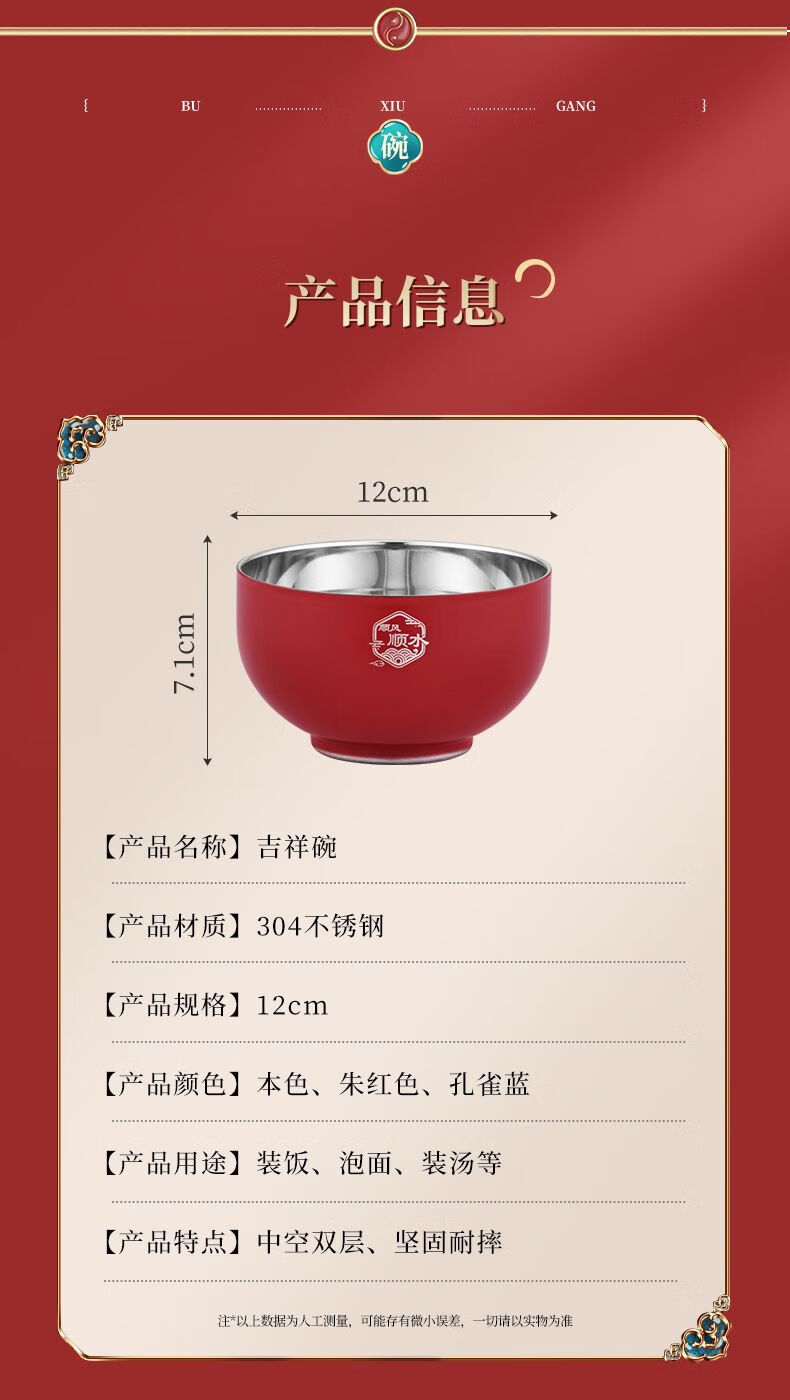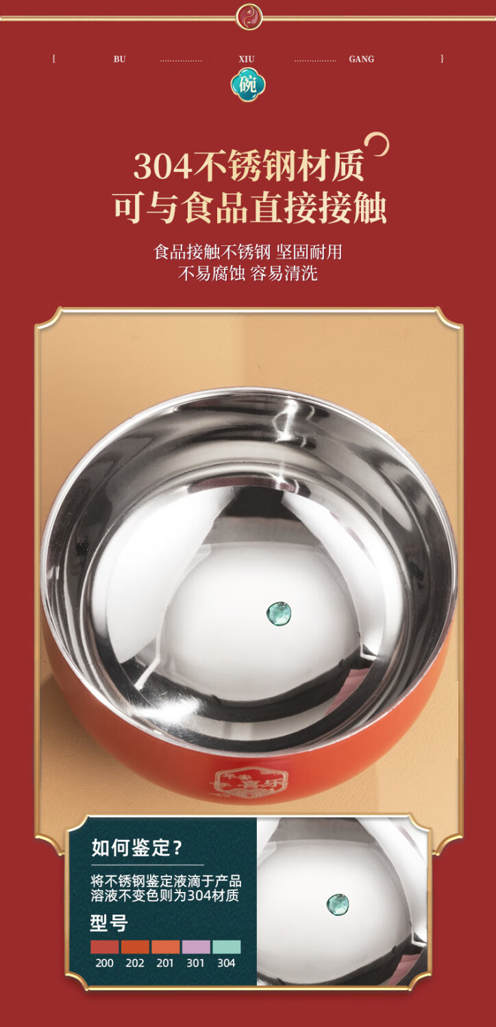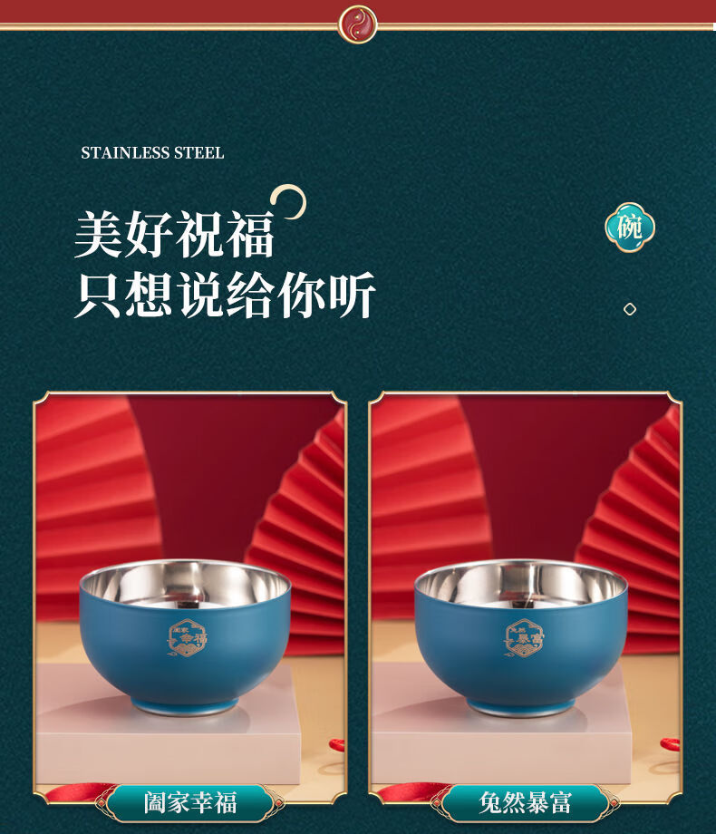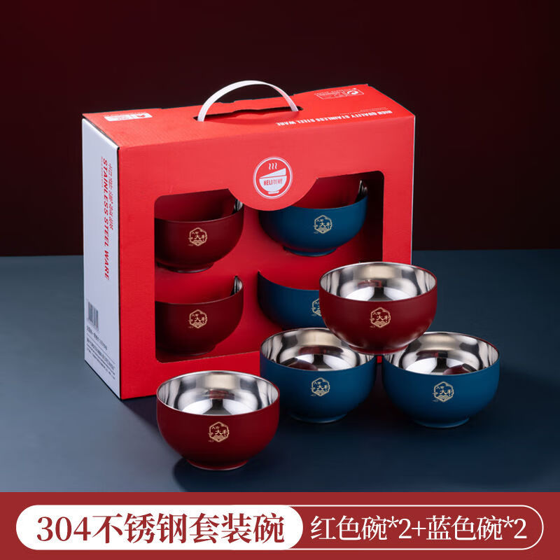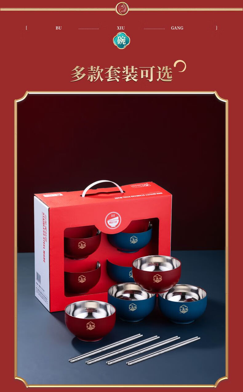 High-end Chinese red 304 stainless steel bowl and chopsticks set, double layer anti-scalding and thickened, red bowl and chopsticks for the full moon, wedding celebration, 2 red bowls + 2 pairs of red chopsticks + 2 red spoons, 6 heads