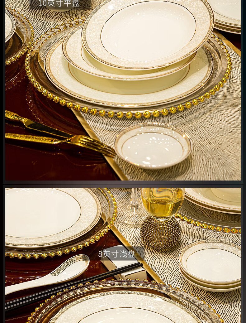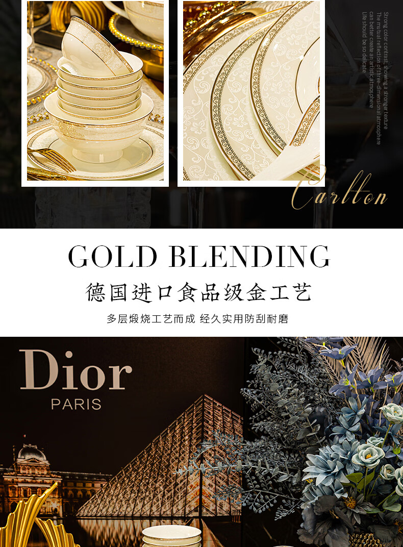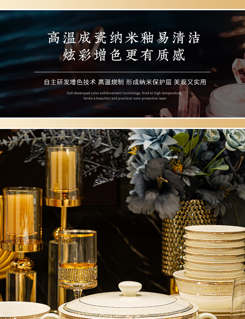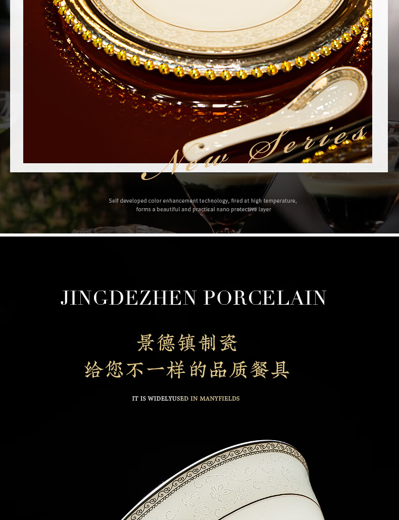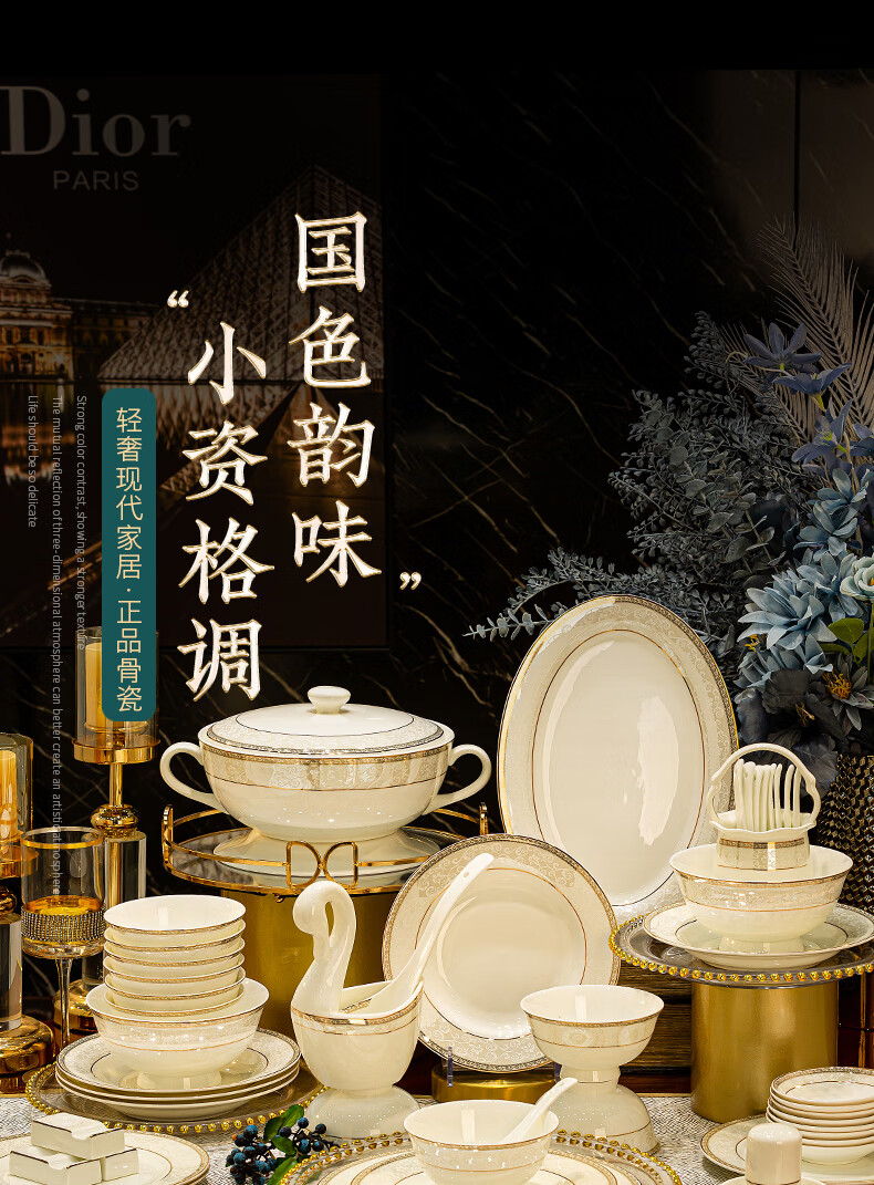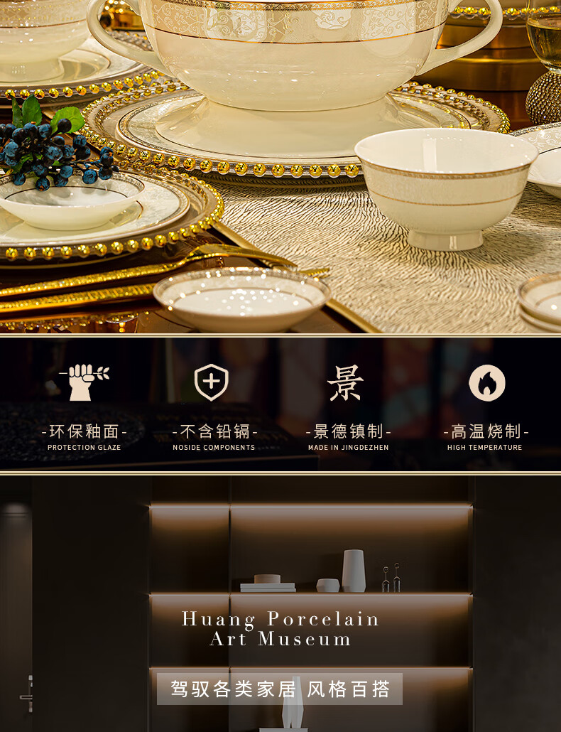 Jingqiu high temperature underglaze color bowl and plate set household European style Jingdezhen high-end bone china tableware complete set of bowl and plate set for housewarming underglaze color small qualification transfer 10 people suitcase 60 pieces