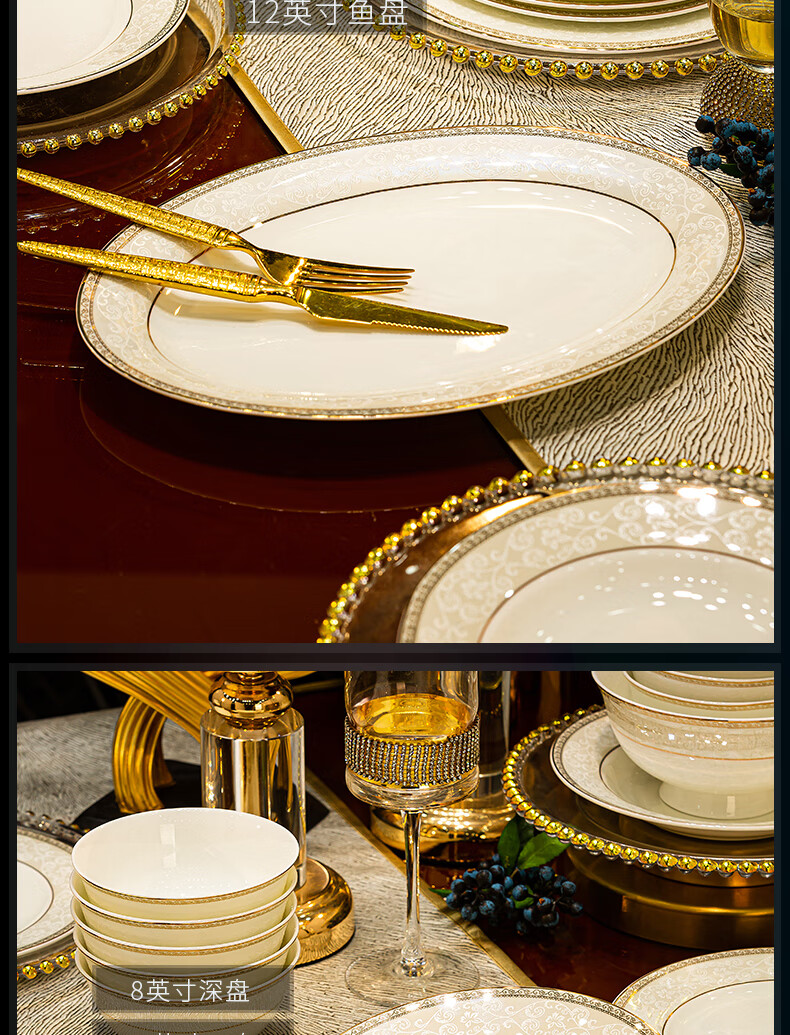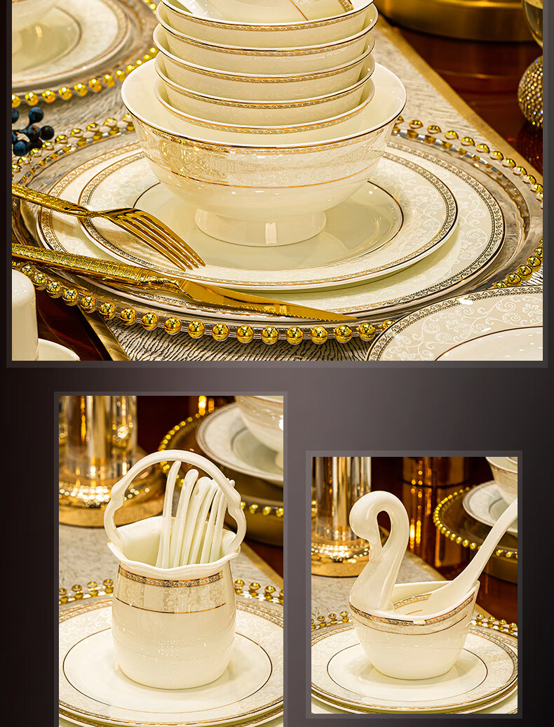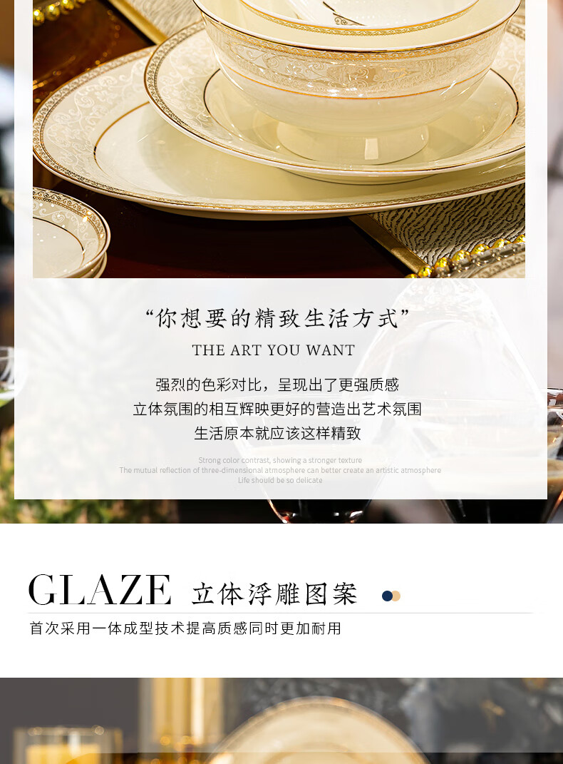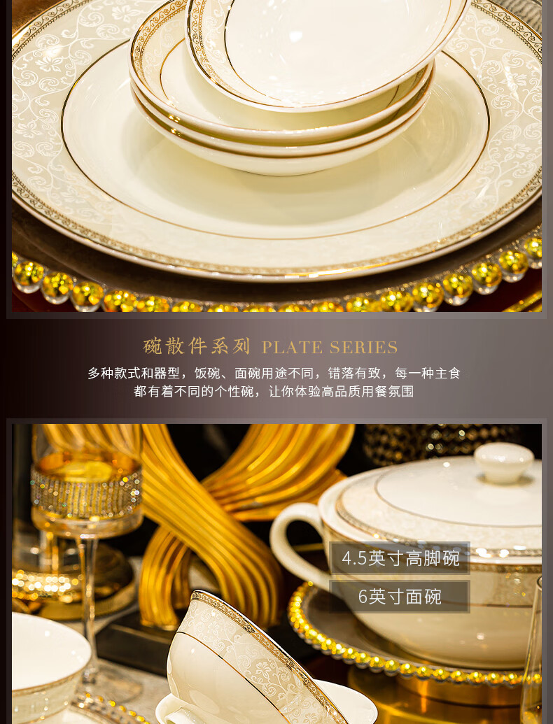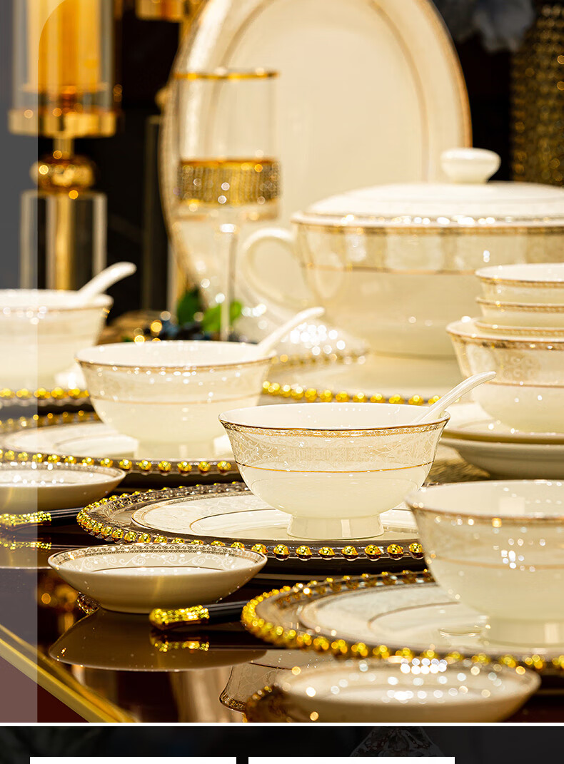 Jingqiu high temperature underglaze color bowl and plate set household European style Jingdezhen high-end bone china tableware complete set of bowl and plate set for housewarming underglaze color small qualification transfer 10 people suitcase 60 pieces