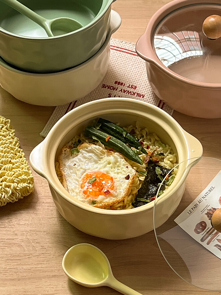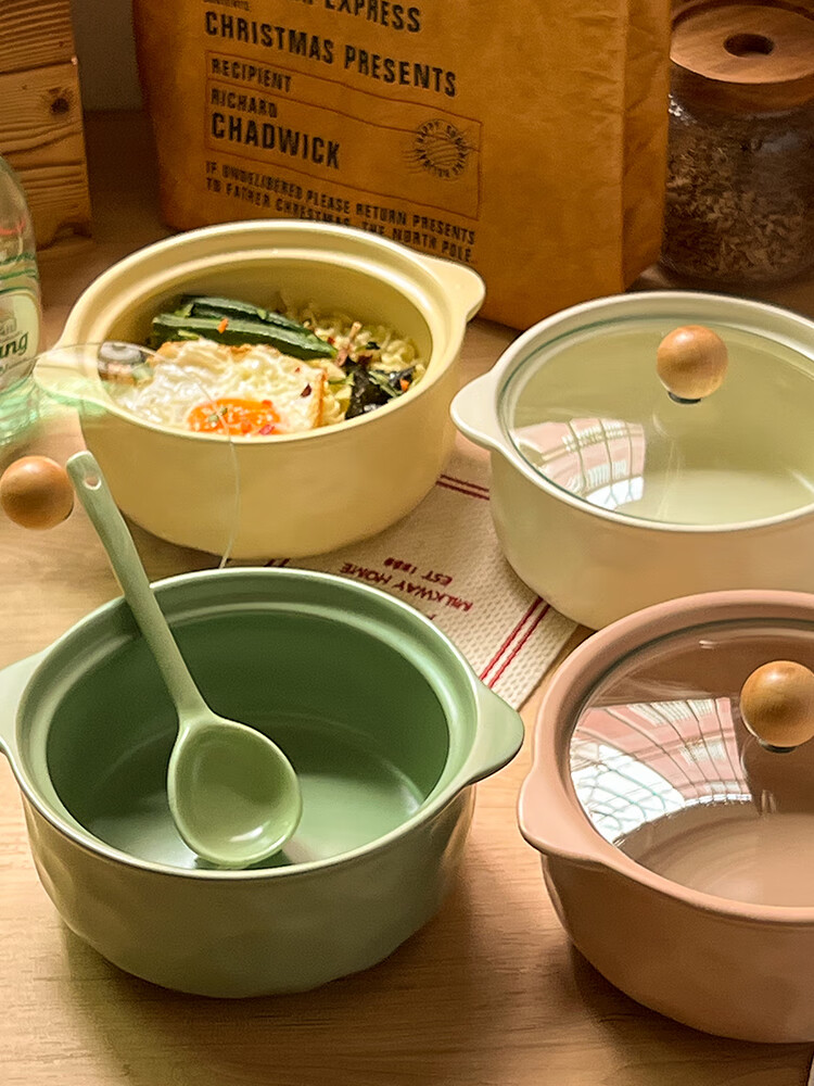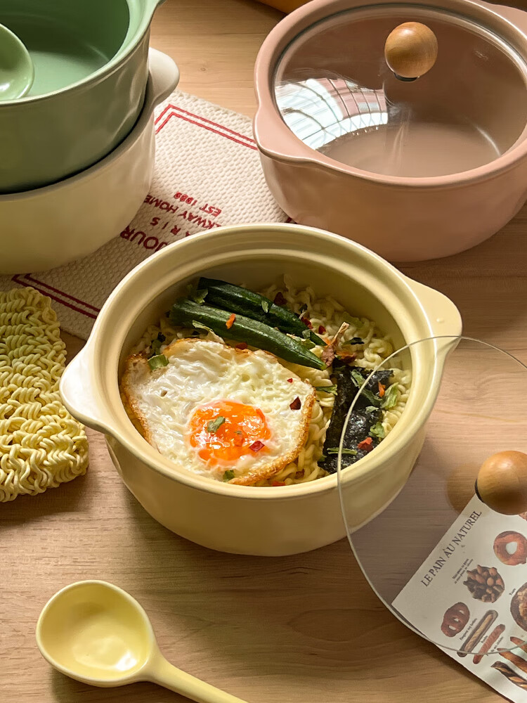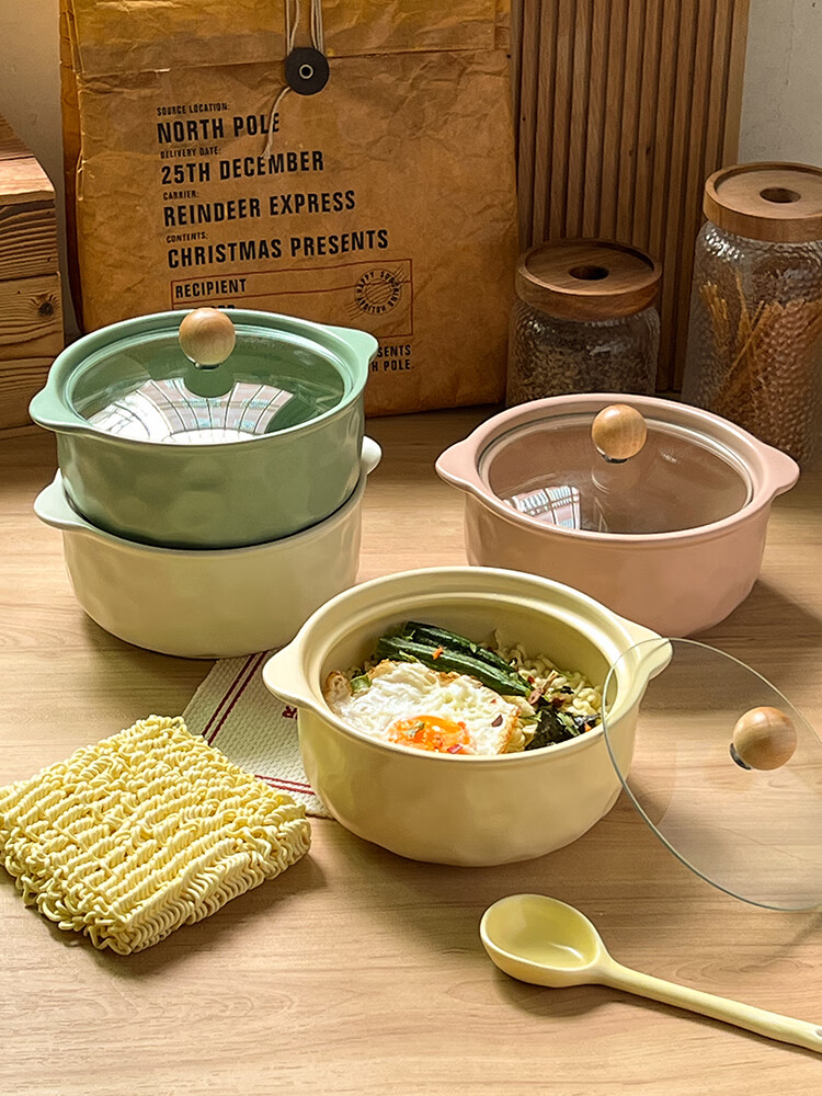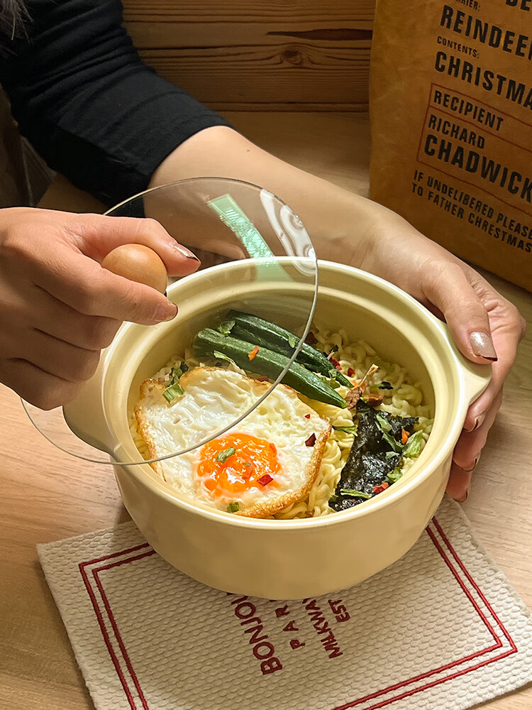 Persson (CERAMICS) cream-style double-eared bowl ceramic instant noodle bowl with lid for snail noodles student dormitory large soup bowl for one person at home double-eared bowl with lid (cream yellow)