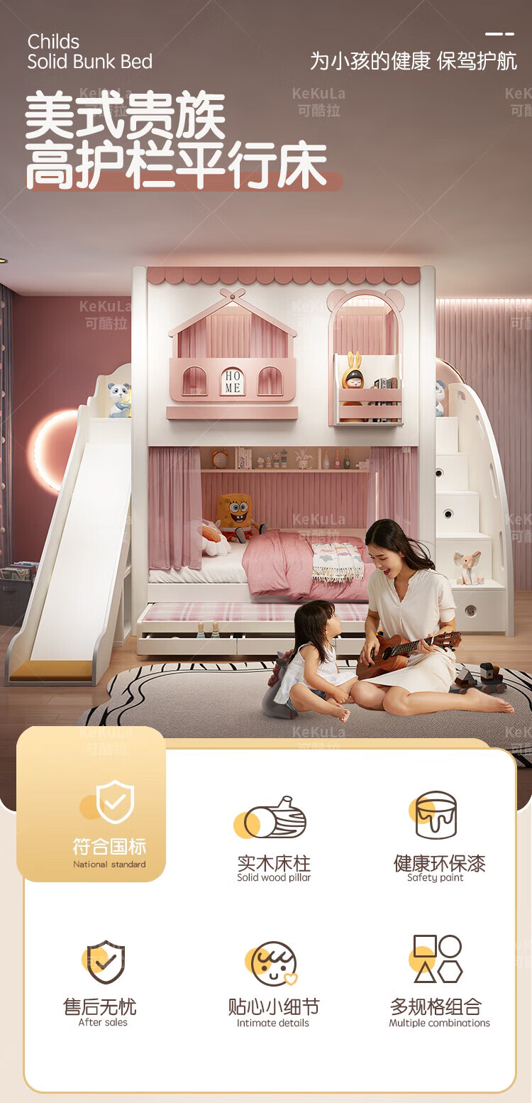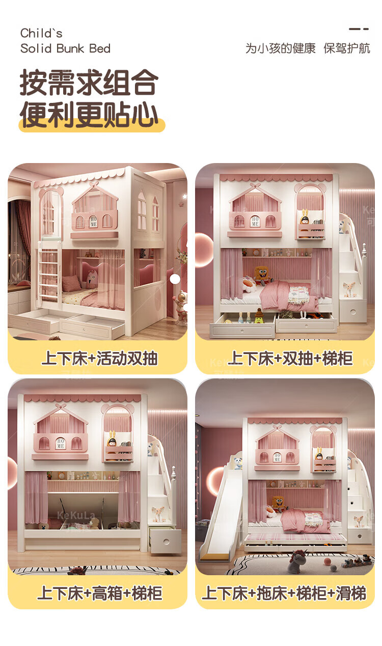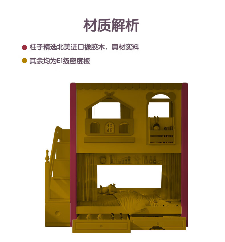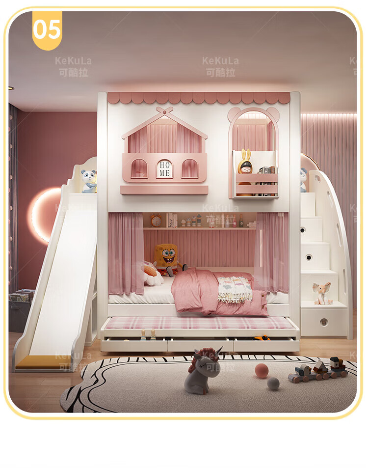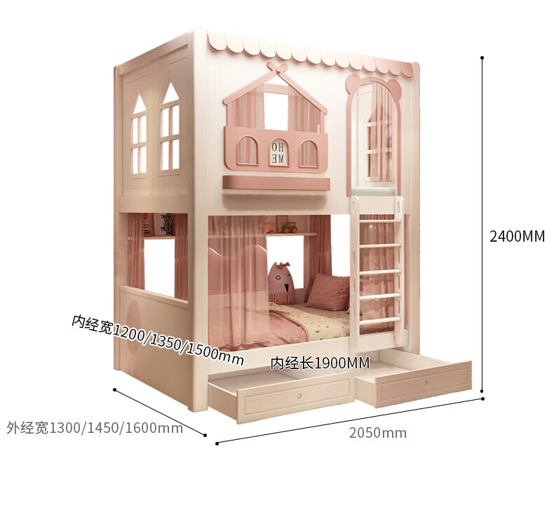 Funager children's bed and bunk bed, two-story tree house, mother bed, same width as upper and lower, princess high guardrail boy and girl bed, high and low bed + ladder cabinet 1.5*1.9 meters (same width as upper and lower)