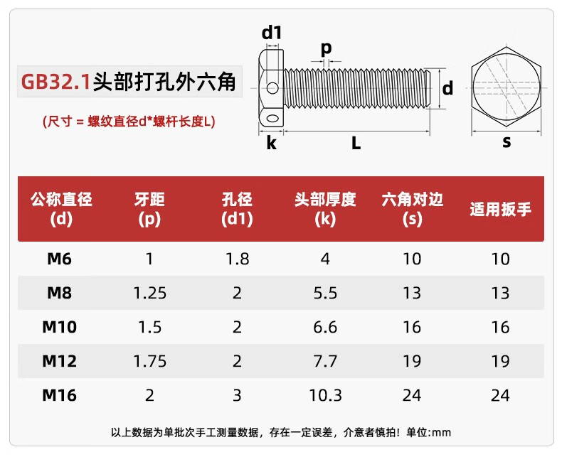 Fengji M6-M16 304 stainless steel tail with hole external hexagonal screw GB31.1 screw with hole shaft punching bolt M8*40 2 pcs
